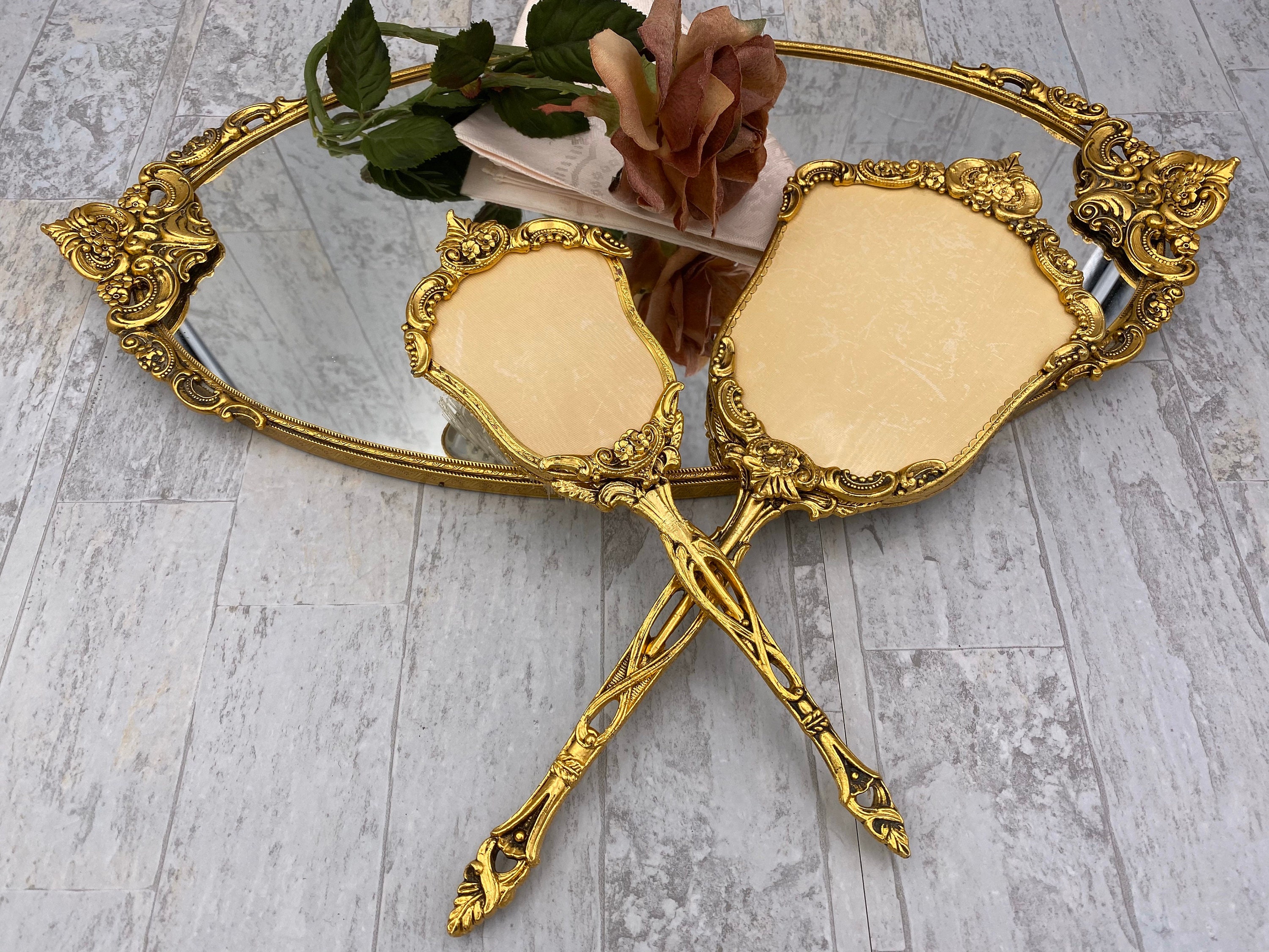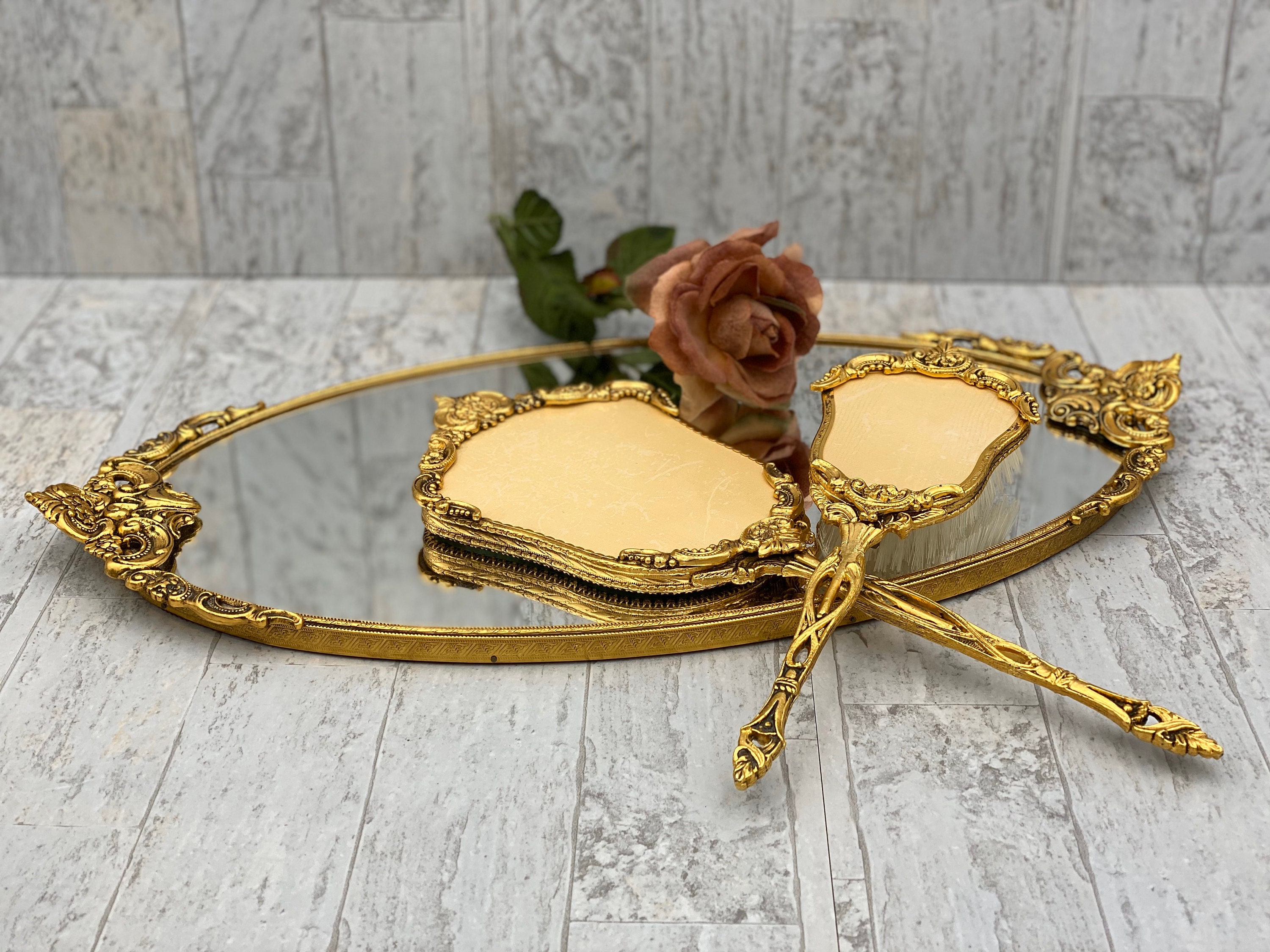 This is a lovely Vintage Vanity Set with Gold Ormolu Vanity Mirror, matching Hand Mirror and Brush. This set is plated in elegant Gold. All matching pieces of the Vanity Set are decorated in ornate Ormolu and Golden Filigree. Gorgeous!