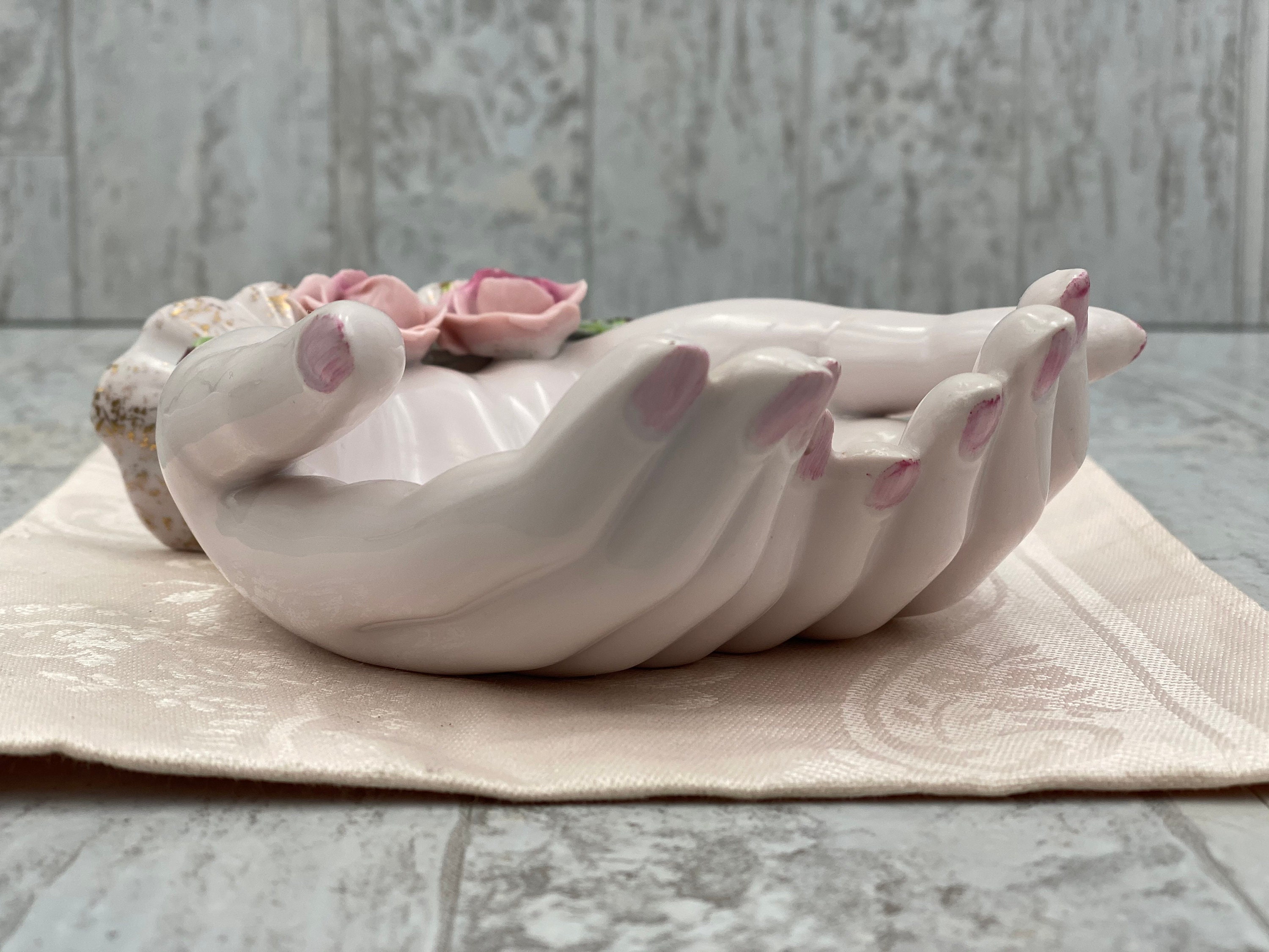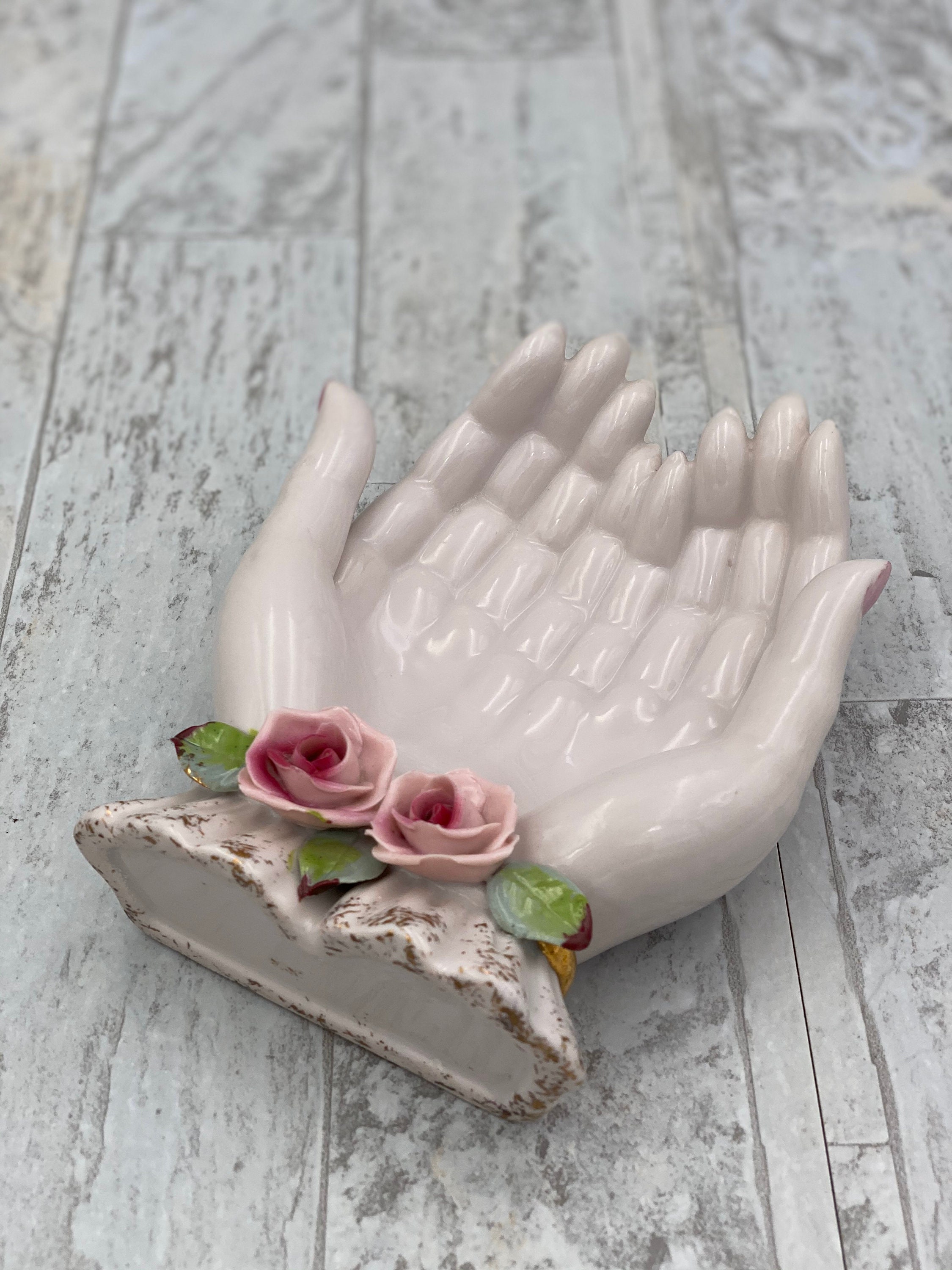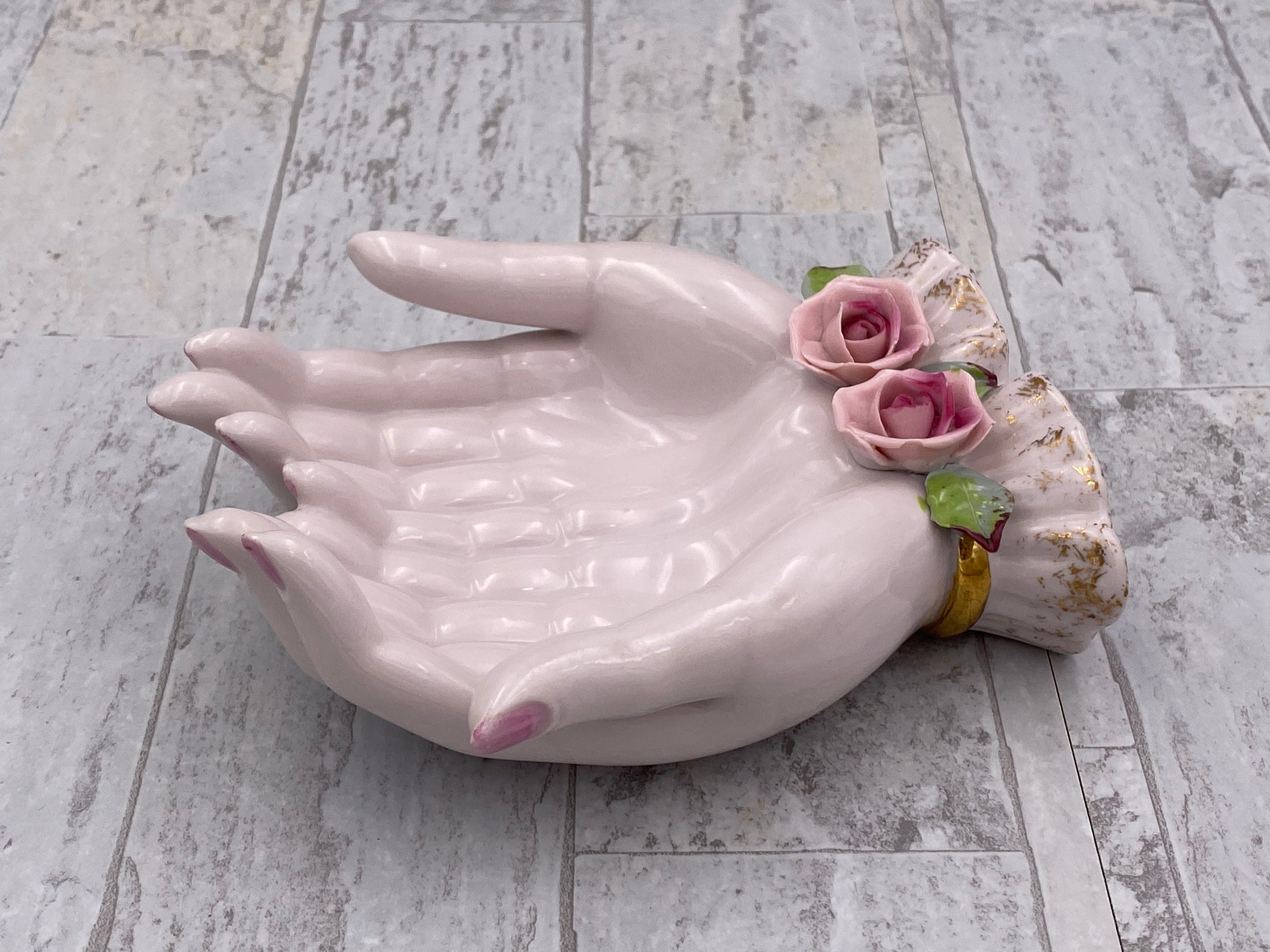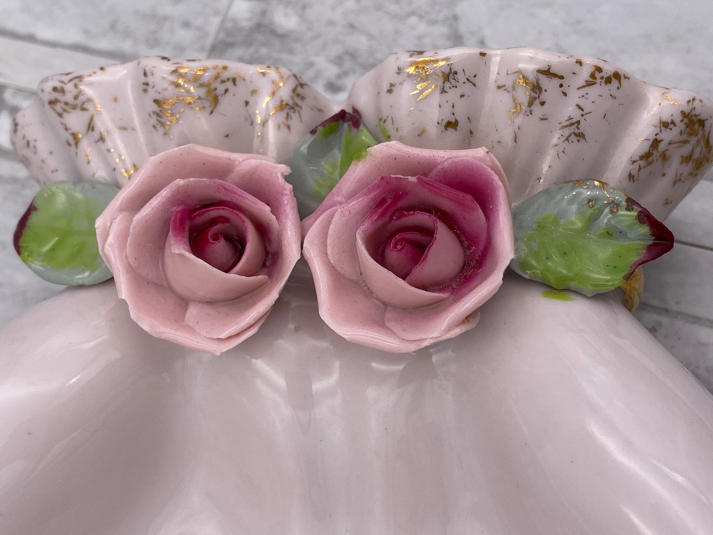 A Vintage Pink Porcelain open hands Trinket tray. This beautiful tray is trimmed in Gold with Lovely classic Roses applied for decoration.