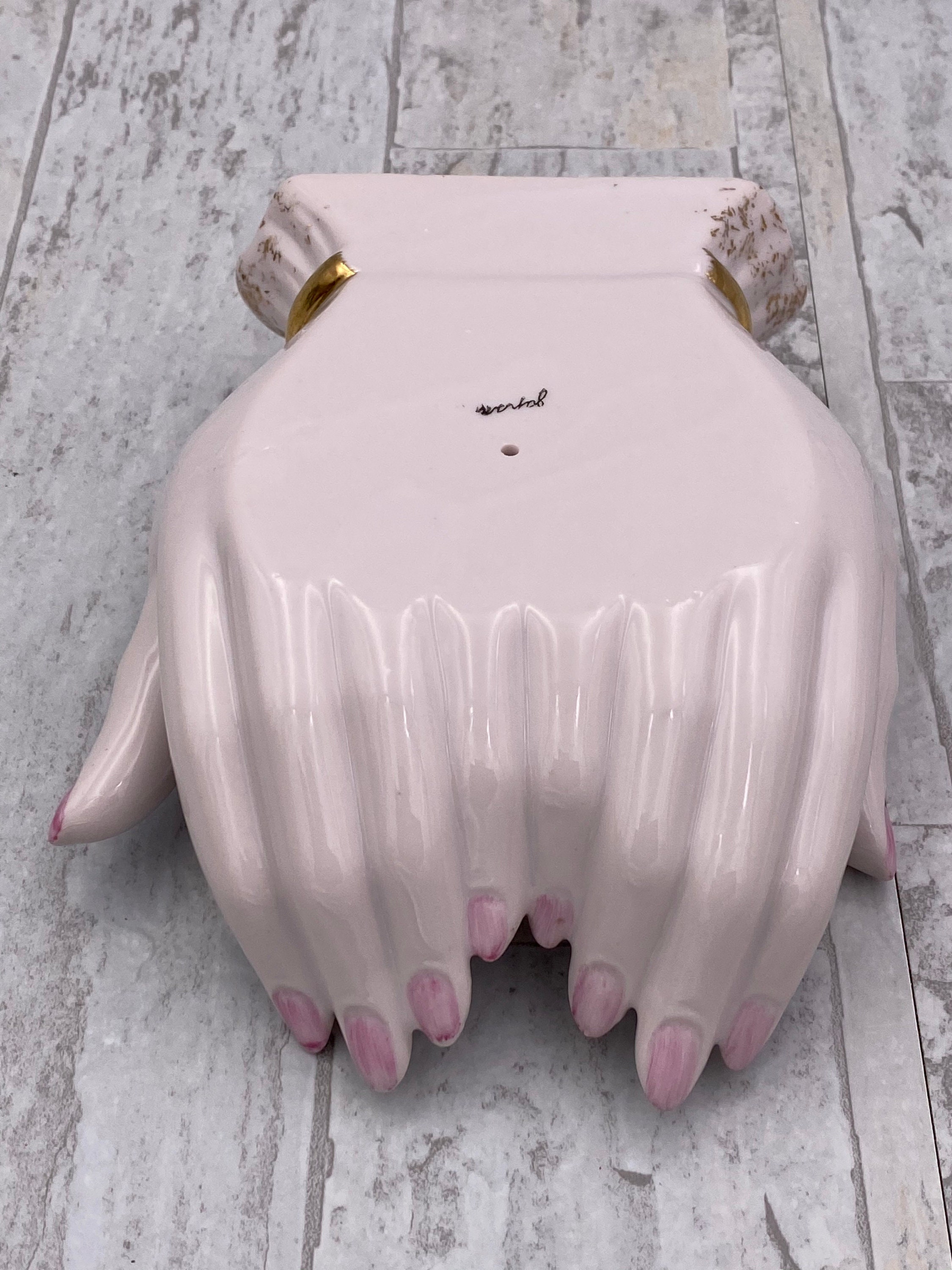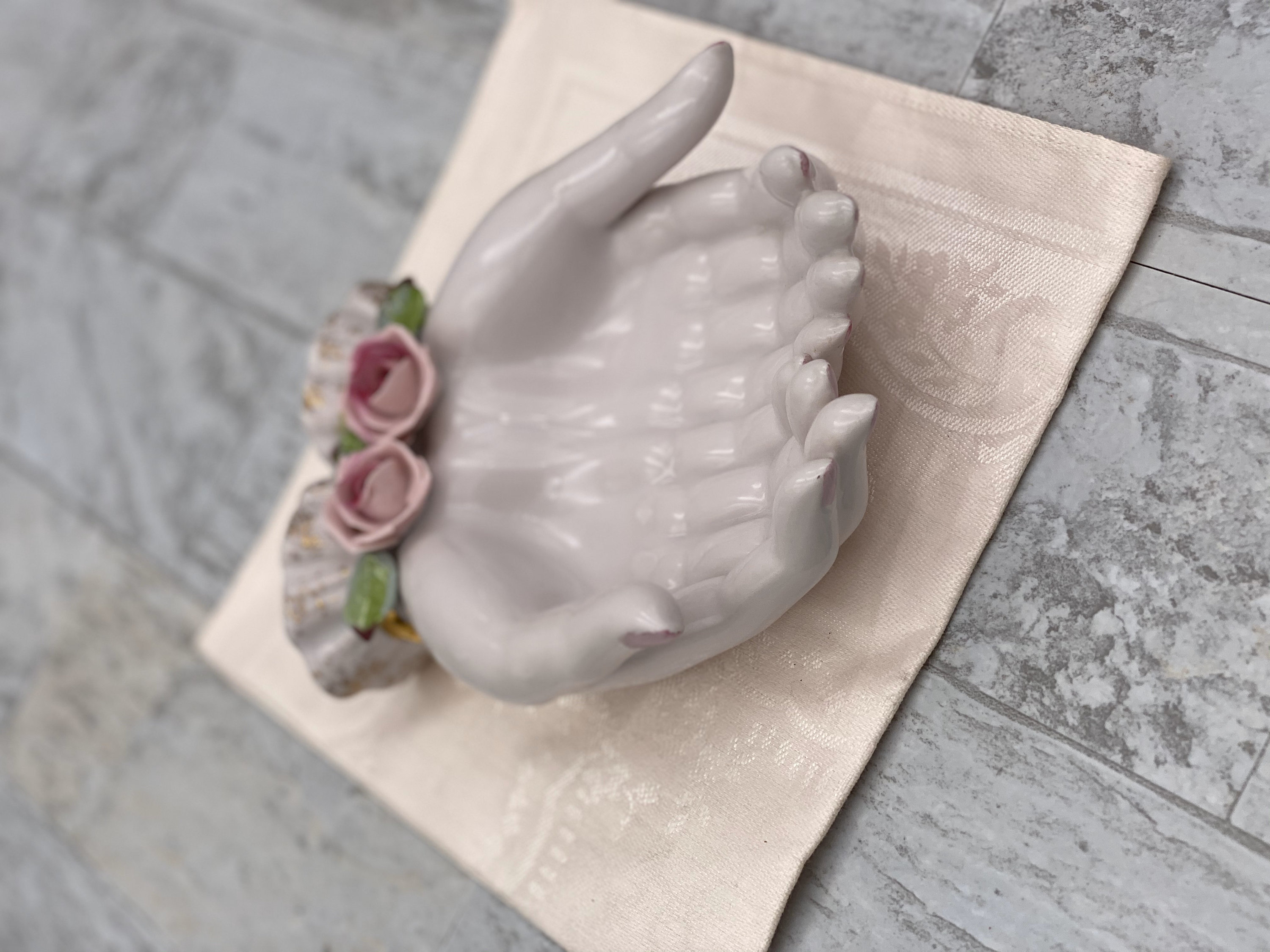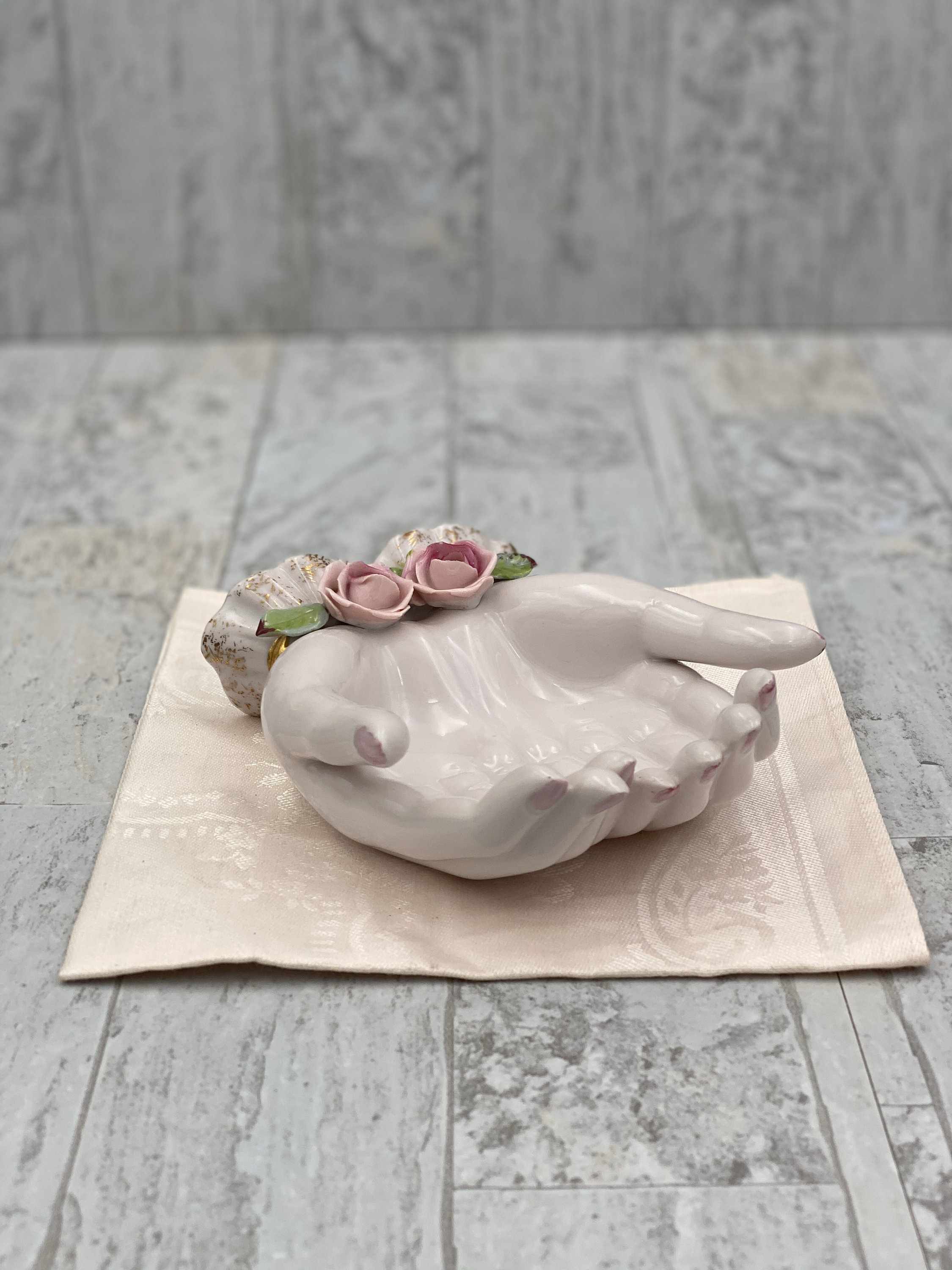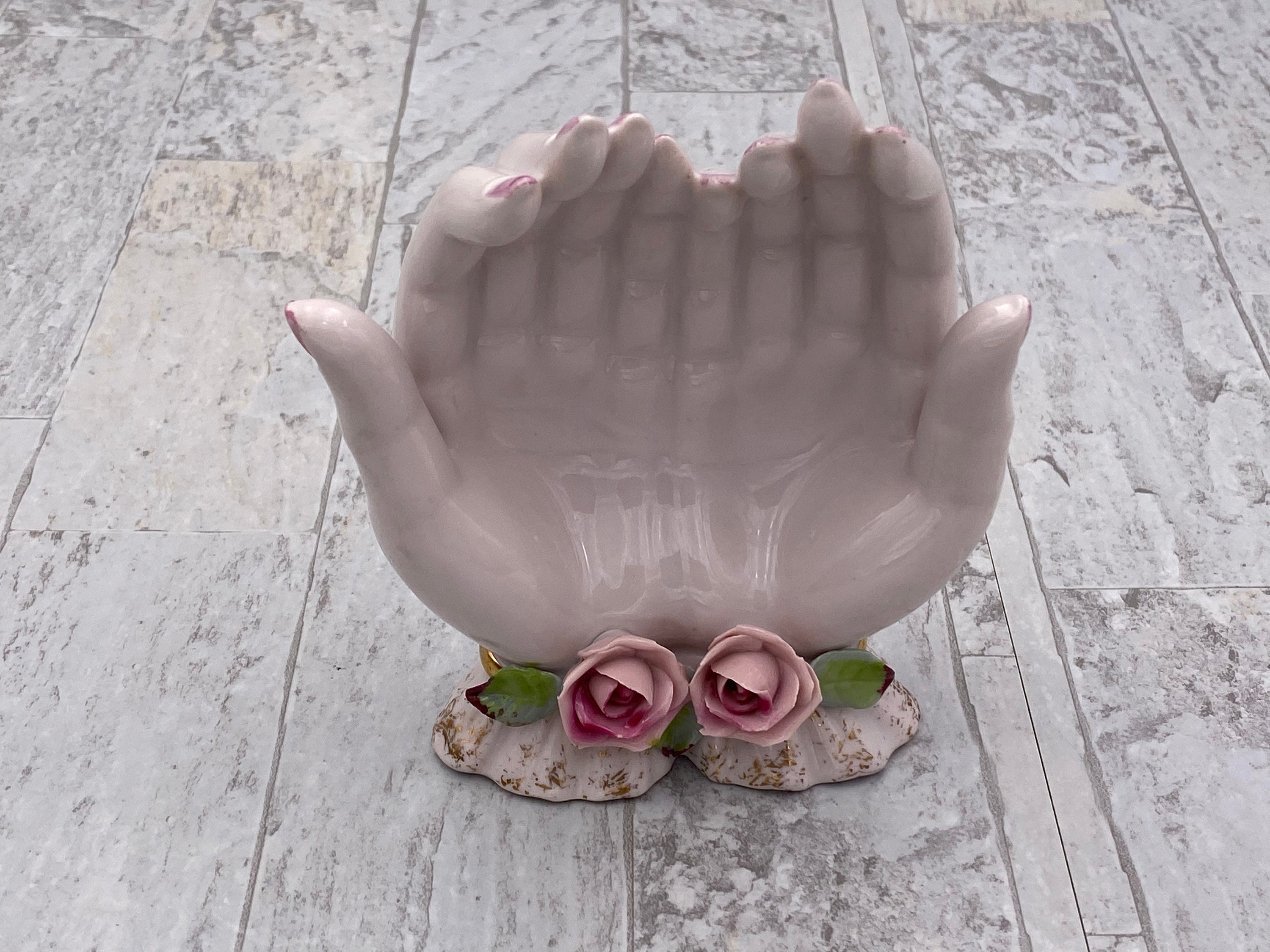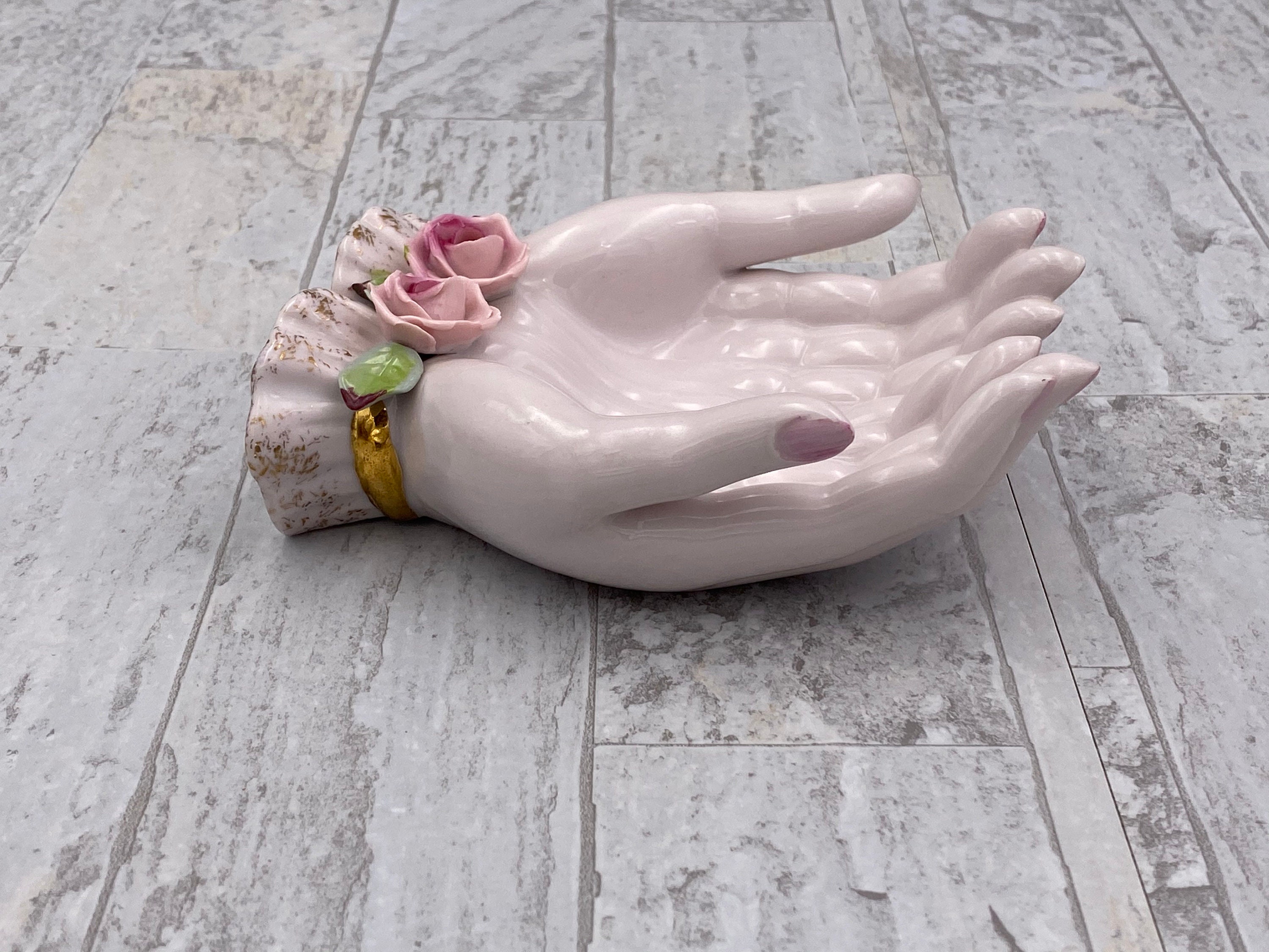 A Vintage Pink Porcelain open hands Trinket tray. This beautiful tray is trimmed in Gold with Lovely classic Roses applied for decoration.