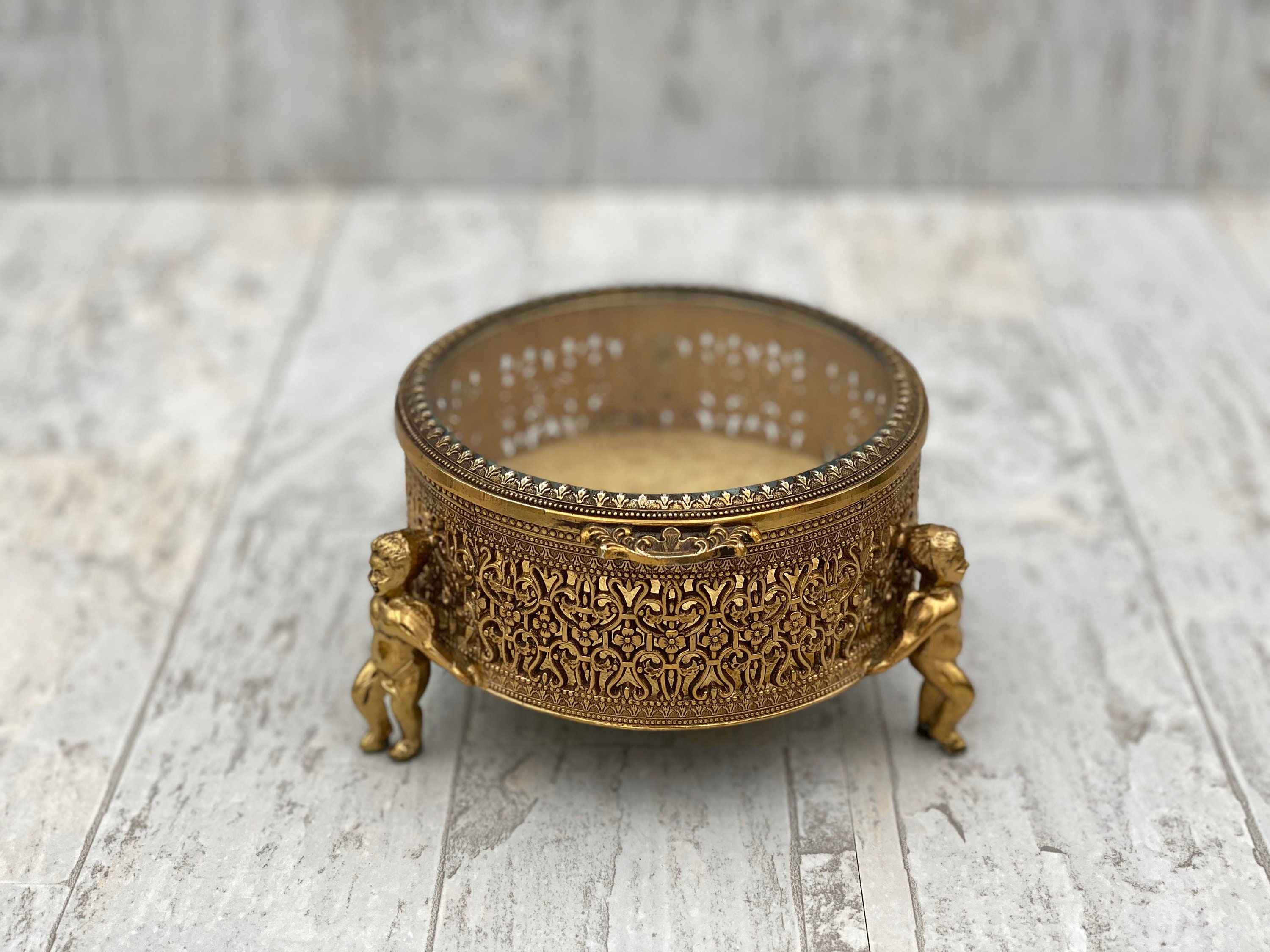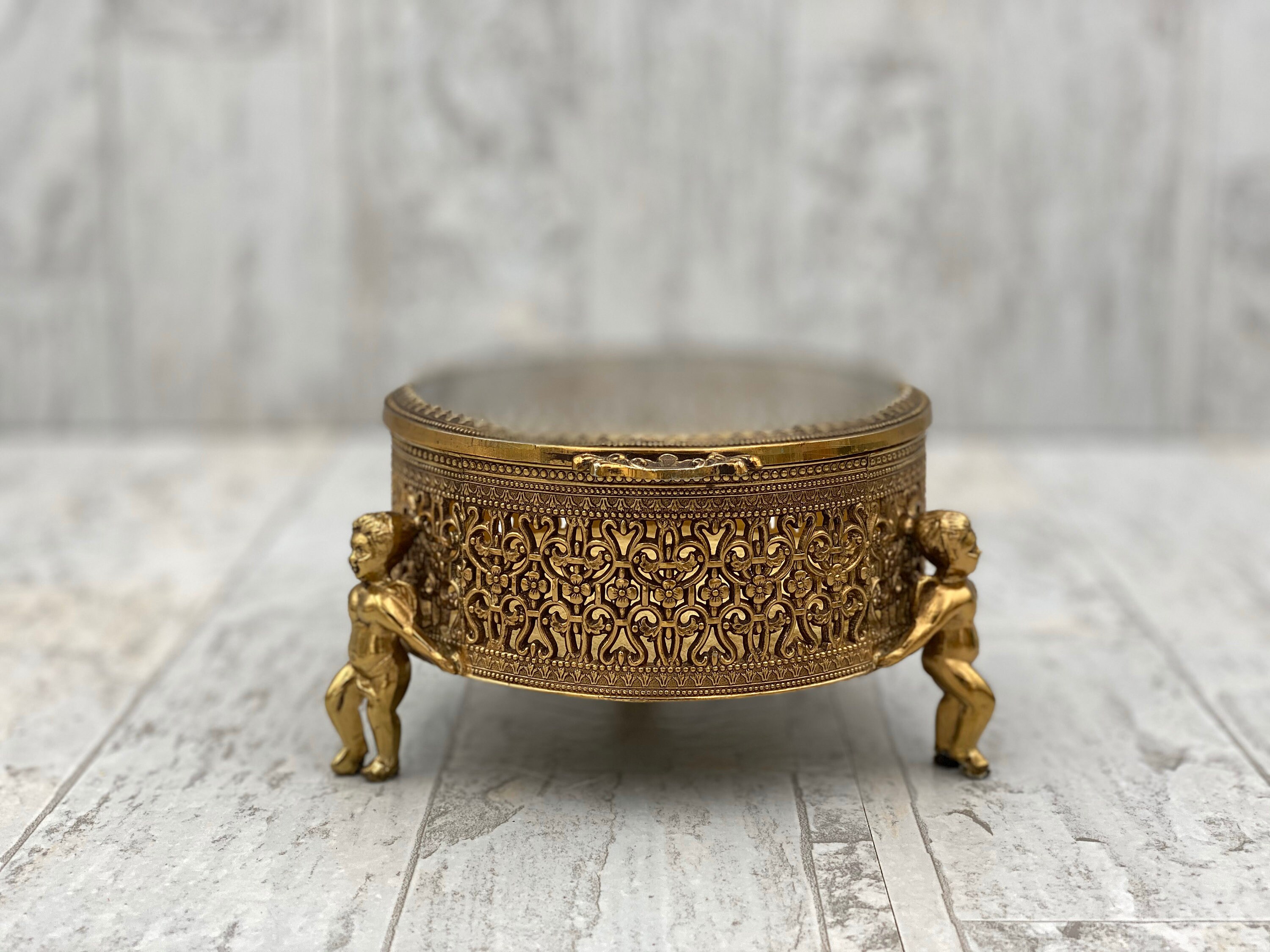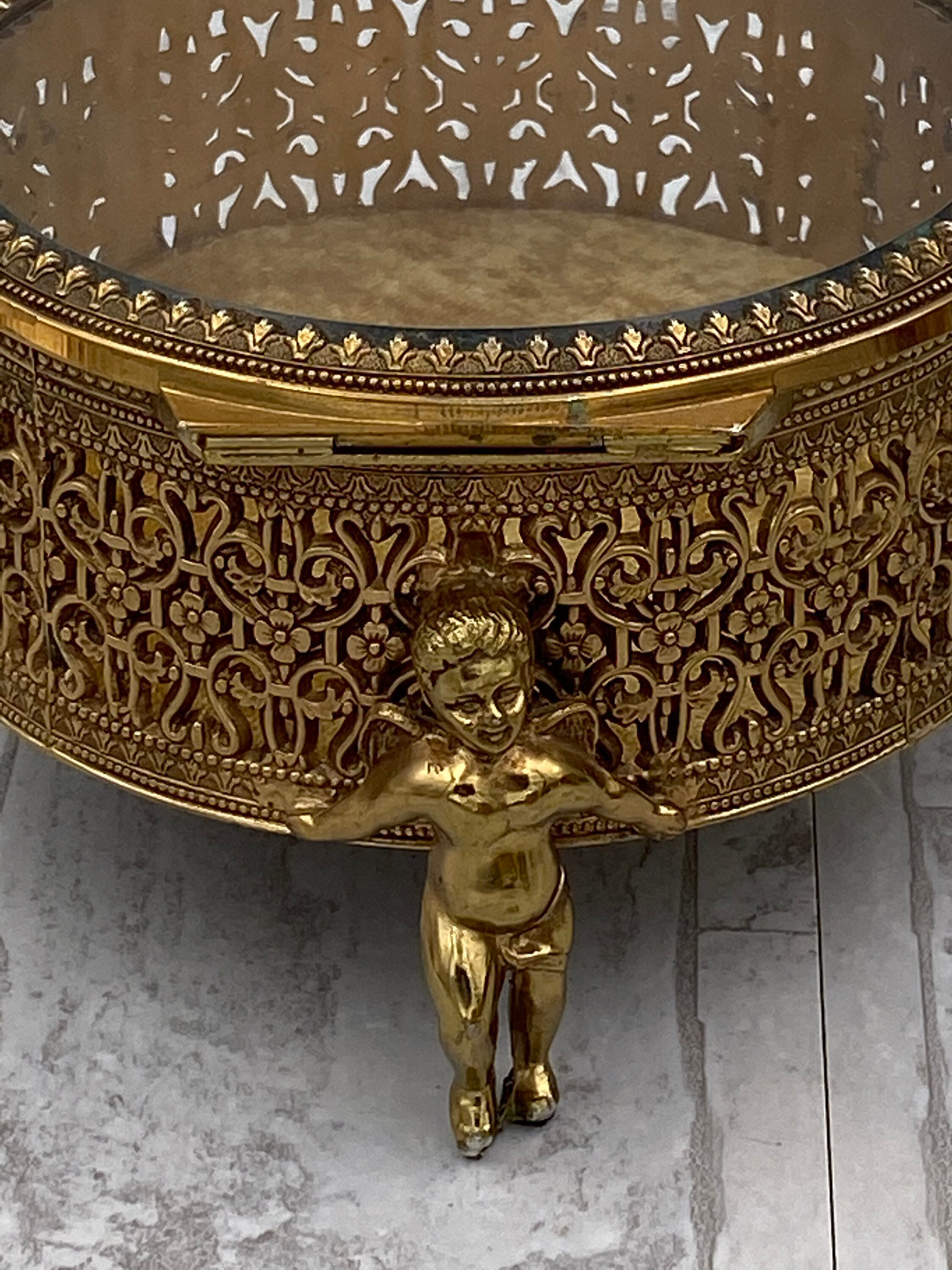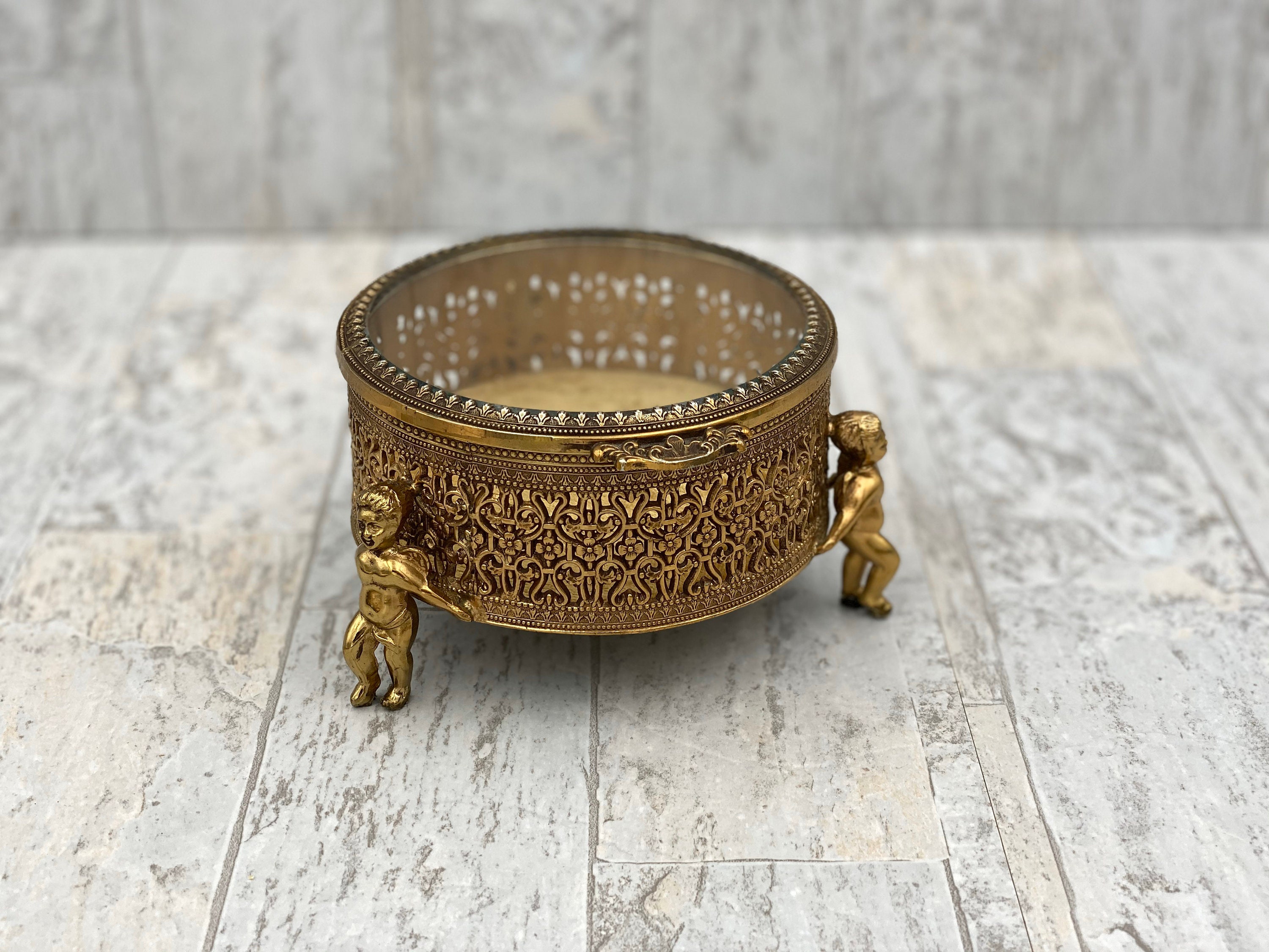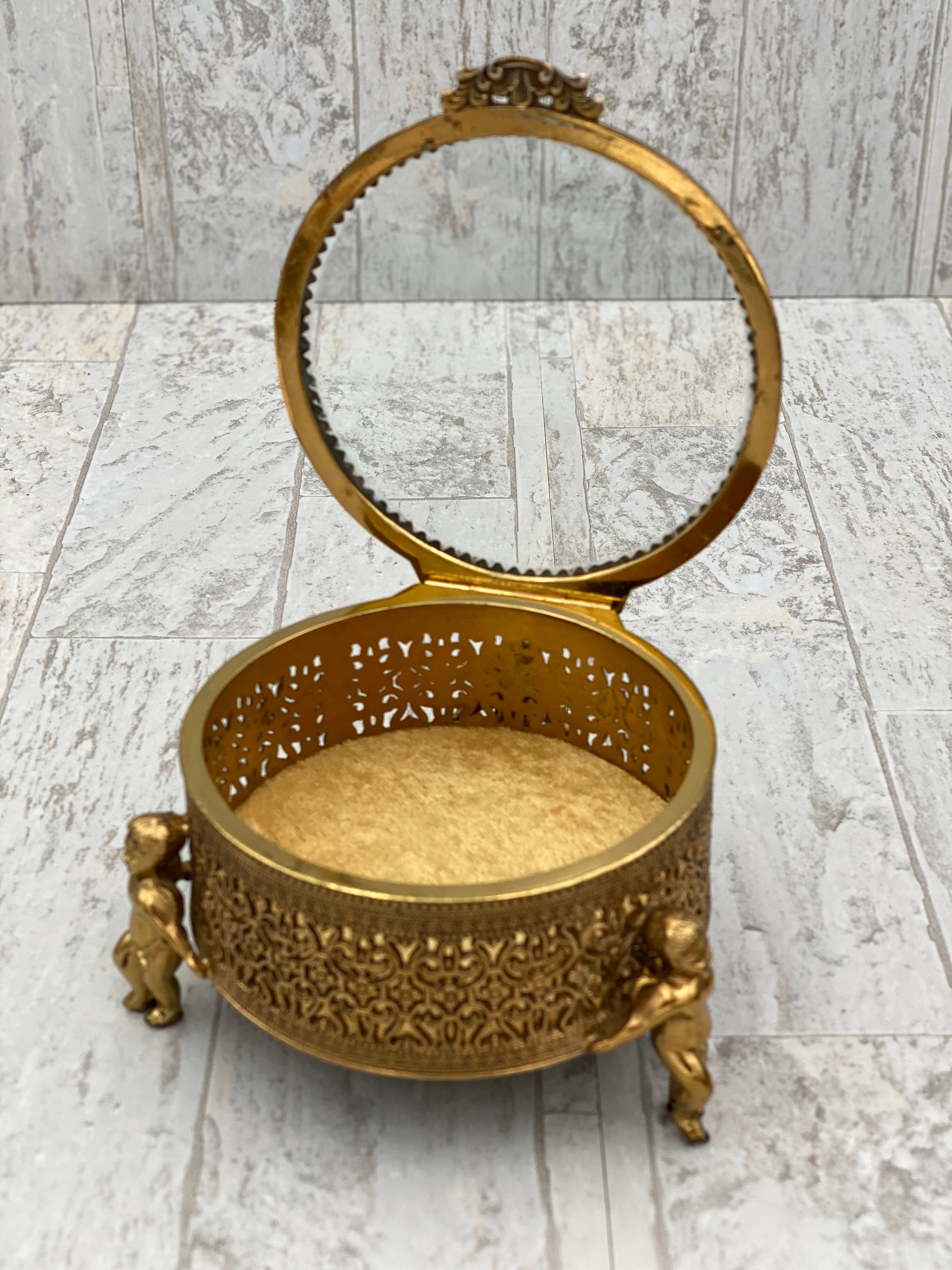 Beautiful vintage Gold Plated Jewelry Casket trinket box with Beveled glass lid. In a unique Style with precious little Cherub Figurines holding it.