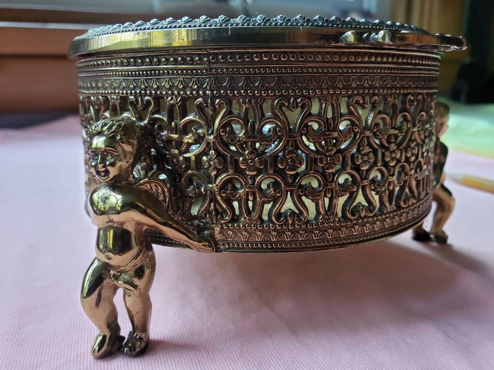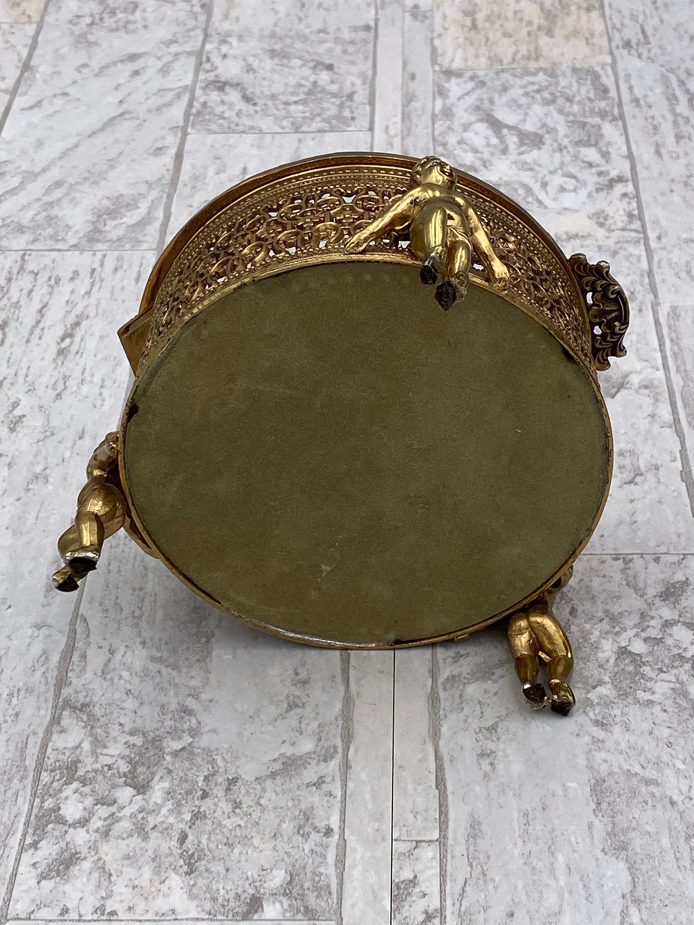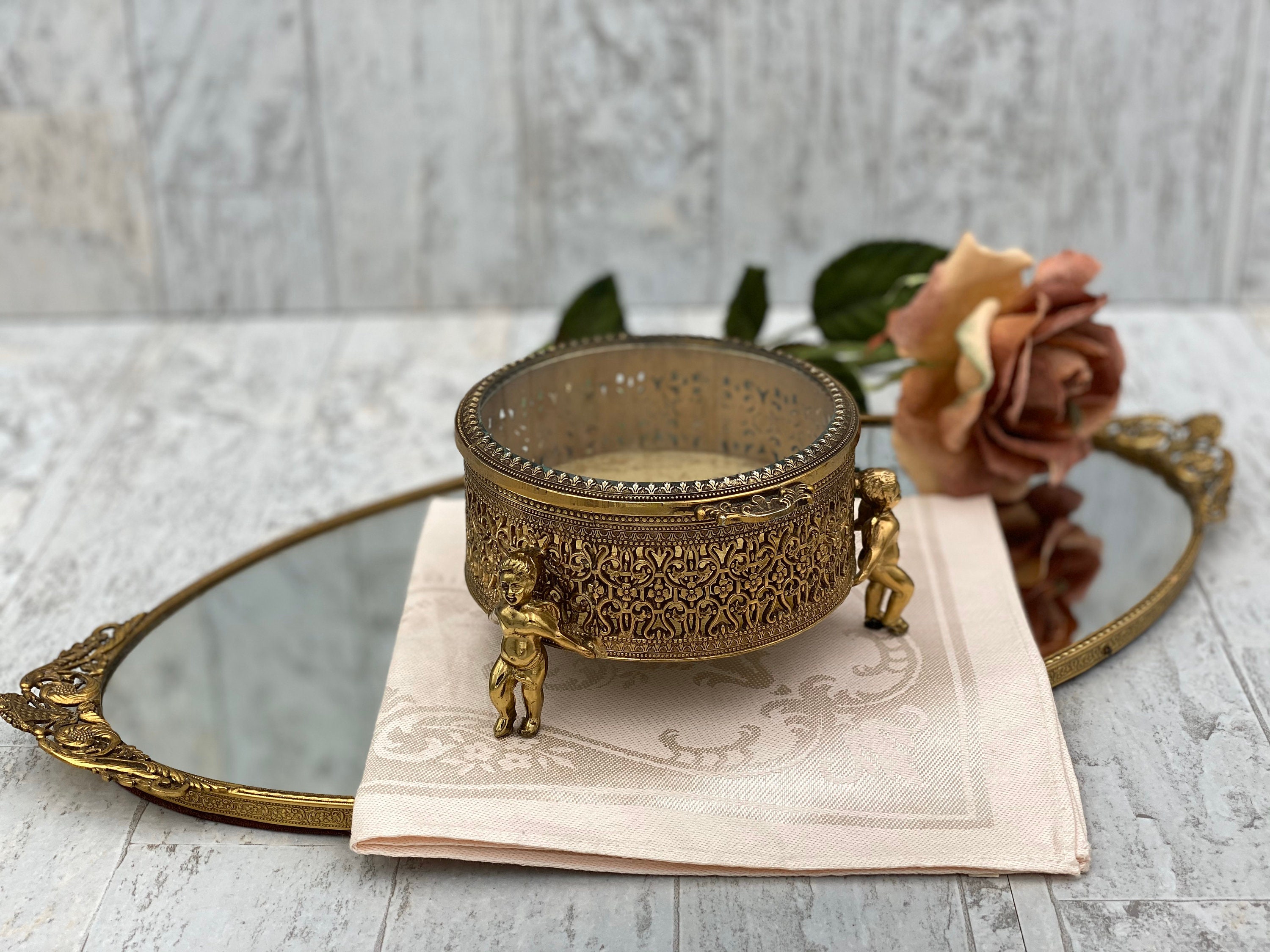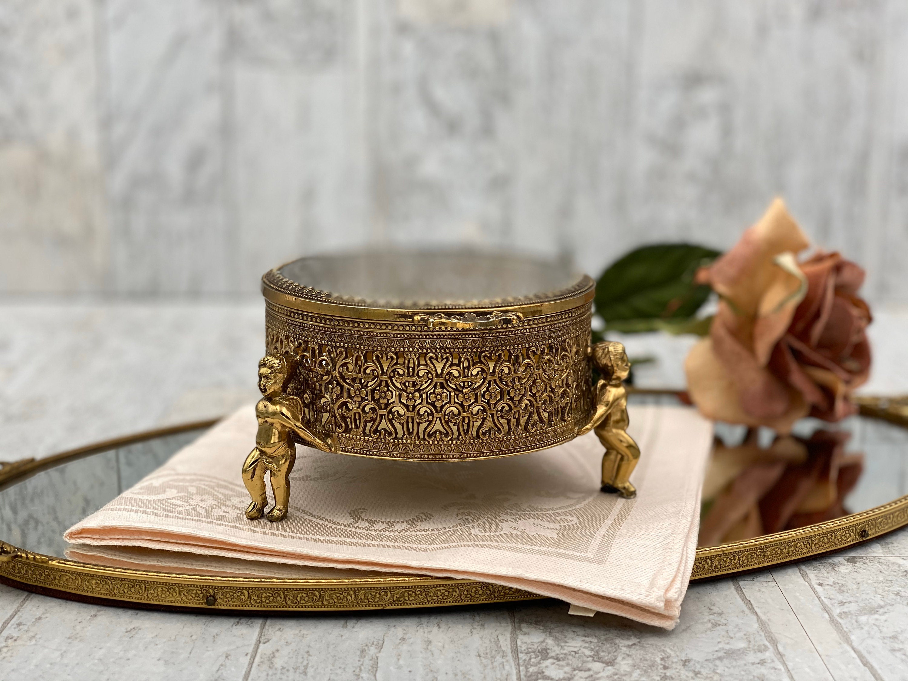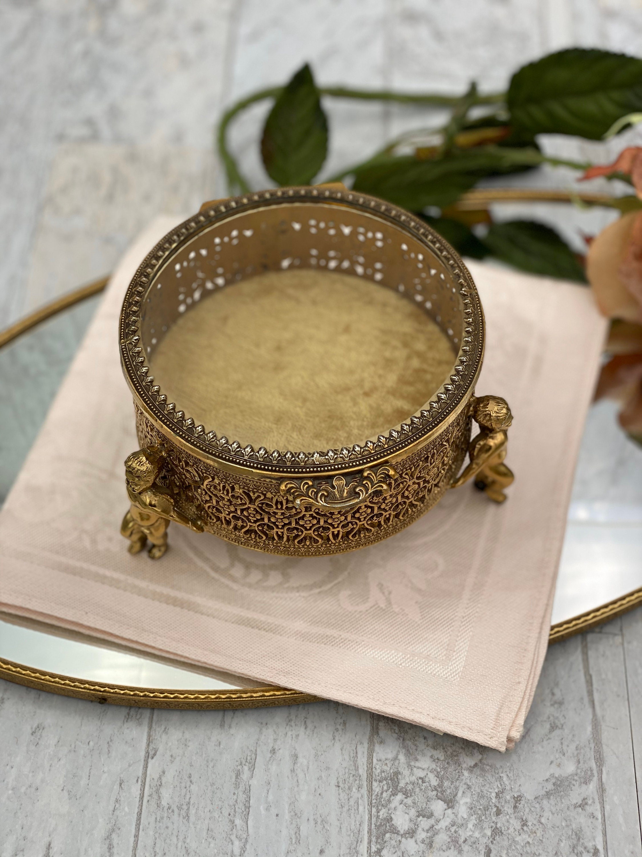 Beautiful vintage Gold Plated Jewelry Casket trinket box with Beveled glass lid. In a unique Style with precious little Cherub Figurines holding it.