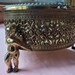 The floral design is in delicate gold plated filigree. A gorgeous accent to a dressing table. This round box has a glass viewing window. Inside of the box is a cushion of Champagne colored crushed velvet.