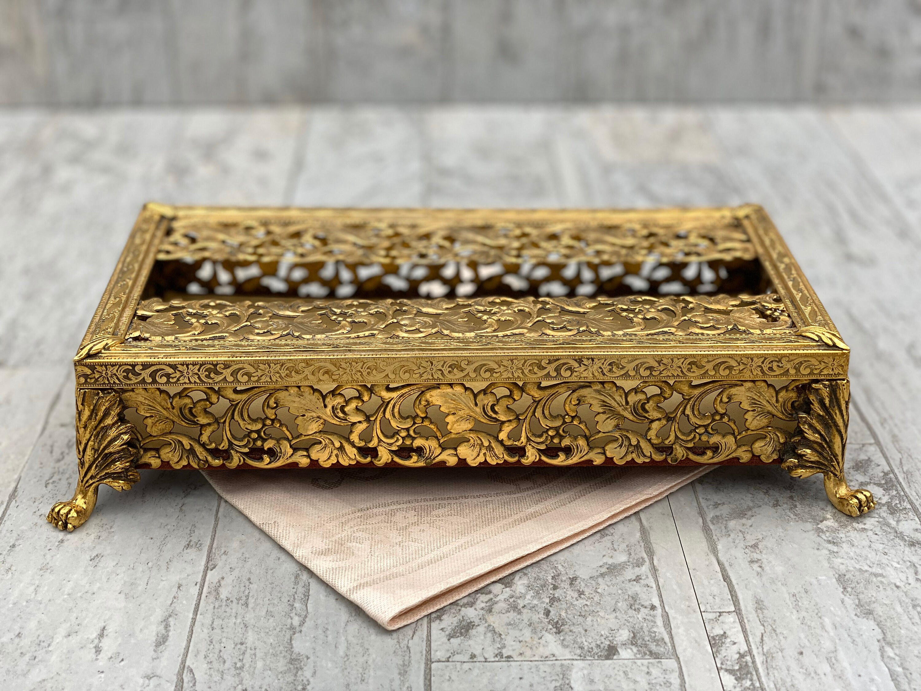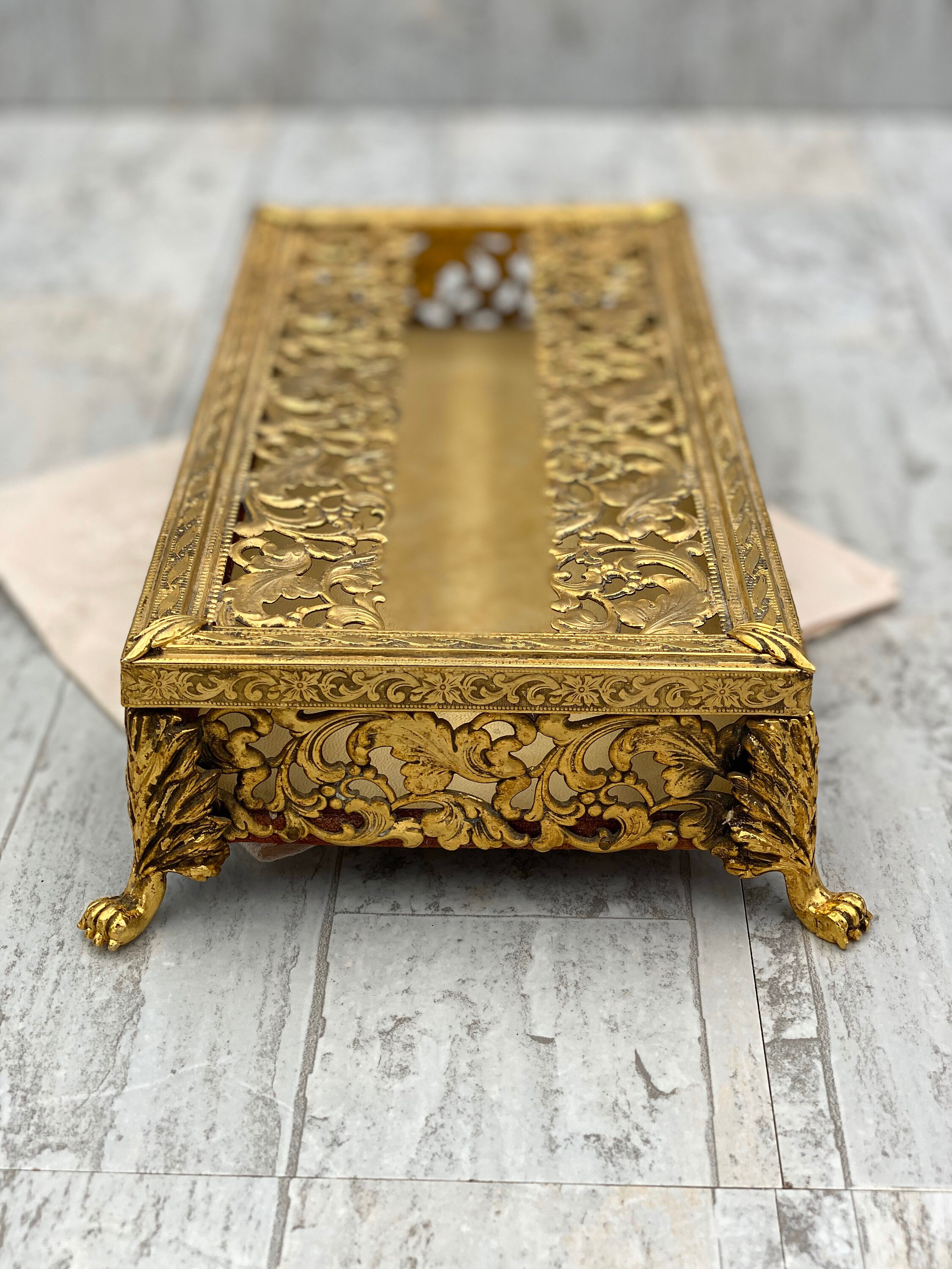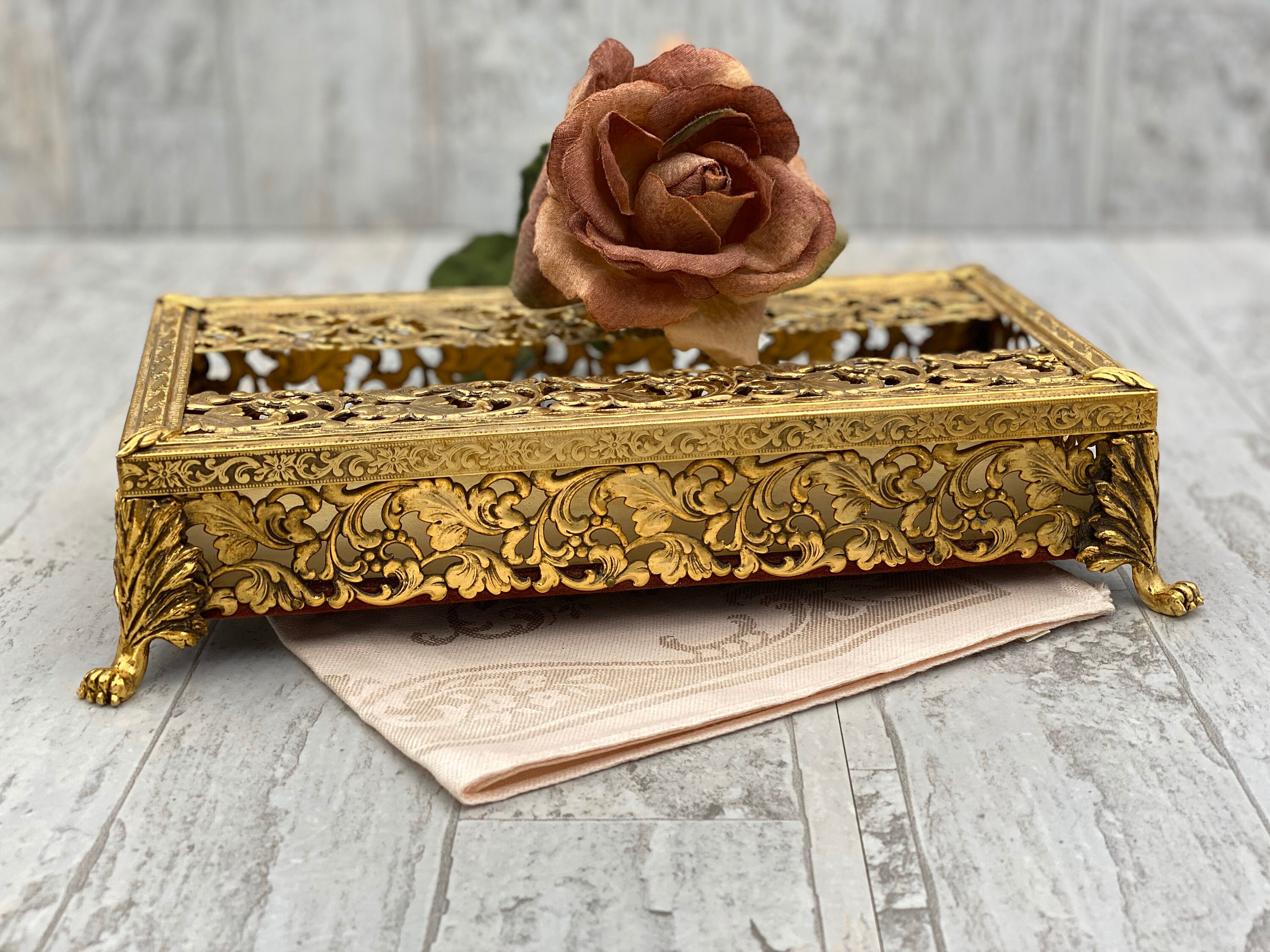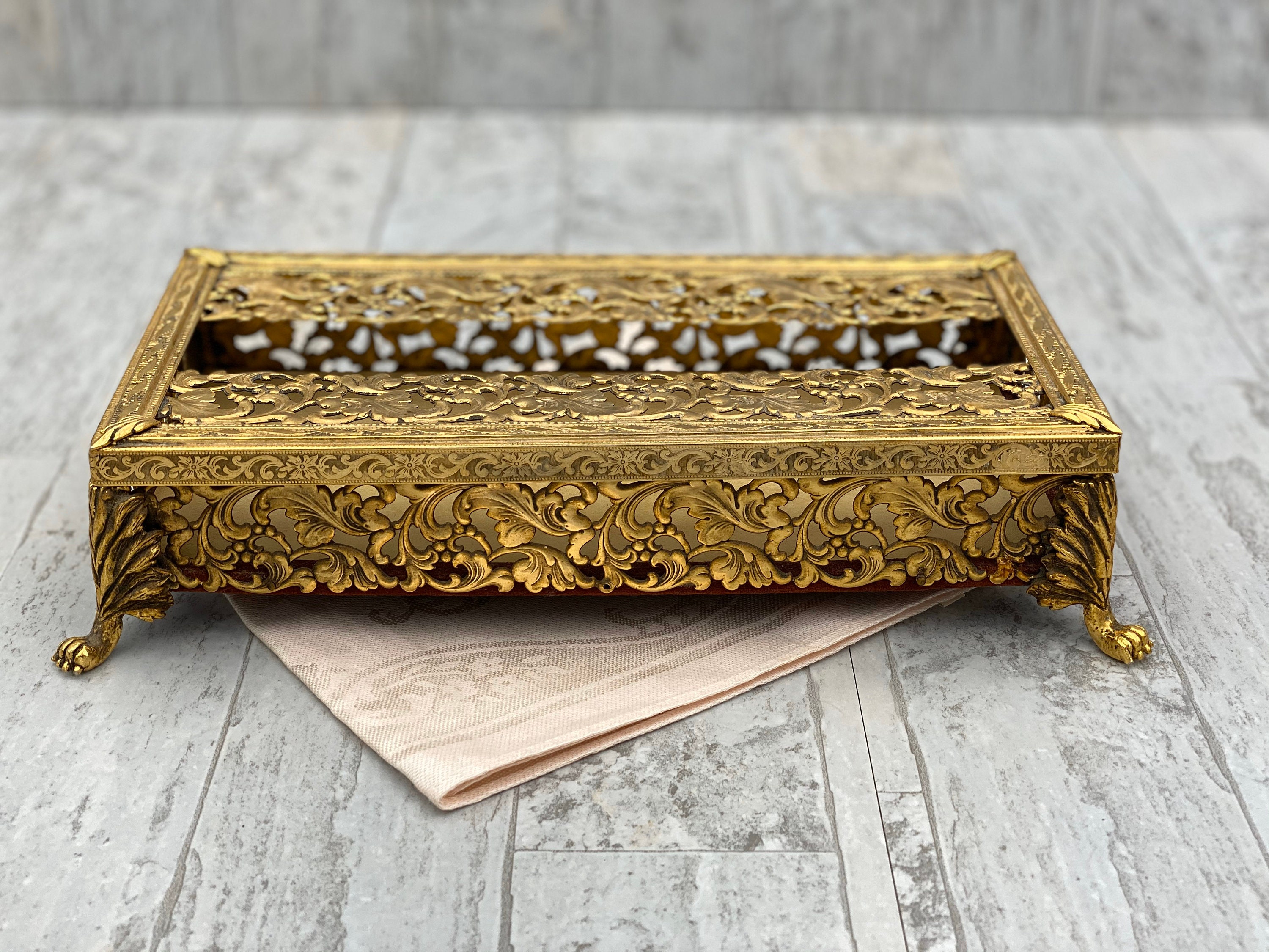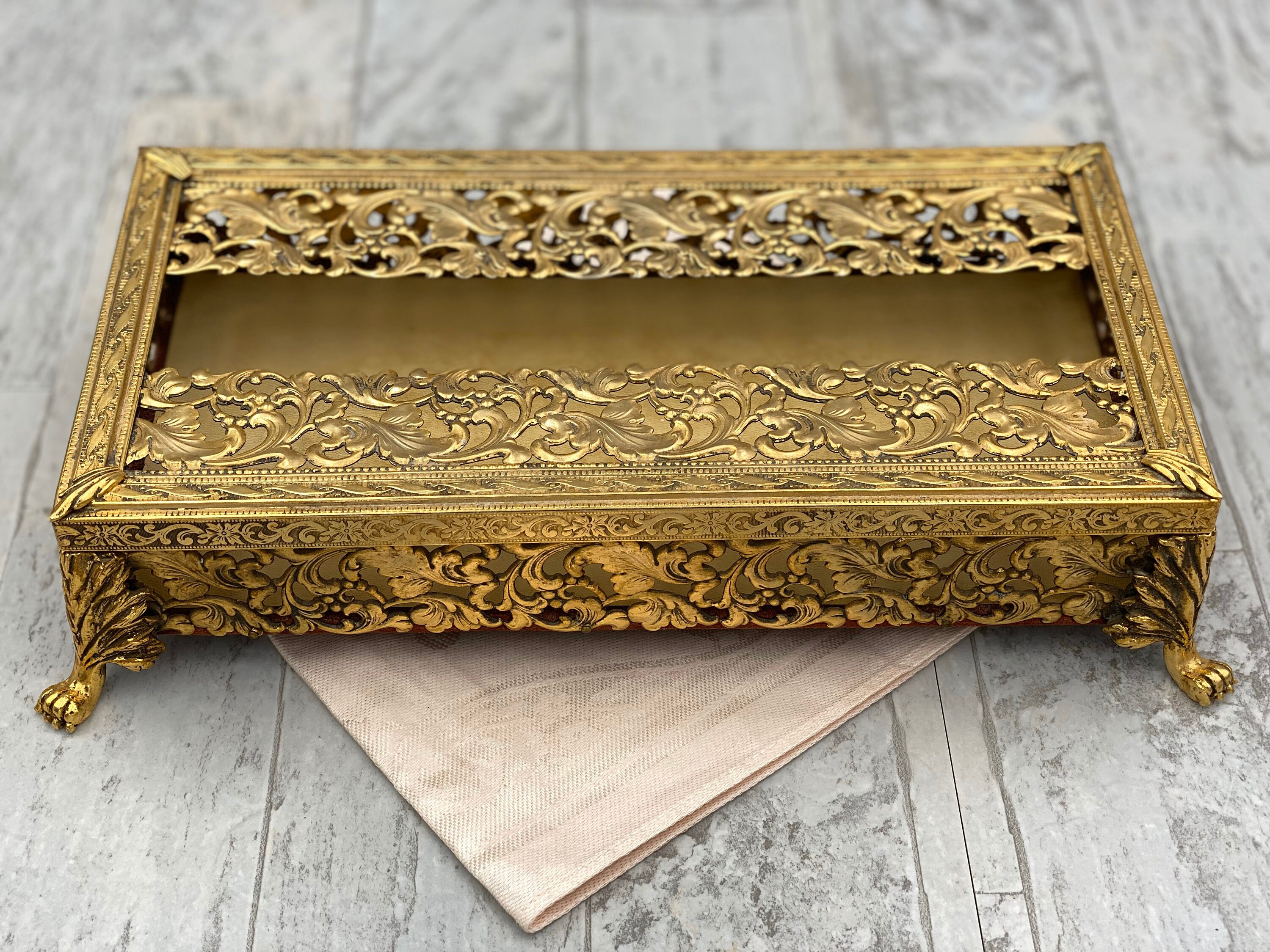A truly vintage Gold Plated Vanity Tissue cover. This is a classic Hollywood Regency Style tissue cover for encasing a slim box of Kleenex.
