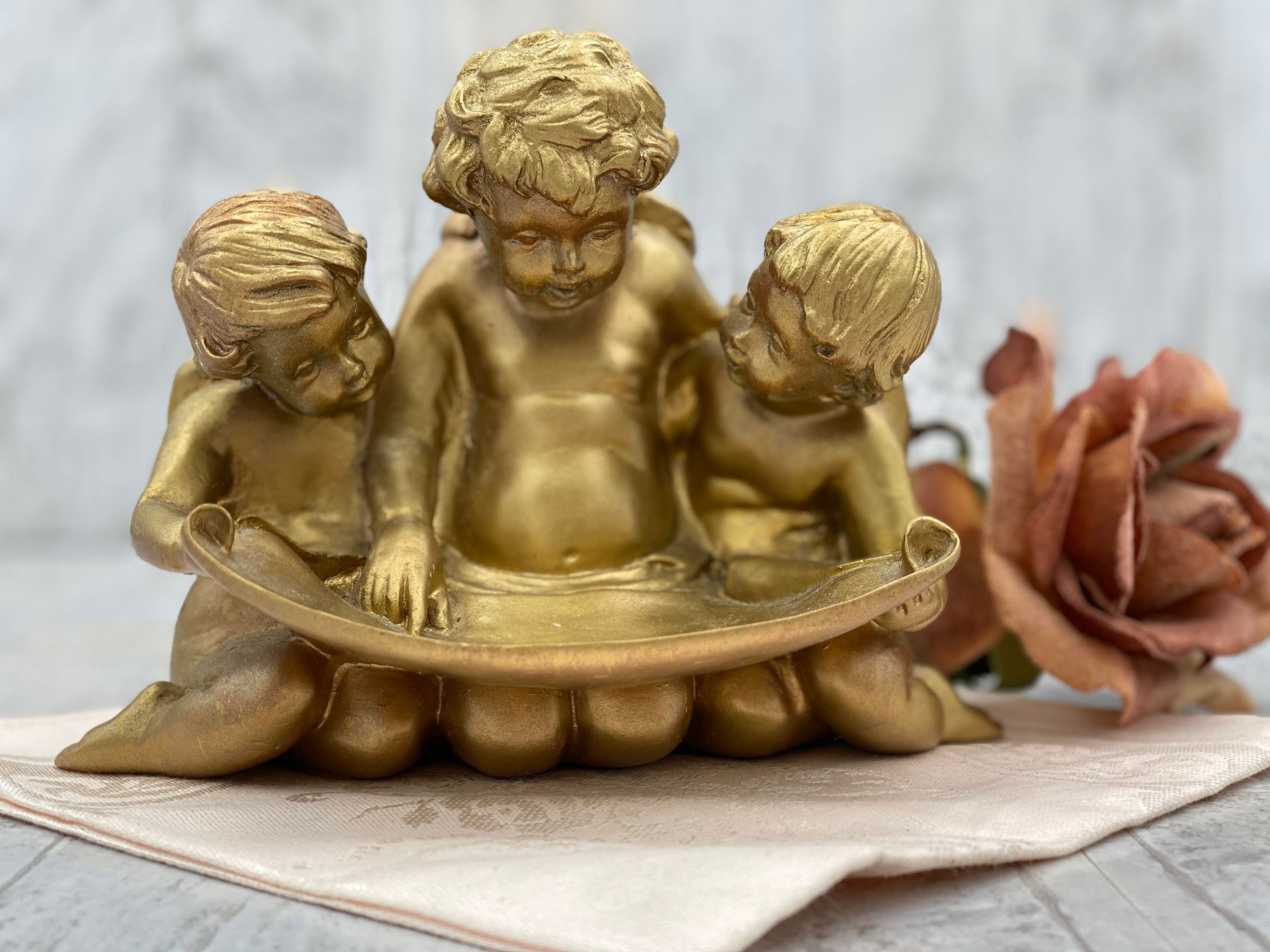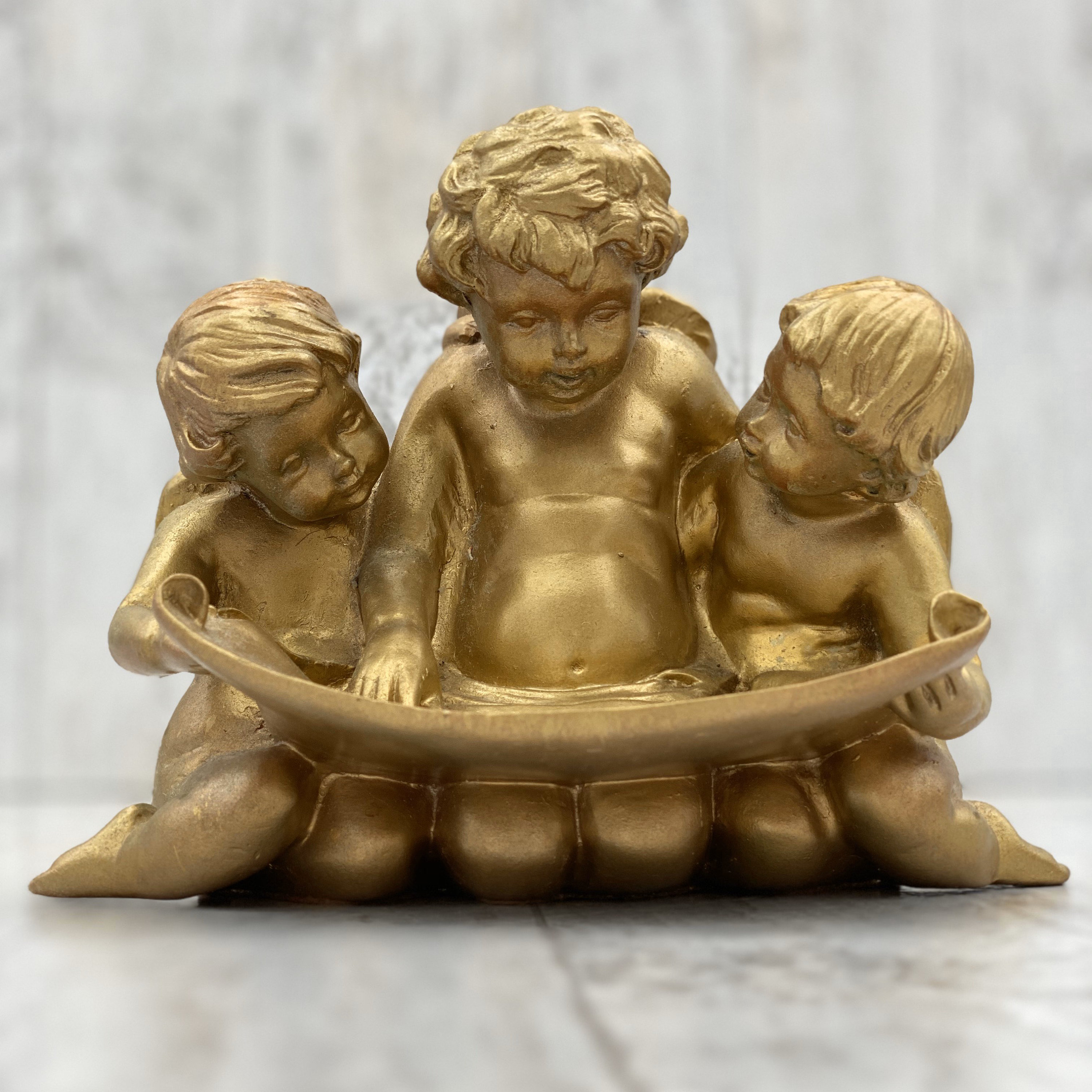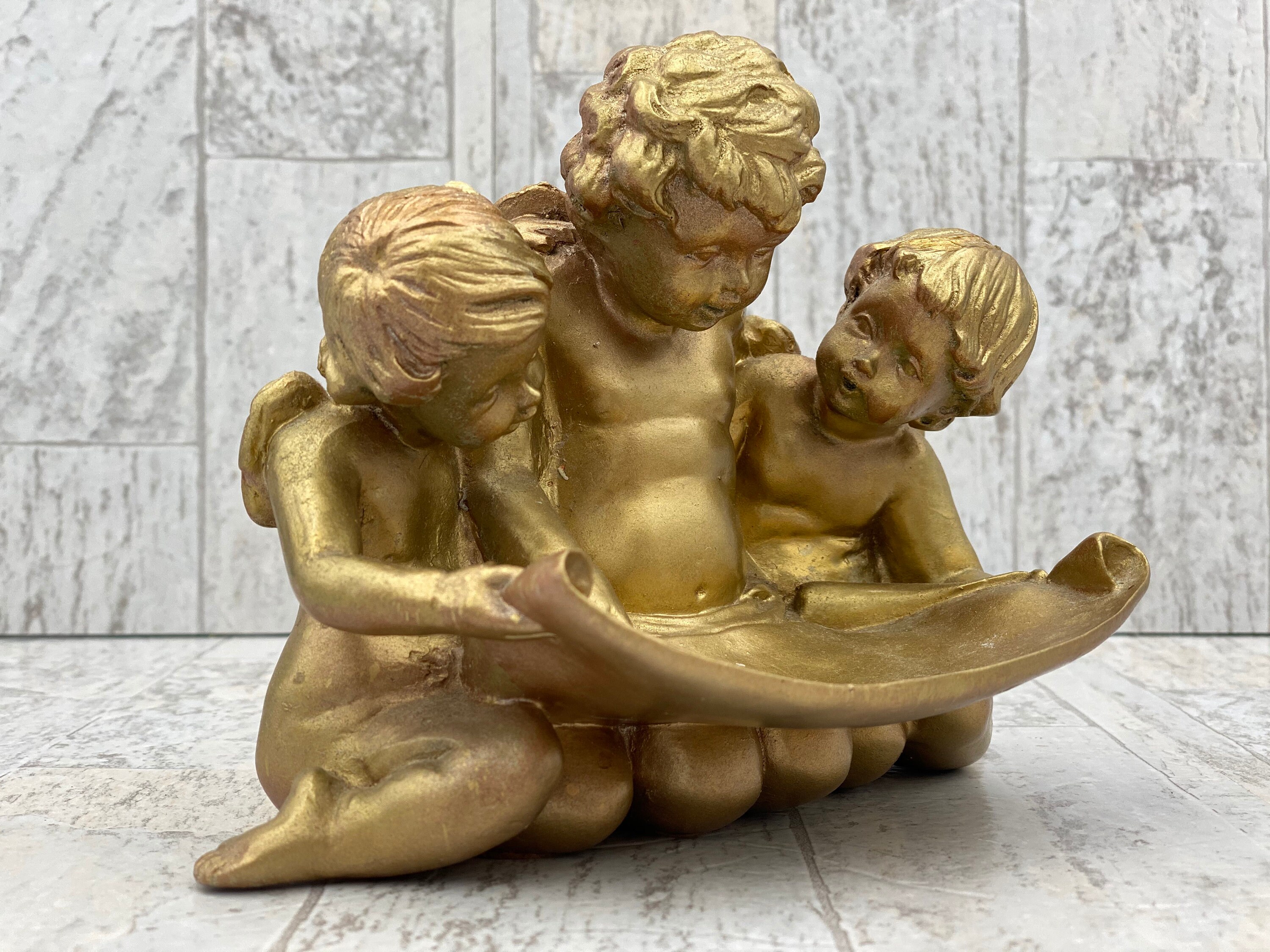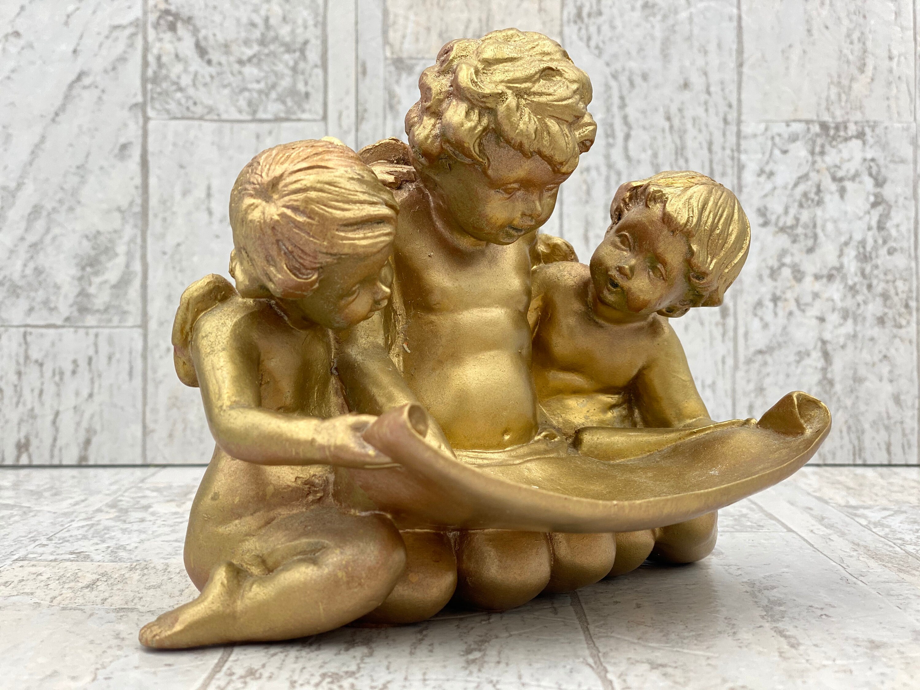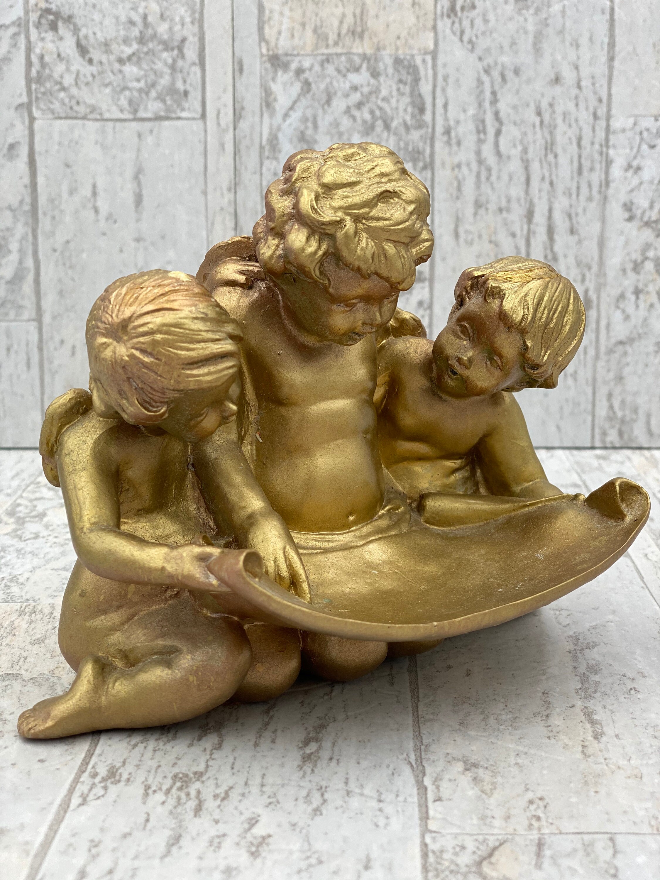 Made in a Hollywood Regency style these Cherubs softly shine. The trio of cherubs are studying a scroll that doubles as a little tray for holding trinkets or rings.