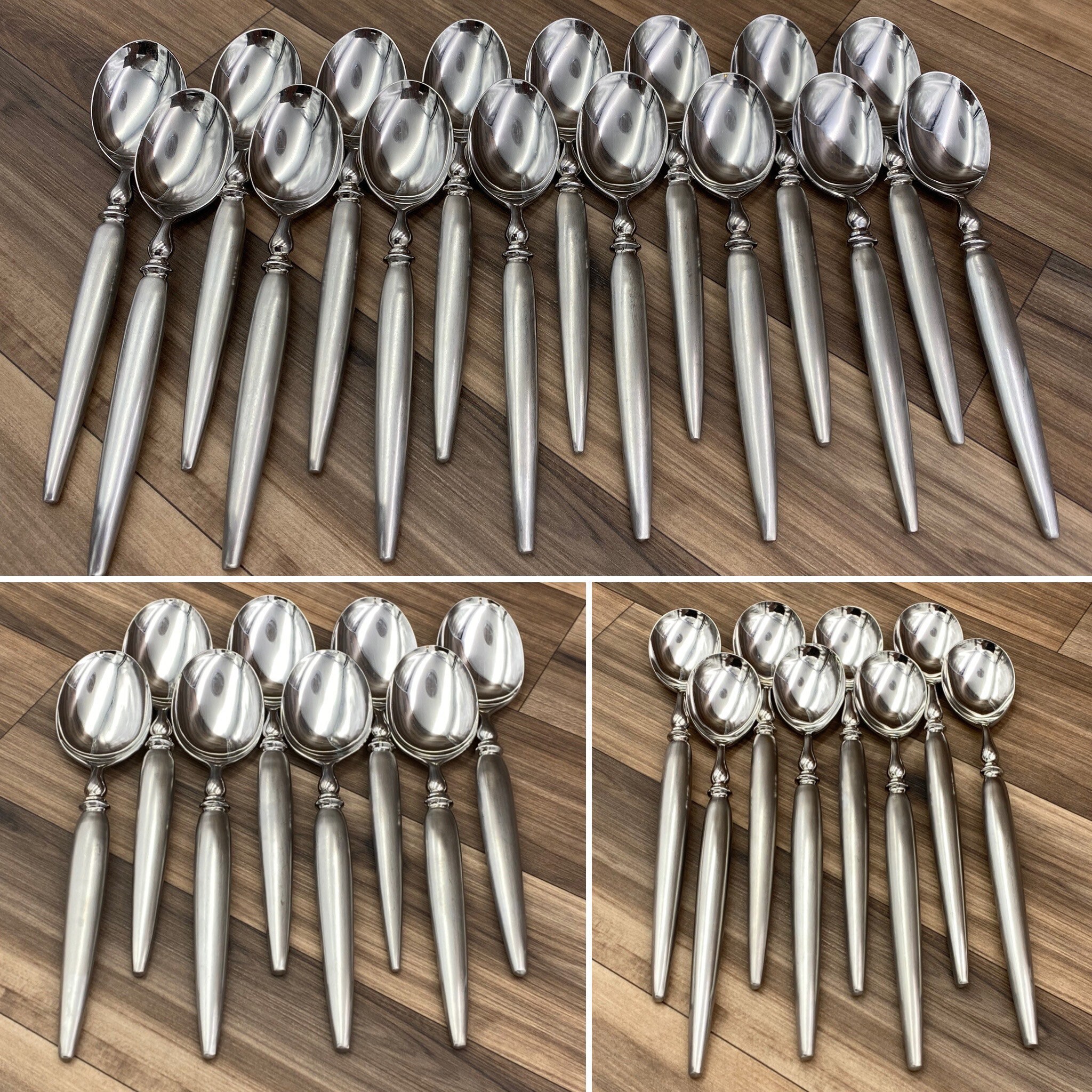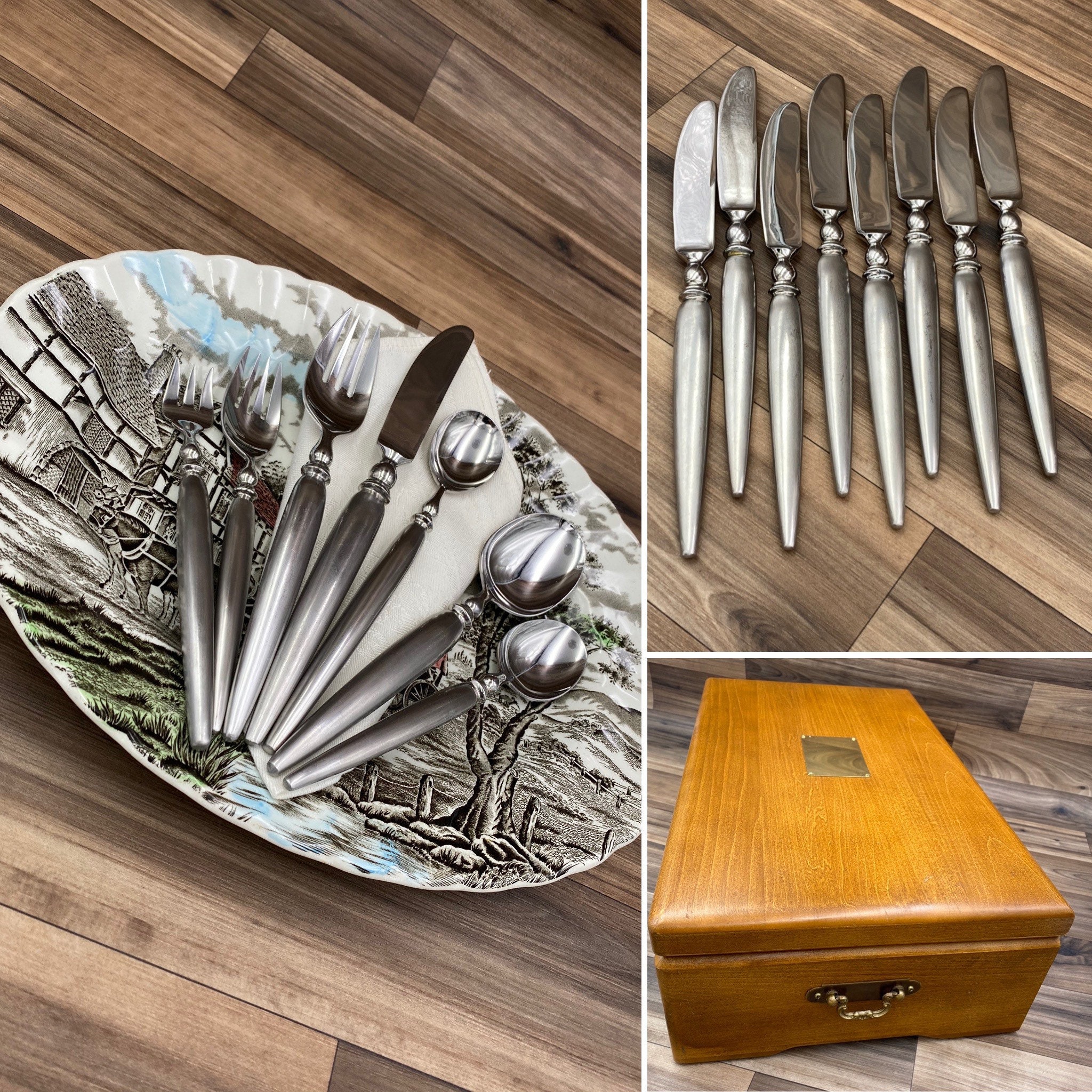 This is an RARE complete set of SaladMaster Ellise Flatware. This is an amazing set of glossy forged Stainless Flatware with Satin finish Bistro Style Handles.