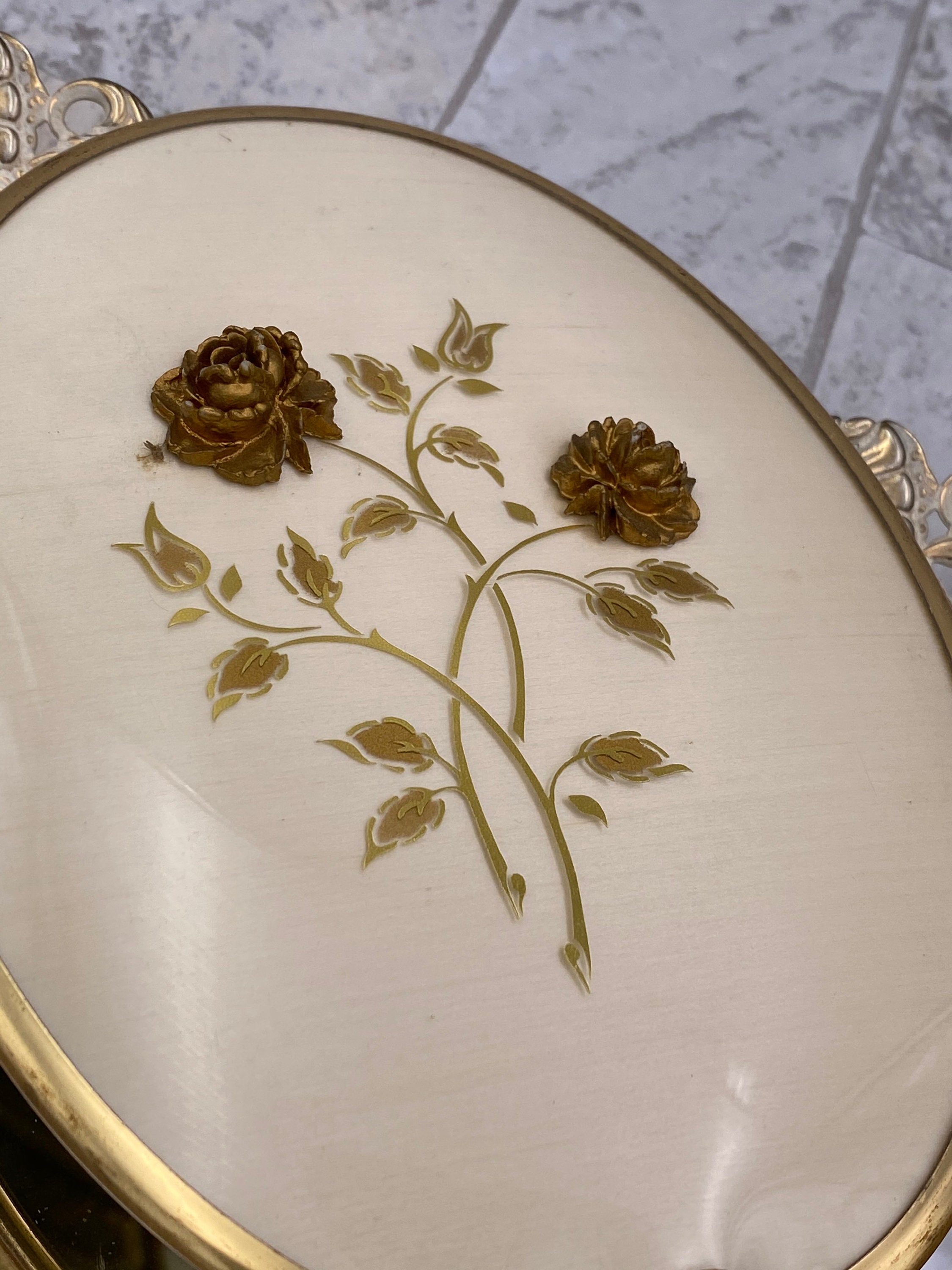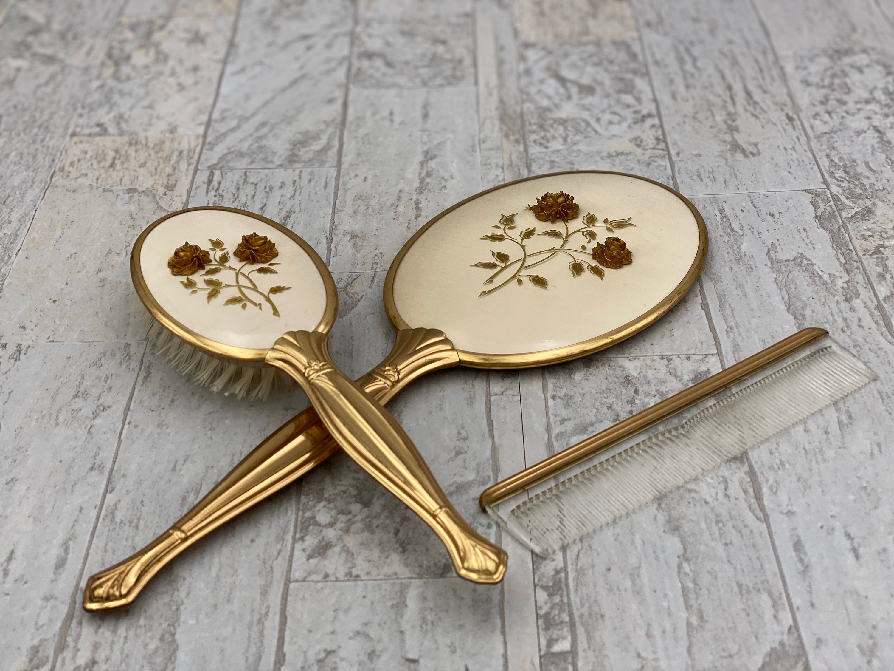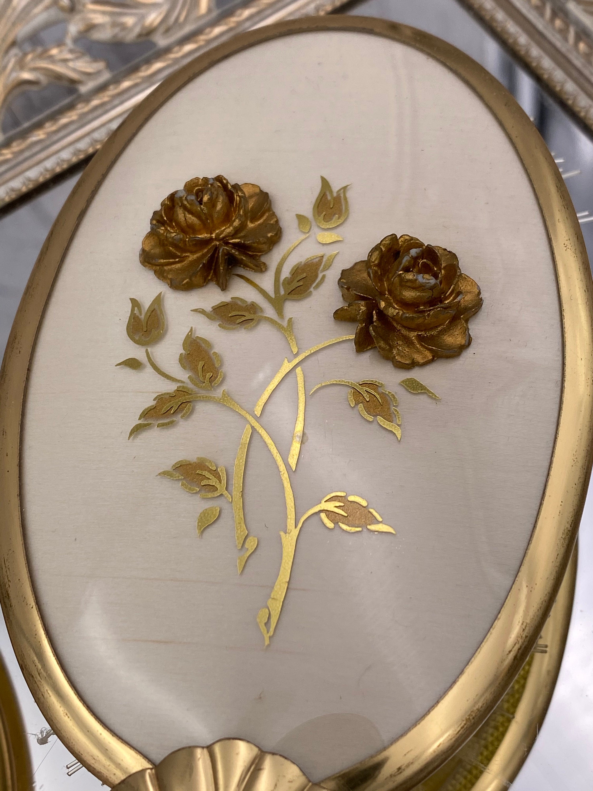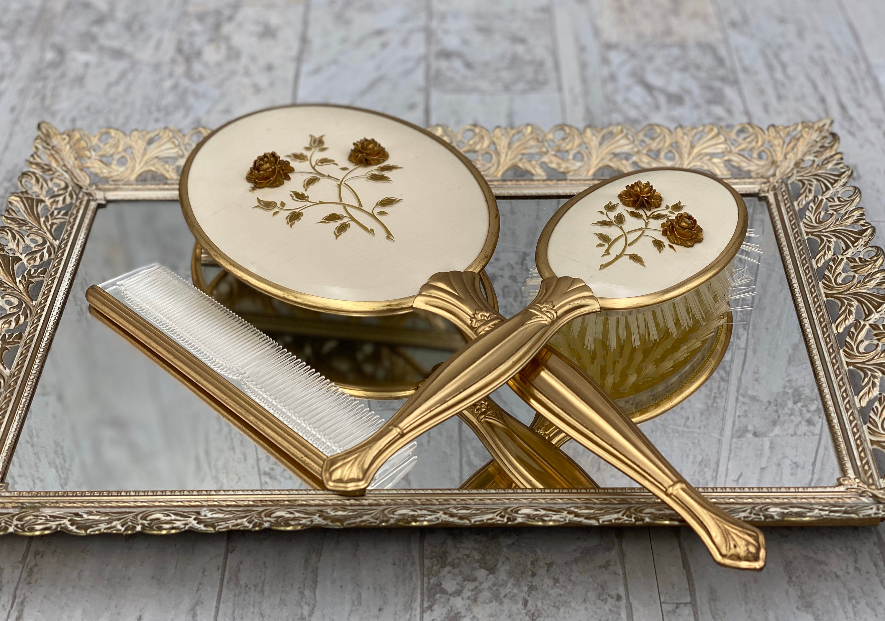 The hand mirror and brush have a gold filigree raised ornament of spray Roses in the center of an ivory colored background. The lovely decorative pieces are in a Hollywood Regency Style.