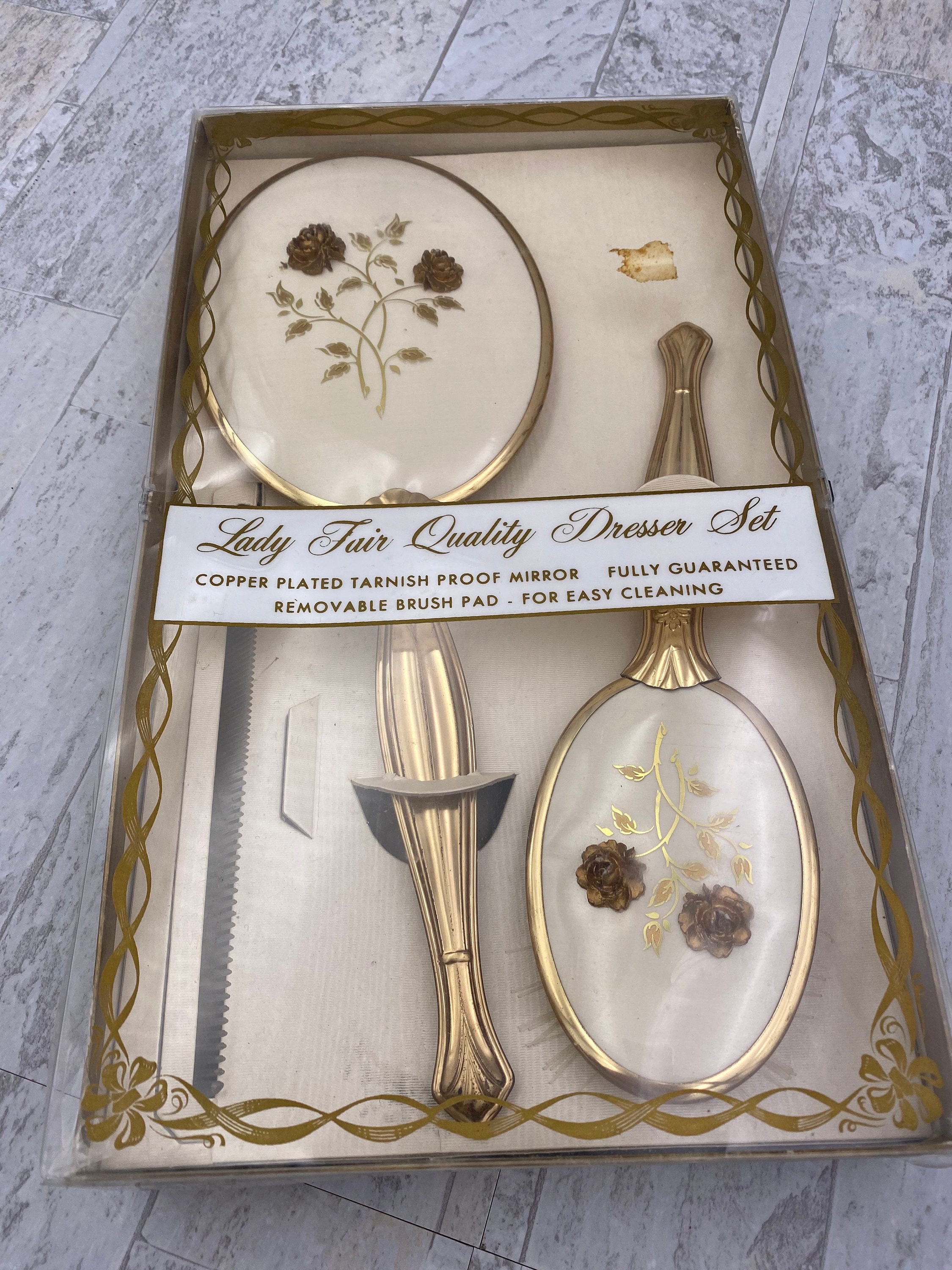 This is a lovely Vintage Lady Fair Vanity Set of a matching Hand Mirror, Brush and Comb. This set is plated in Copper. The matching pieces have Beautiful filigree Roses decorating the backs of the Hand mirror and brush. Gorgeous!