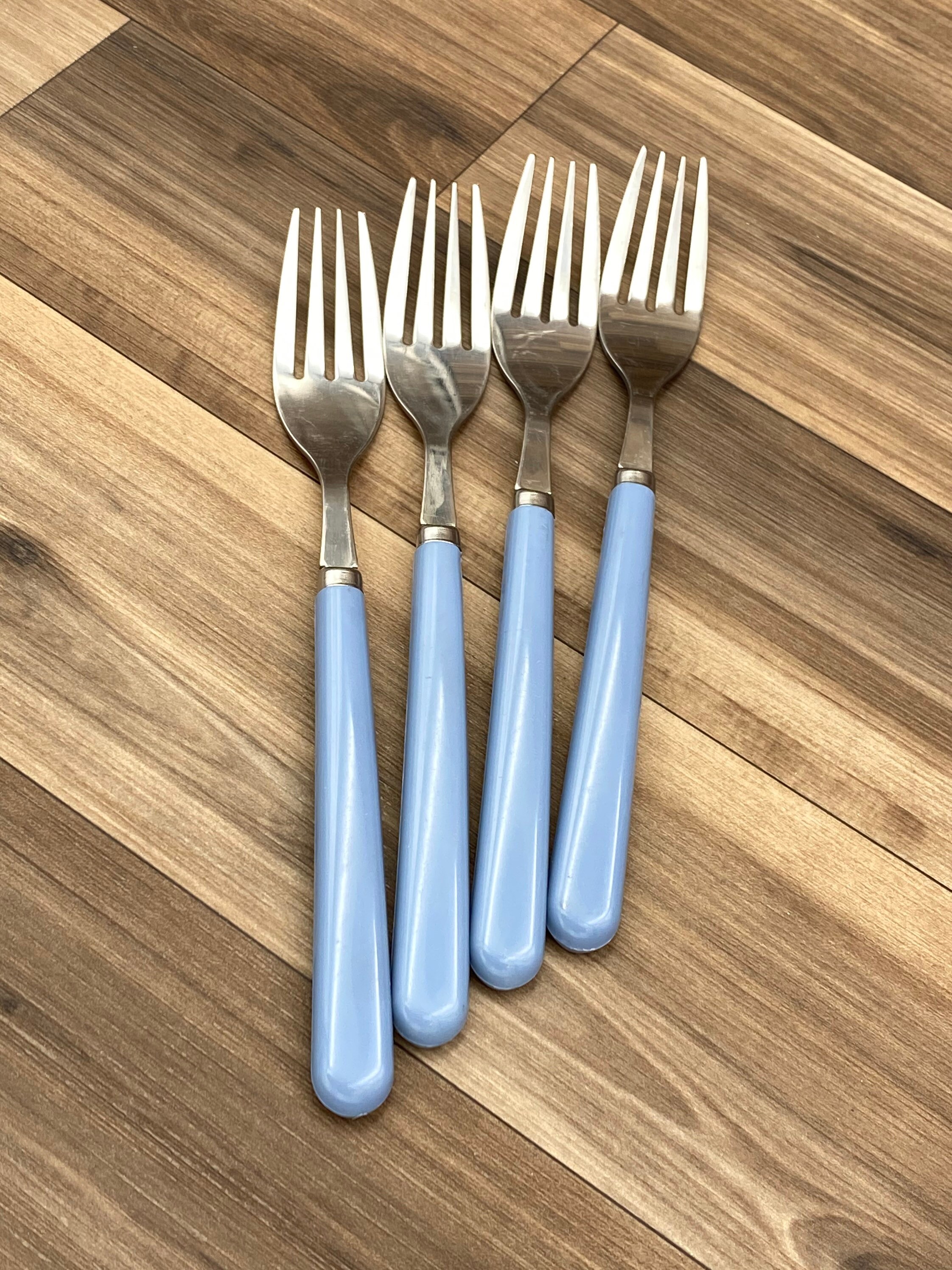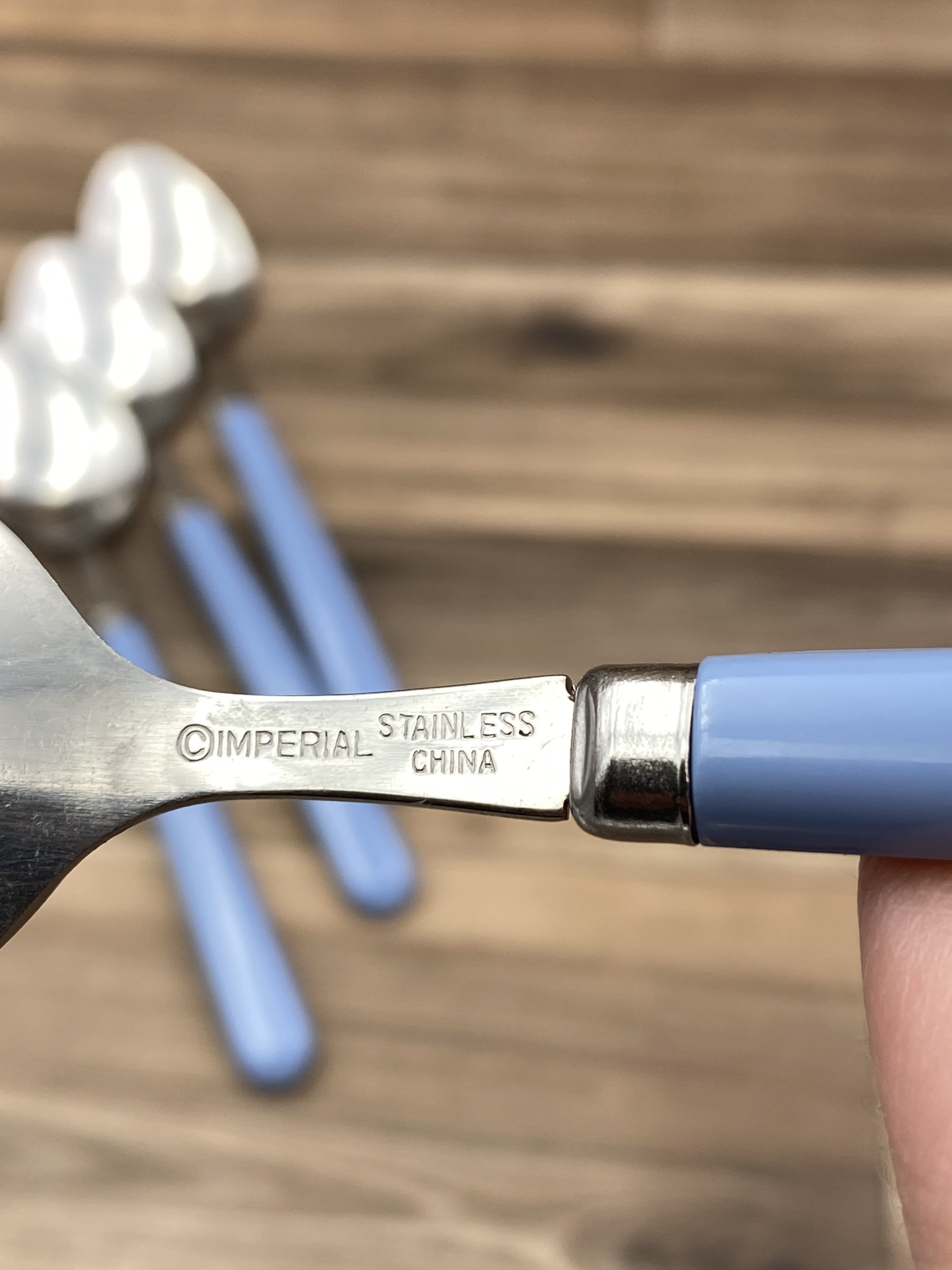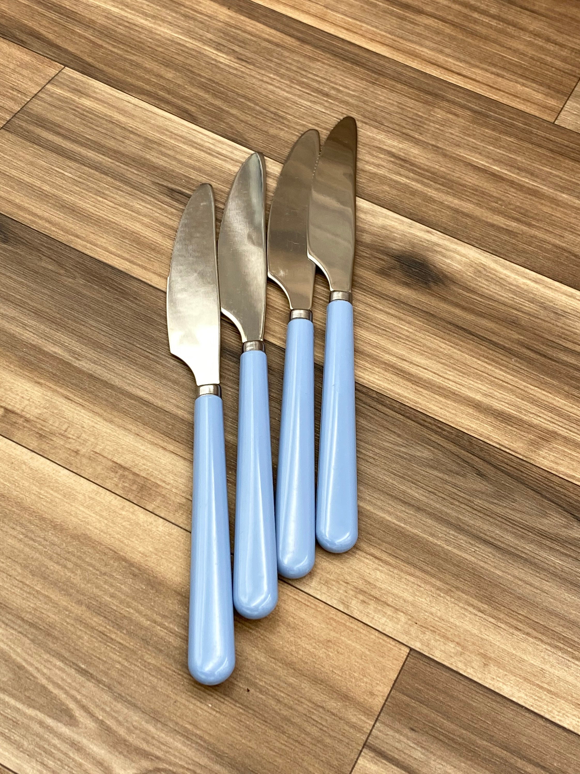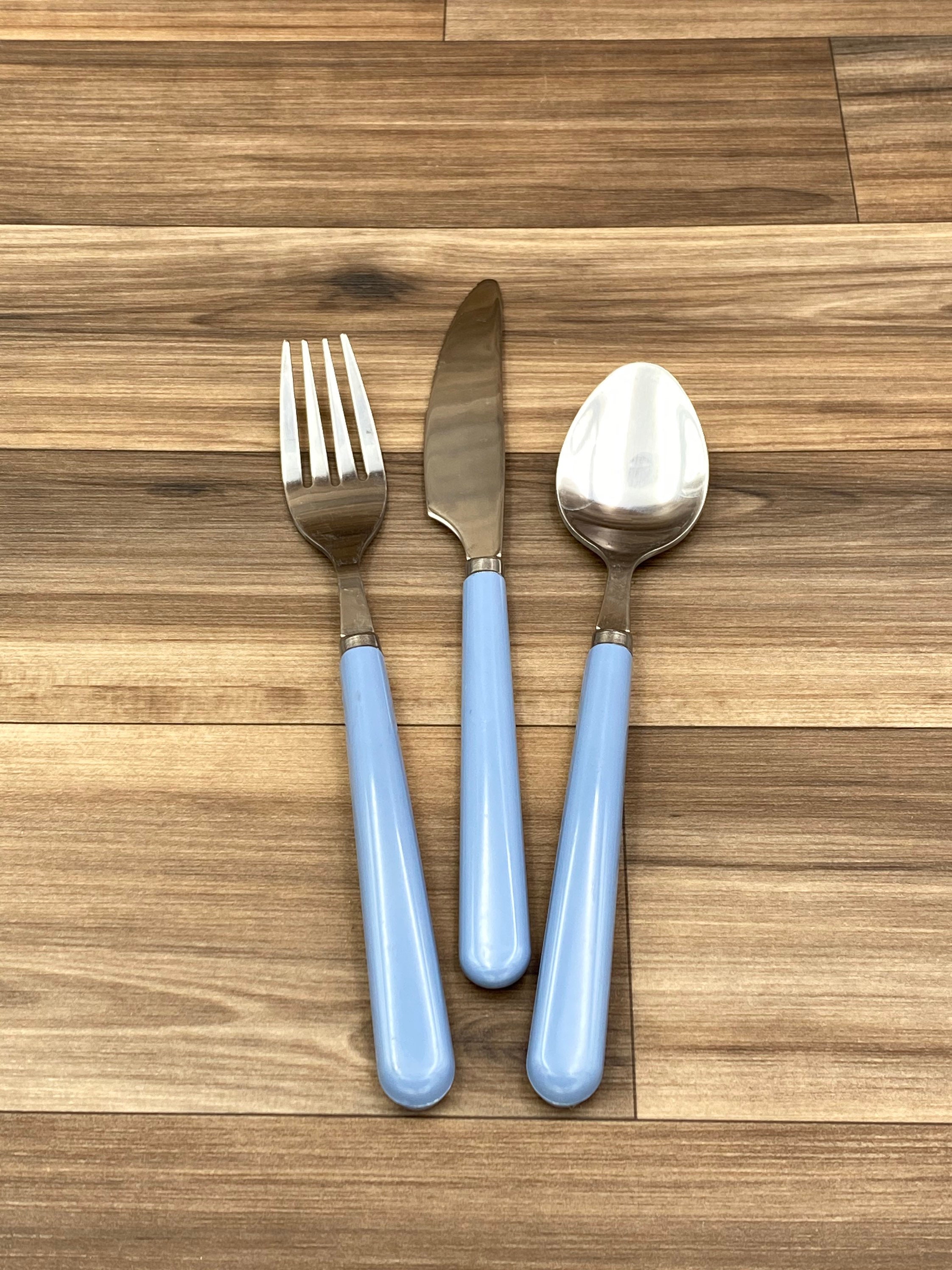 This is a New Vintage Set of Stainless flatware with Dusty Blue colored Vinyl Handles. made by the Imperial Flatware Co. it is from the Oasis line.