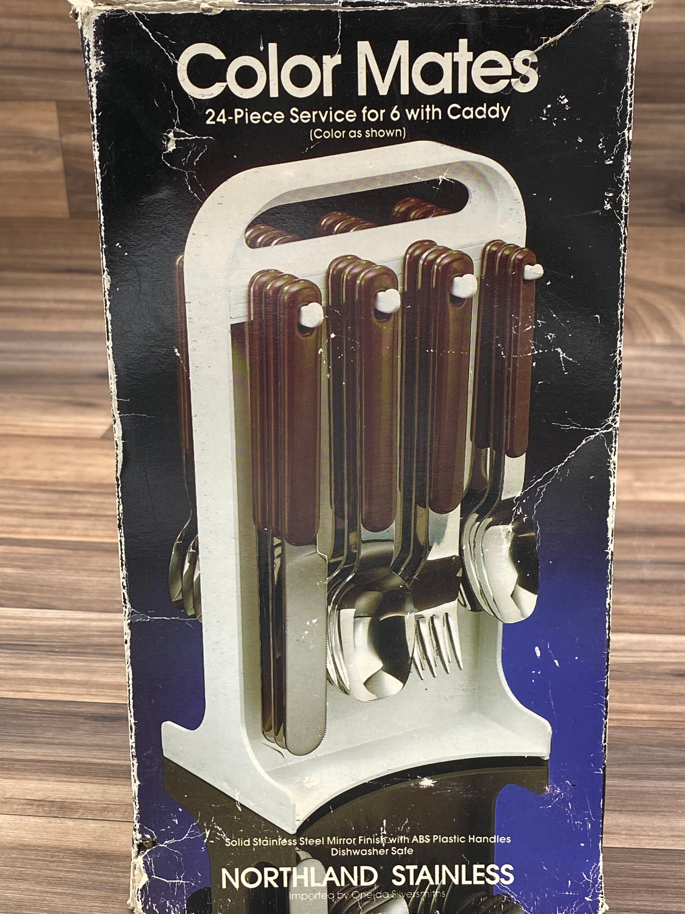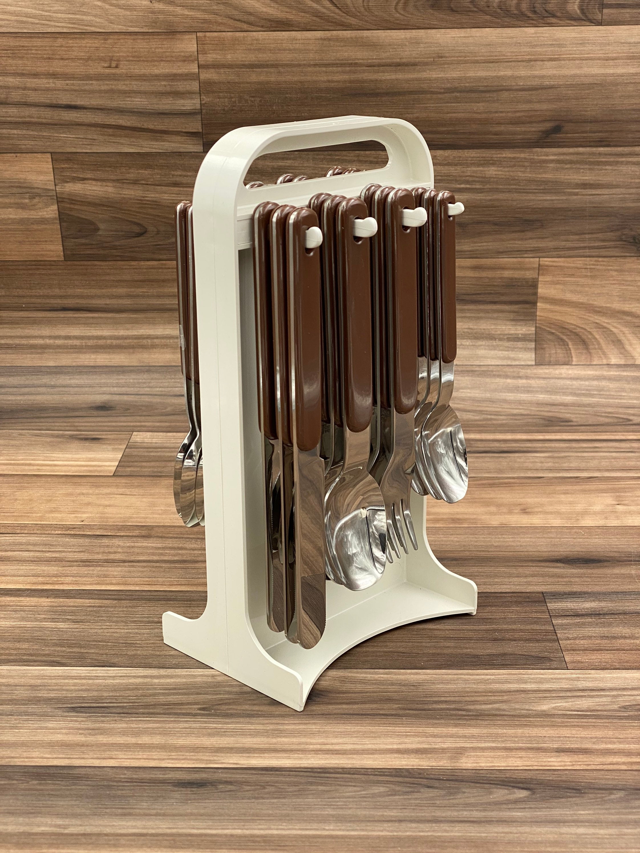 This is Fabulous New Unused Set of Vintage Stainless Flatware with Chocolate Brown Plastic Handles. This Stainless Steel flatware was made by Colormates under the Northland Brand by Oneida.