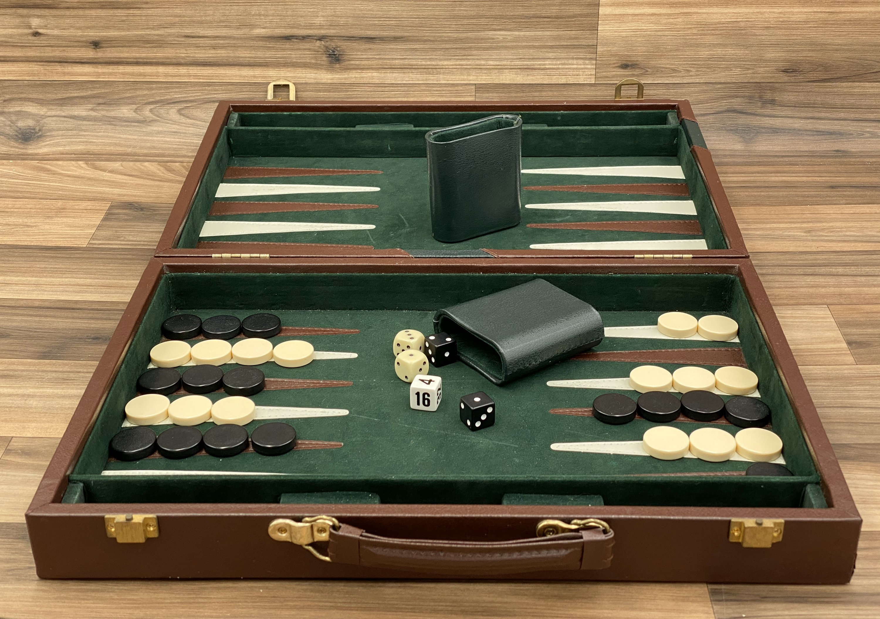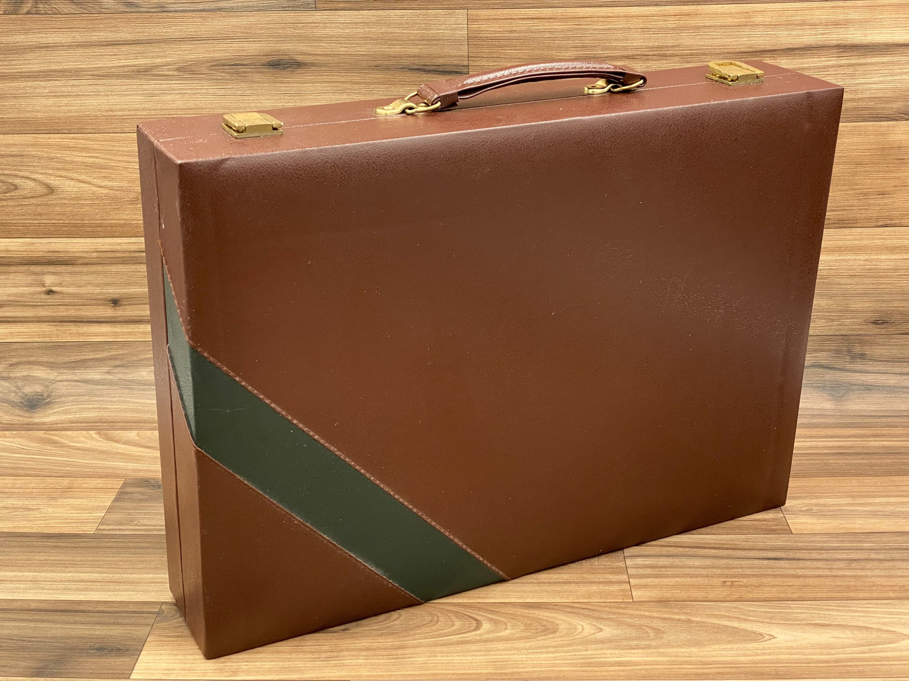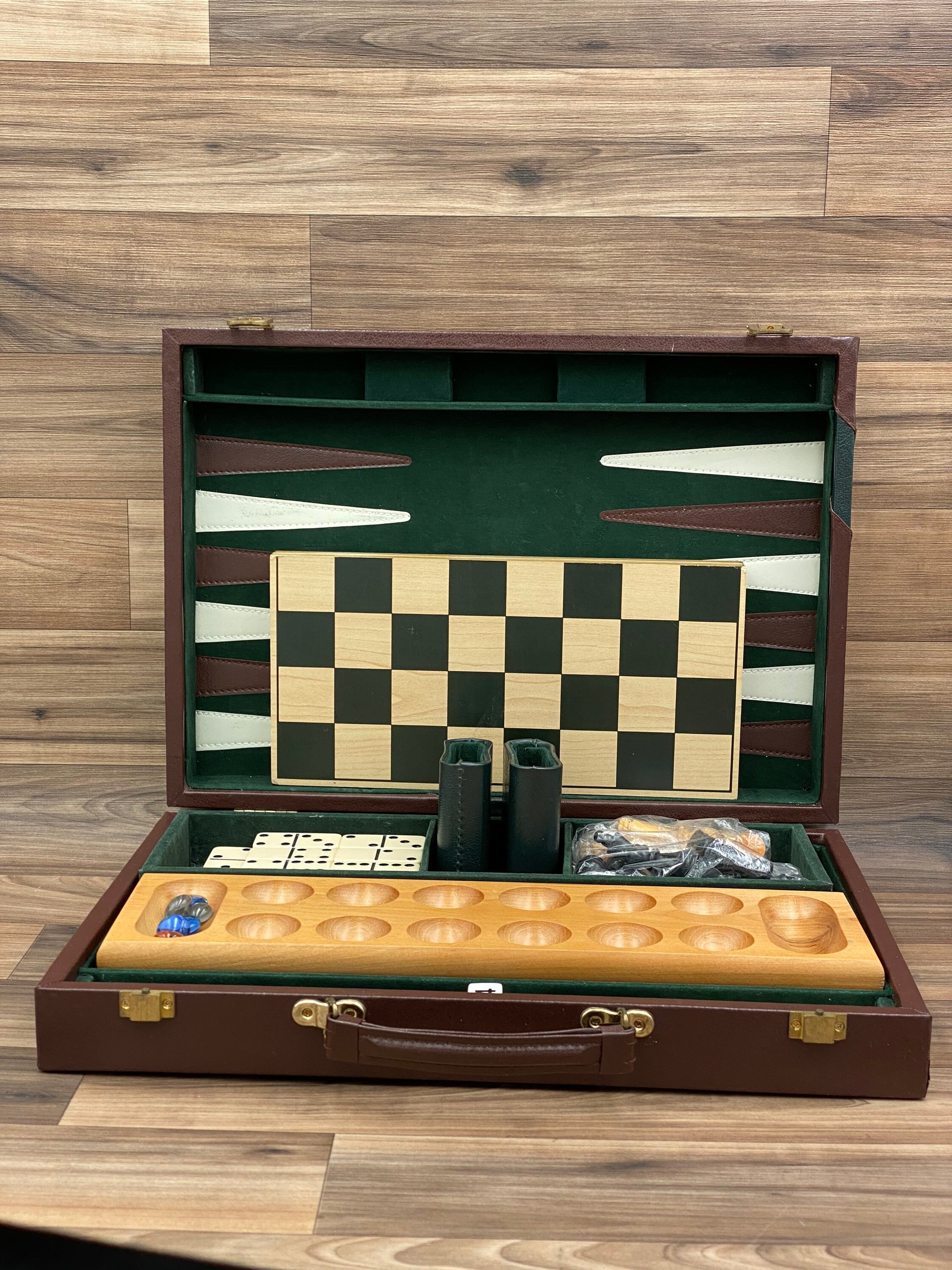 This is a Vintage 6 in 1 Game Set in a vinyl Maroon and Green Attaché carrying case. The case is lined in felt and has a tray for storage of the included pieces.