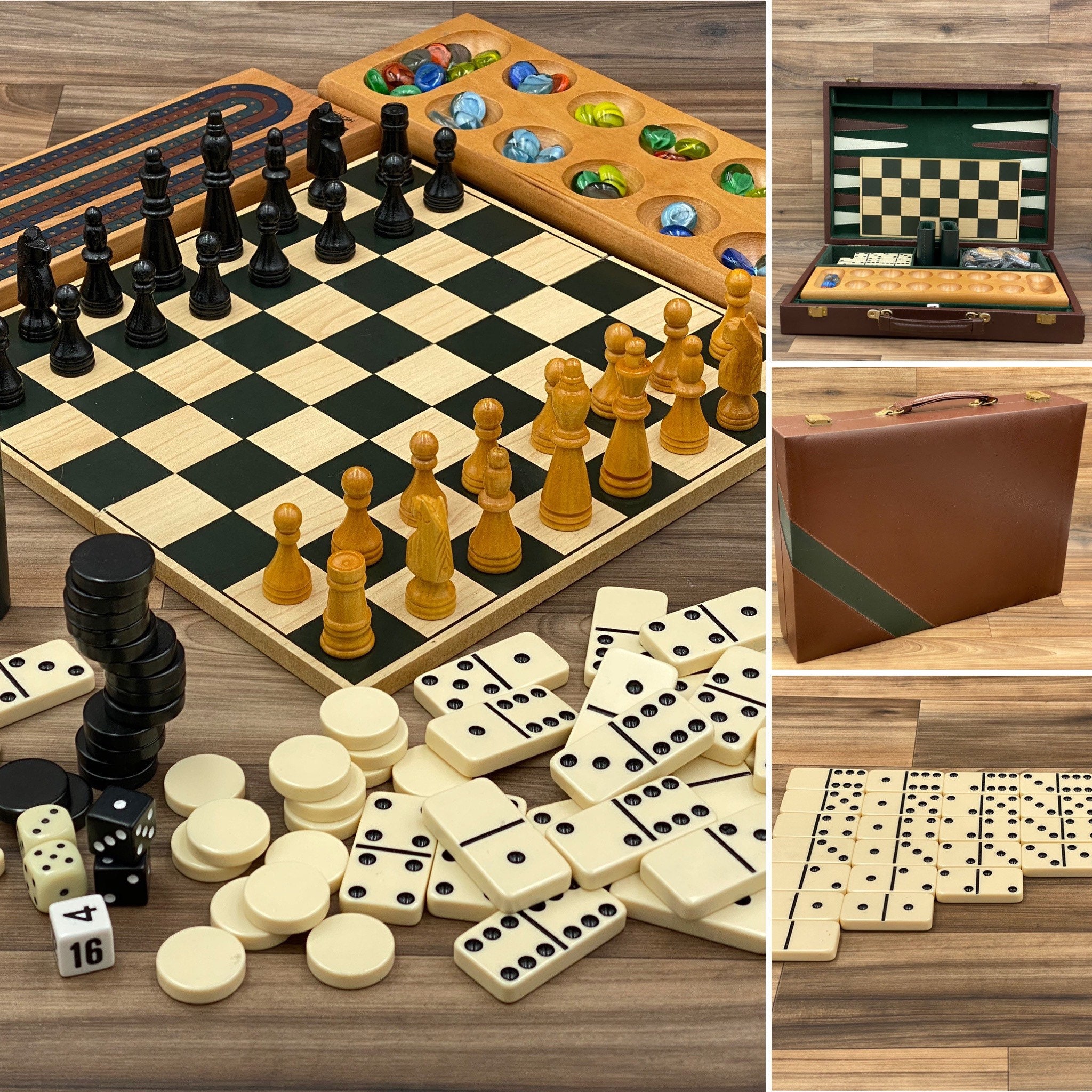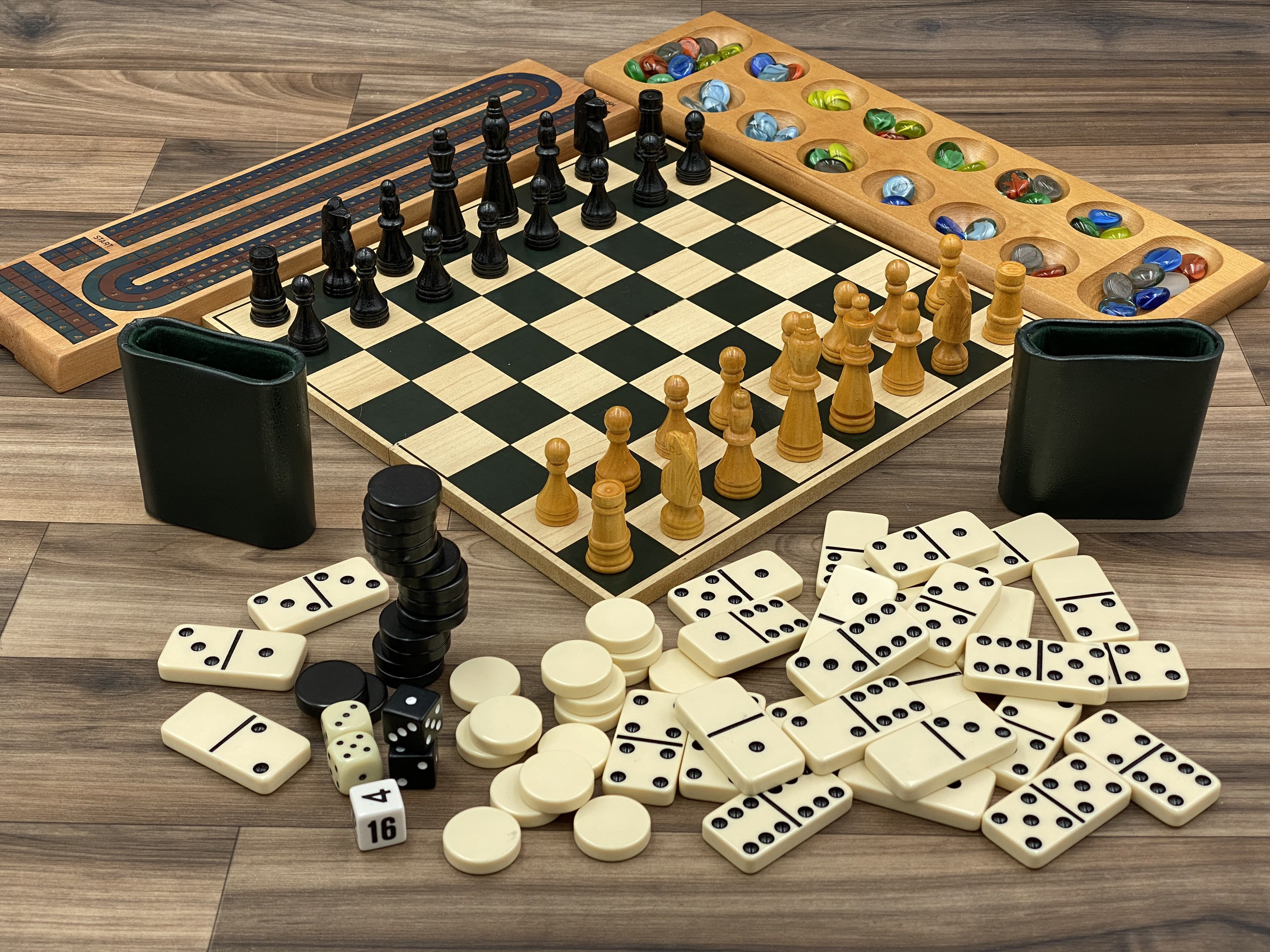The 6 Games included Mancala, Backgammon, Chess, Checkers, Double Six Dominoes, cribbage.
