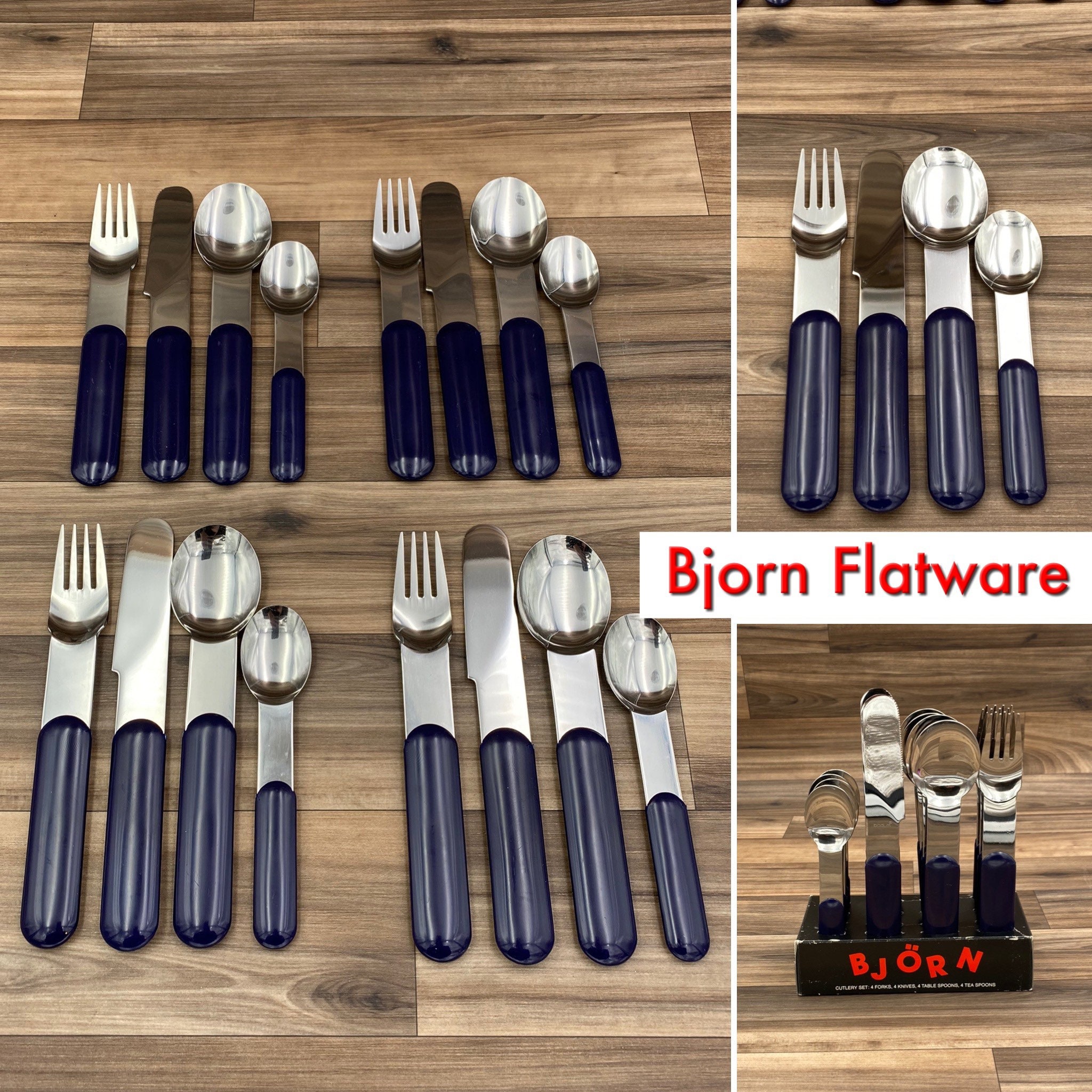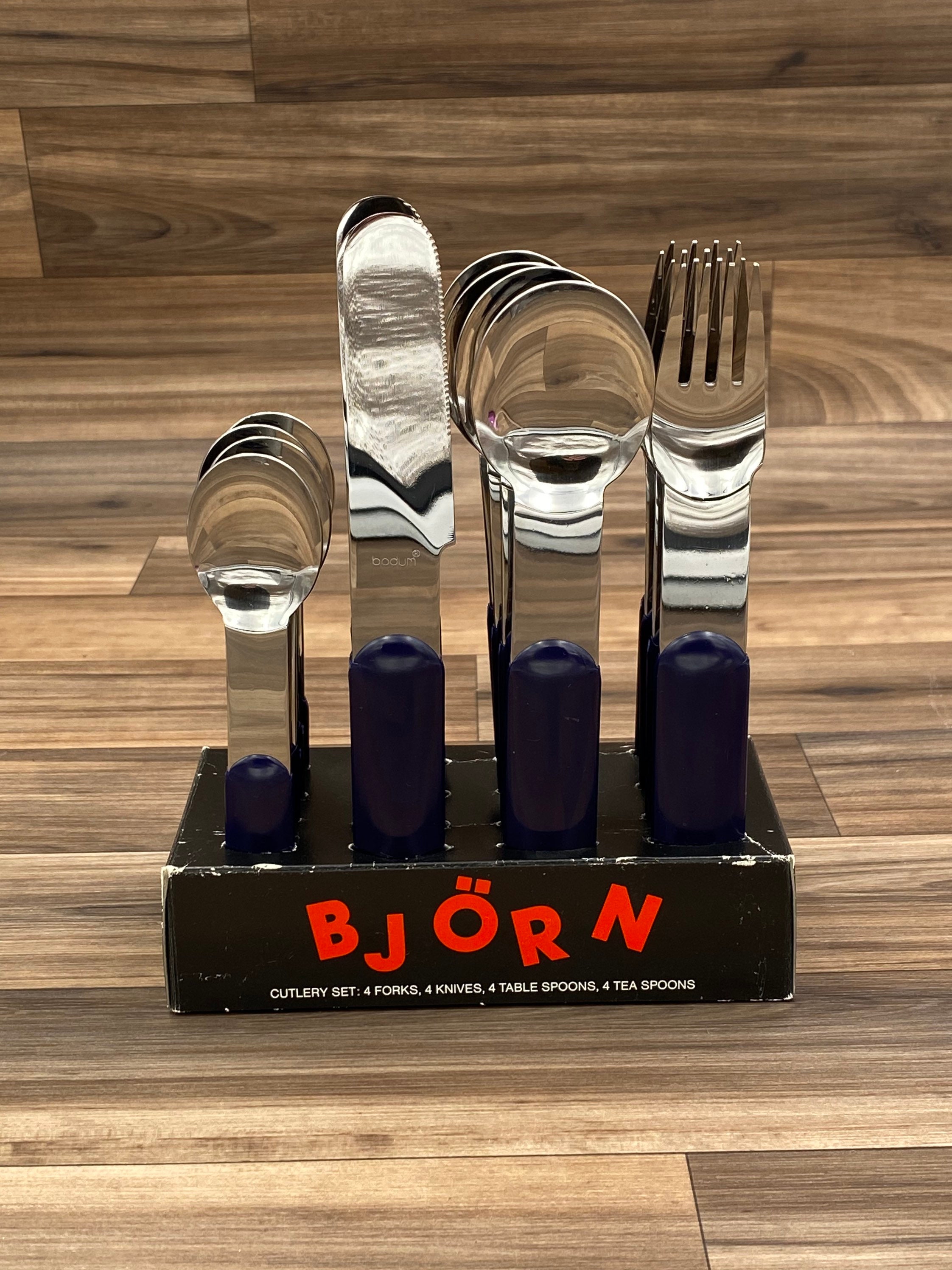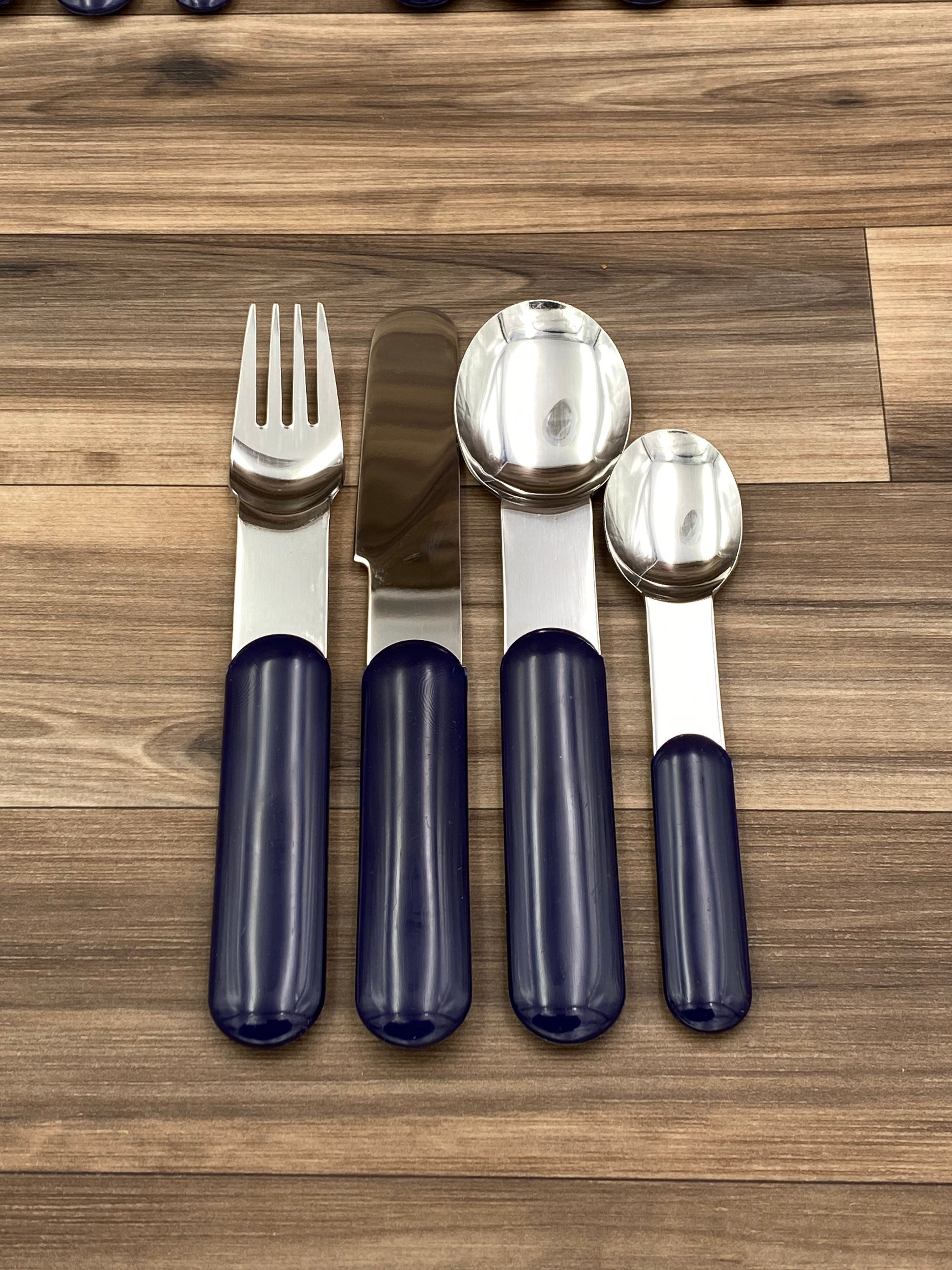 This is a Vintage set of Bjorn Stainless flatware with Navy Blue colored Handles. It is in a minimalist Style. Made in Switzerland by Bodum for the designer Store Conran's. It is perfect for Outdoor entertaining, a cabin, fishing lodge, Vintage Trailer or Glamping! This set would be great for tucking in a picnic basket.
