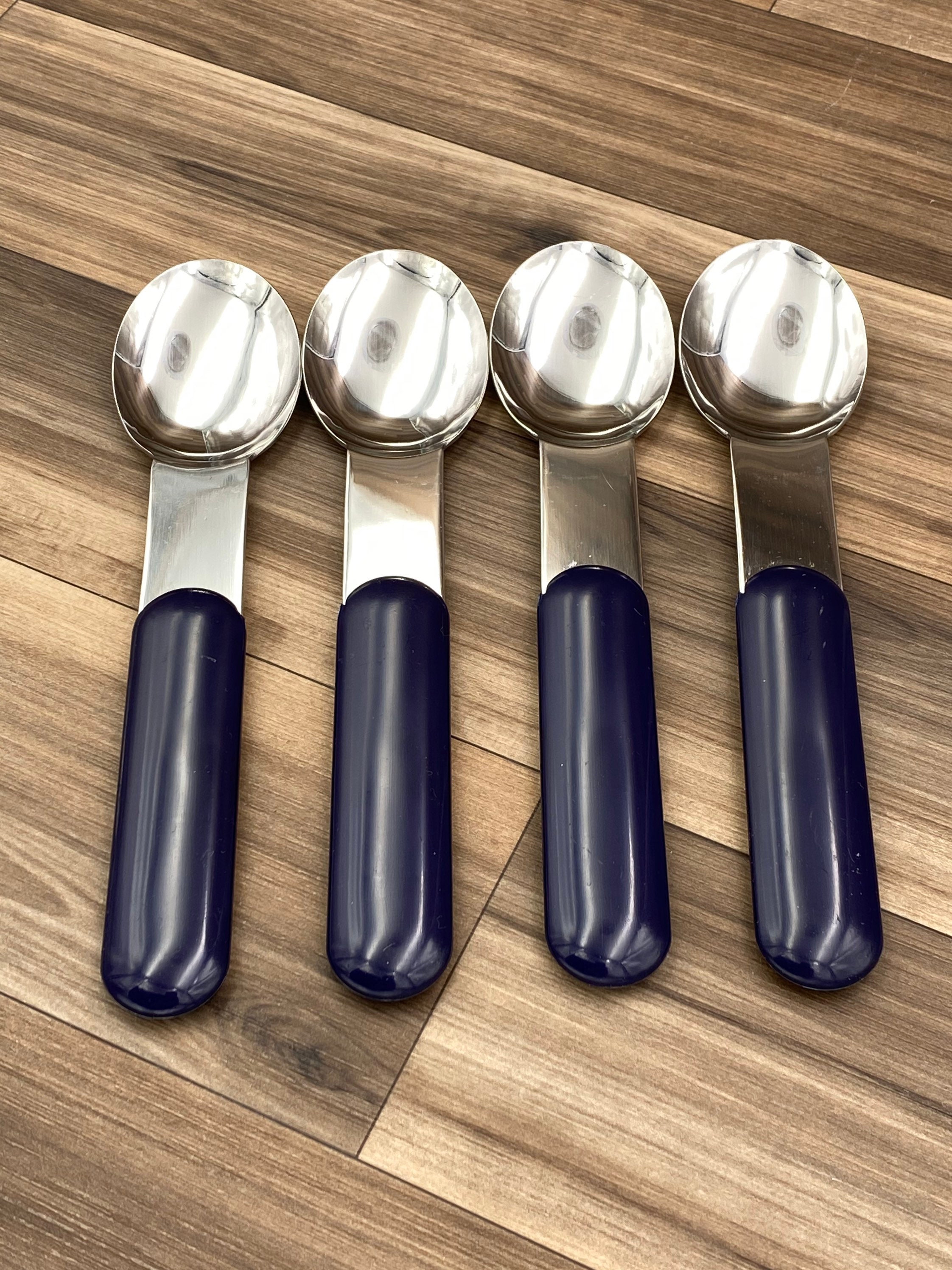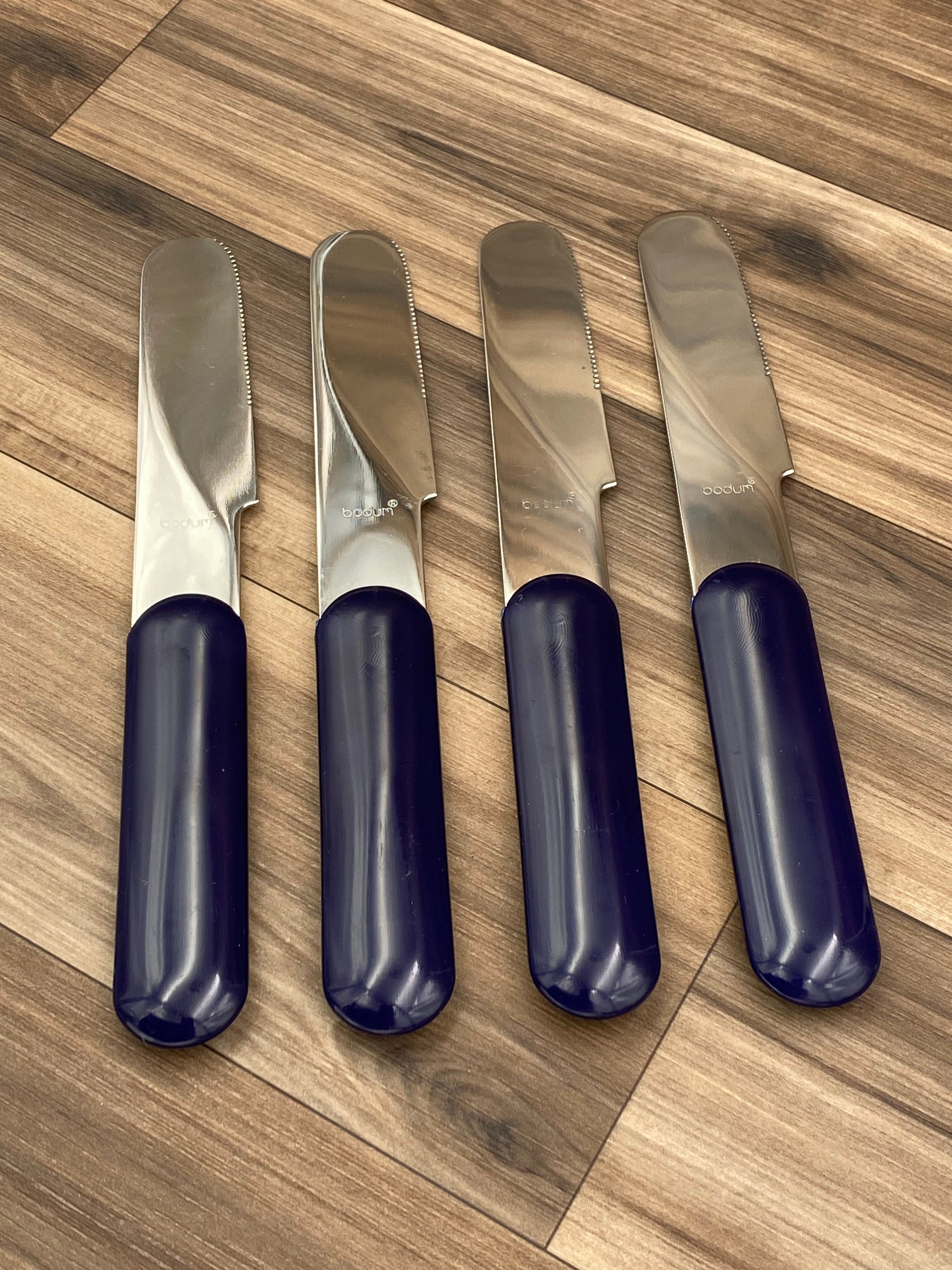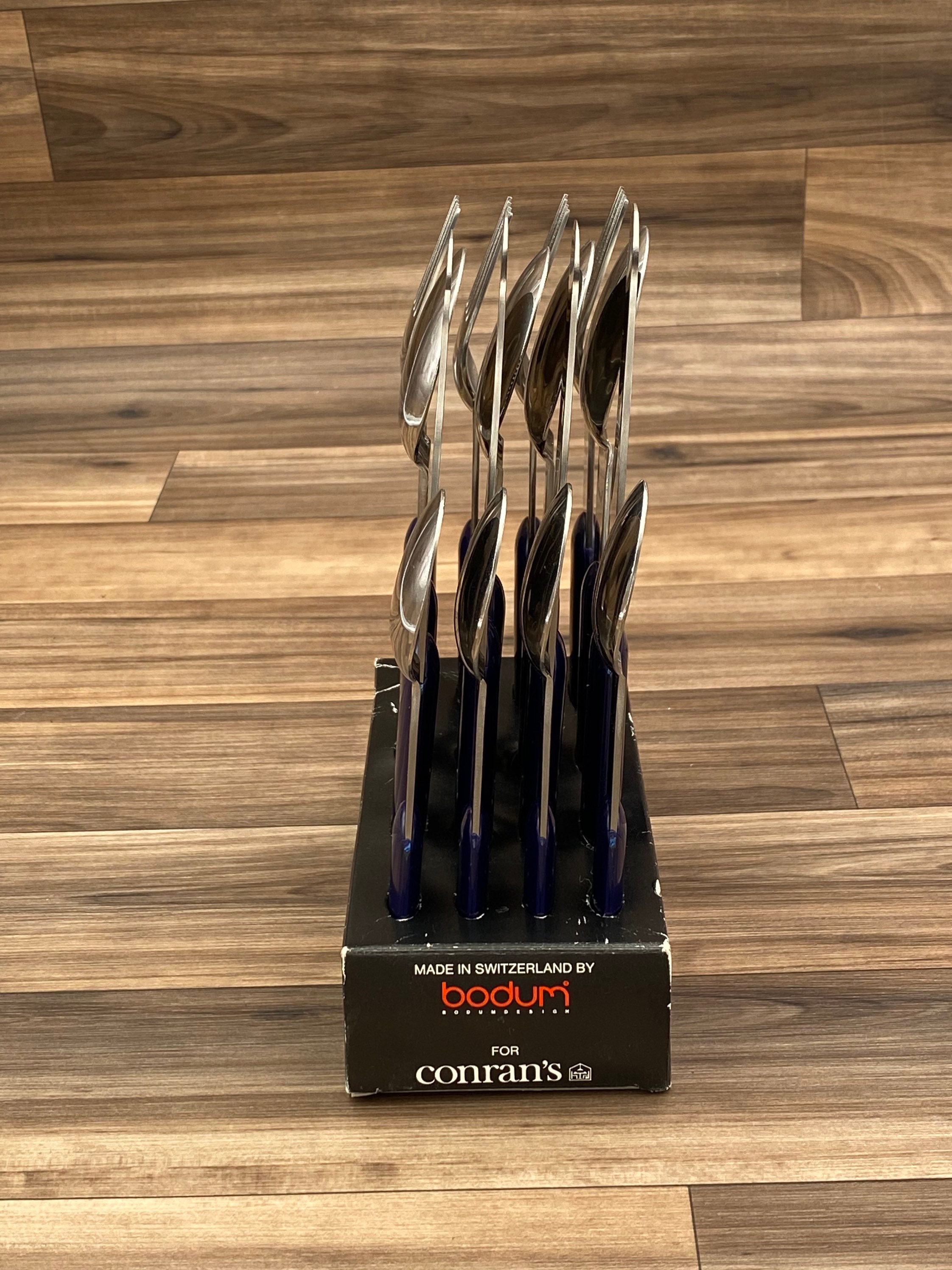 This is a Vintage set of Bjorn Stainless flatware with Navy Blue colored Handles. It is in a minimalist Style. Made in Switzerland by Bodum for the designer Store Conran's. It is perfect for Outdoor entertaining, a cabin, fishing lodge, Vintage Trailer or Glamping! This set would be great for tucking in a picnic basket.