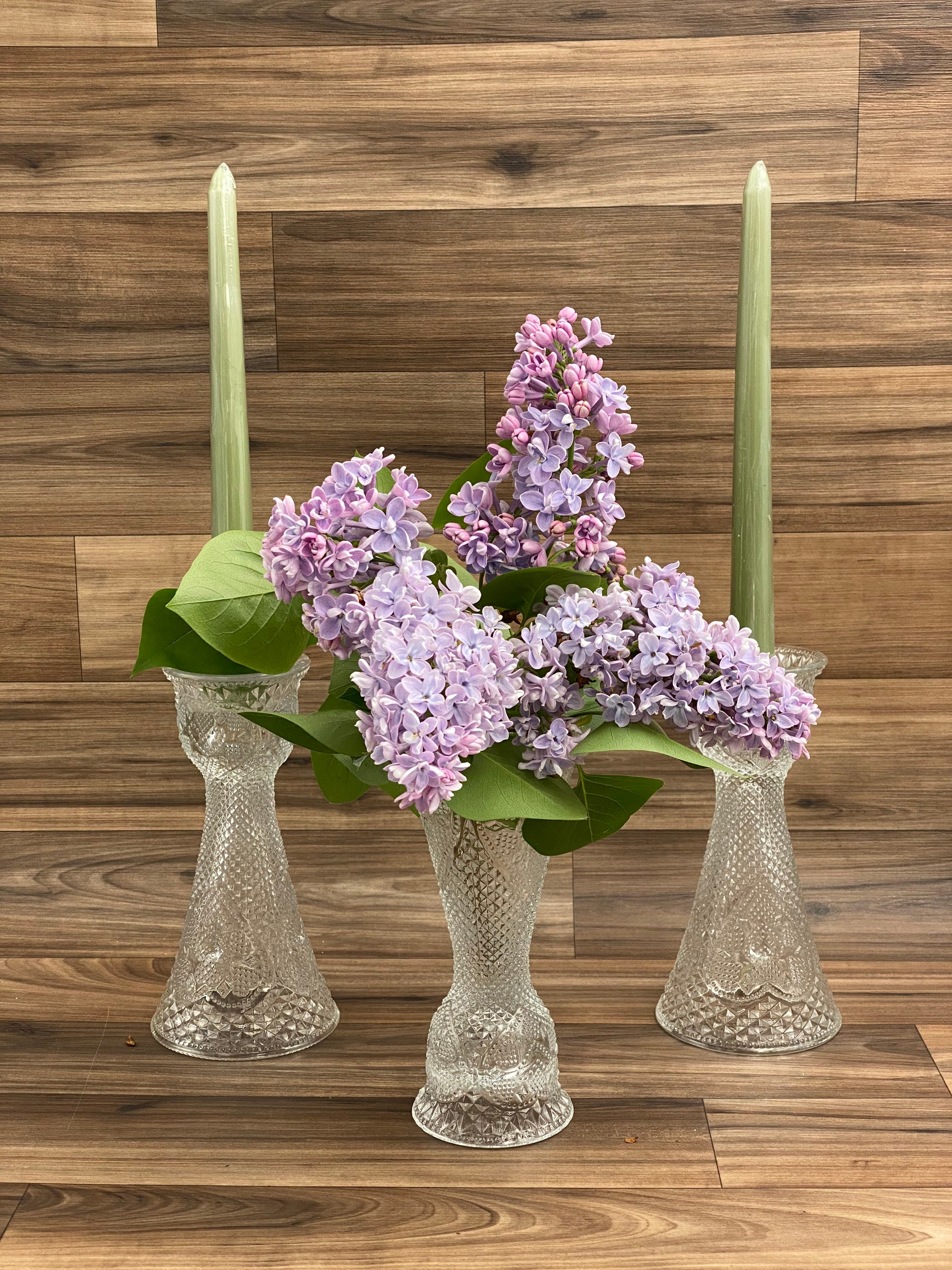 This is a set of 3 Vintage candlestick holders/vases by Fostoria for Avon. It as made in 1979 of pressed glass in a country kitchen style diamond point with hearts.