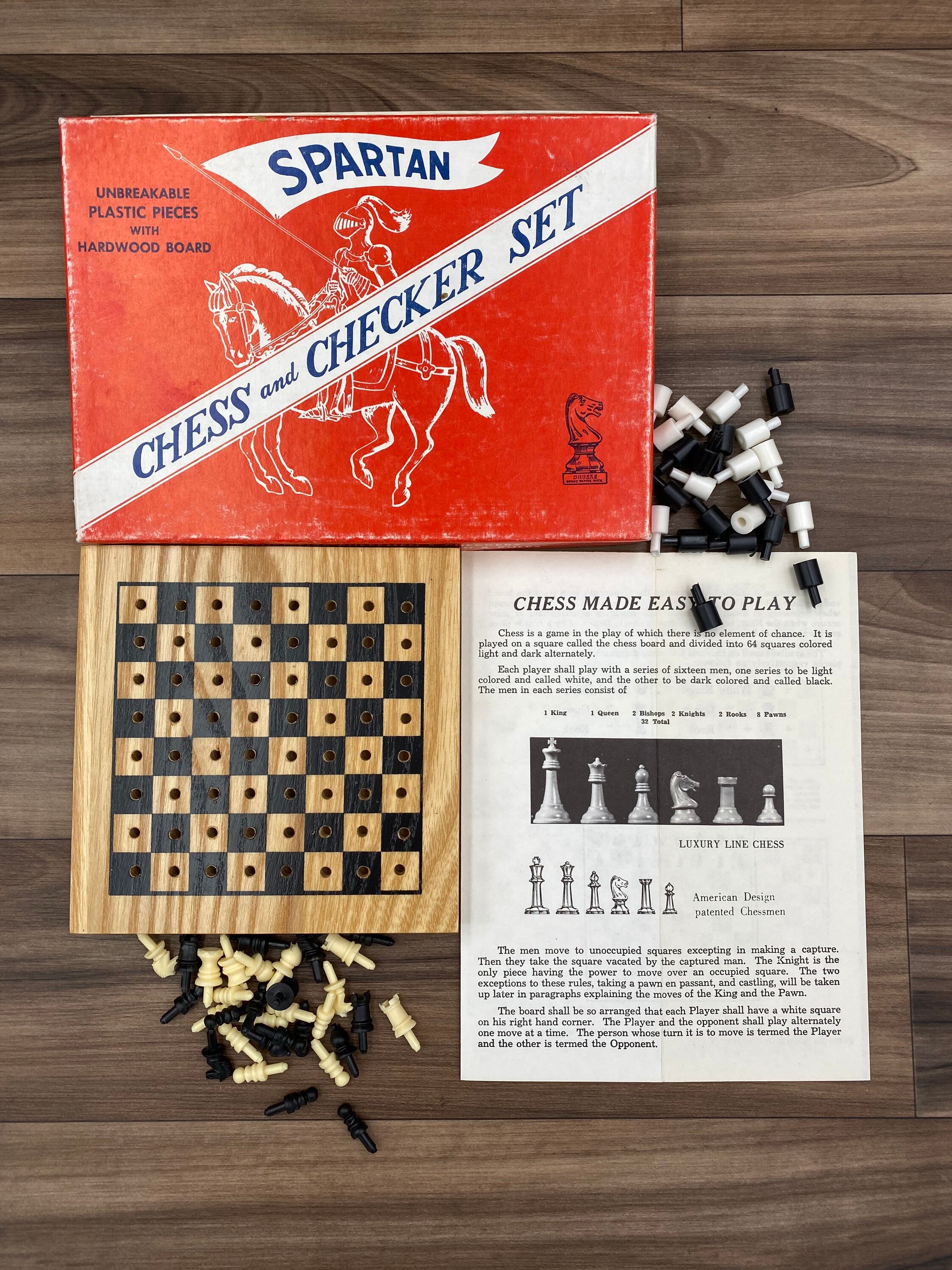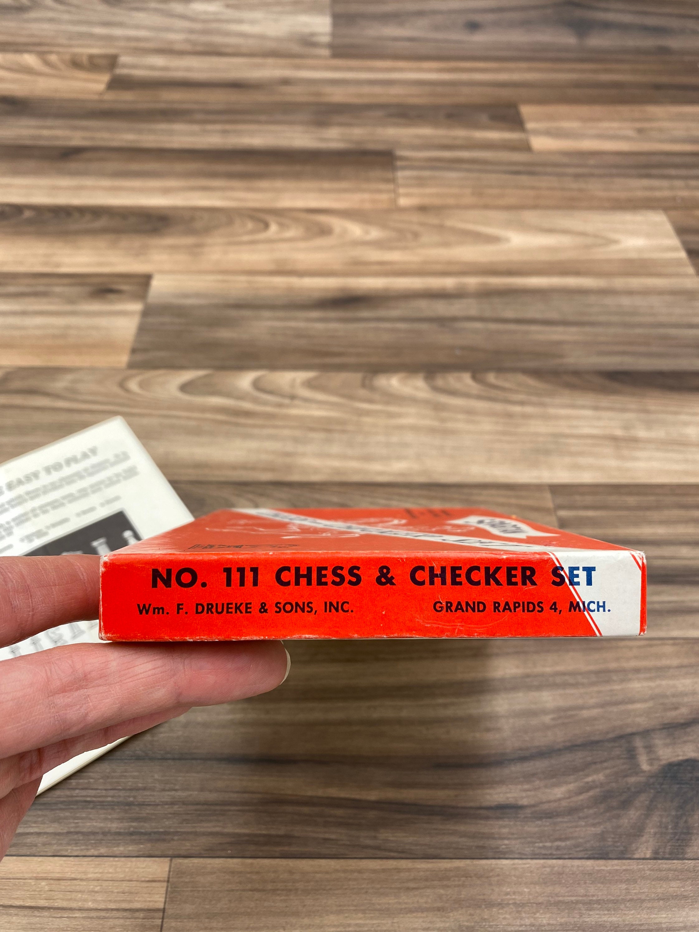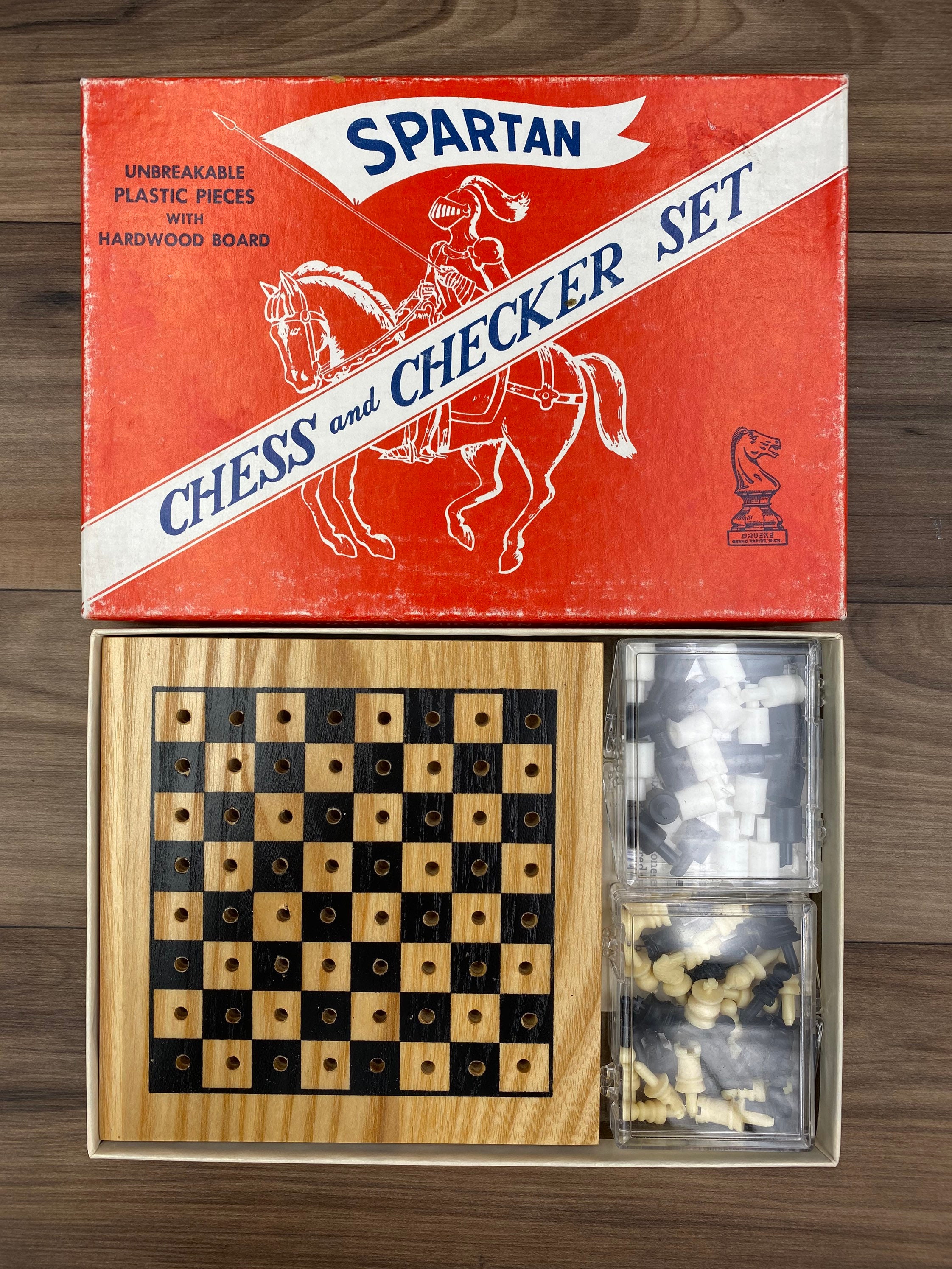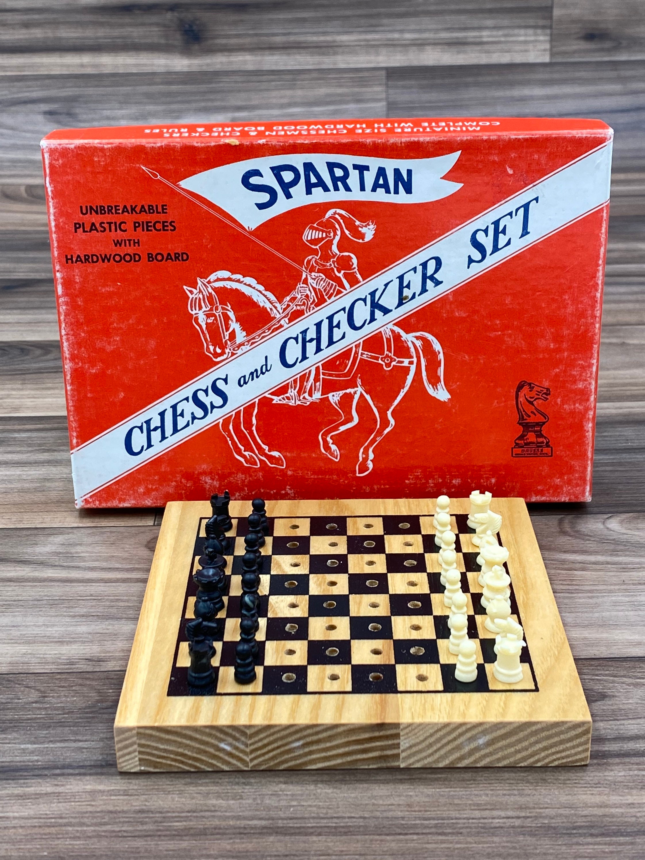 This is a Fabulous Vintage Spartan Drueke model 111 MINI Travel Chess set. It has tiny Chessmen and checkers with peg bases. The box claims they are made of unbreakable plastic. The board is made of hardwood.