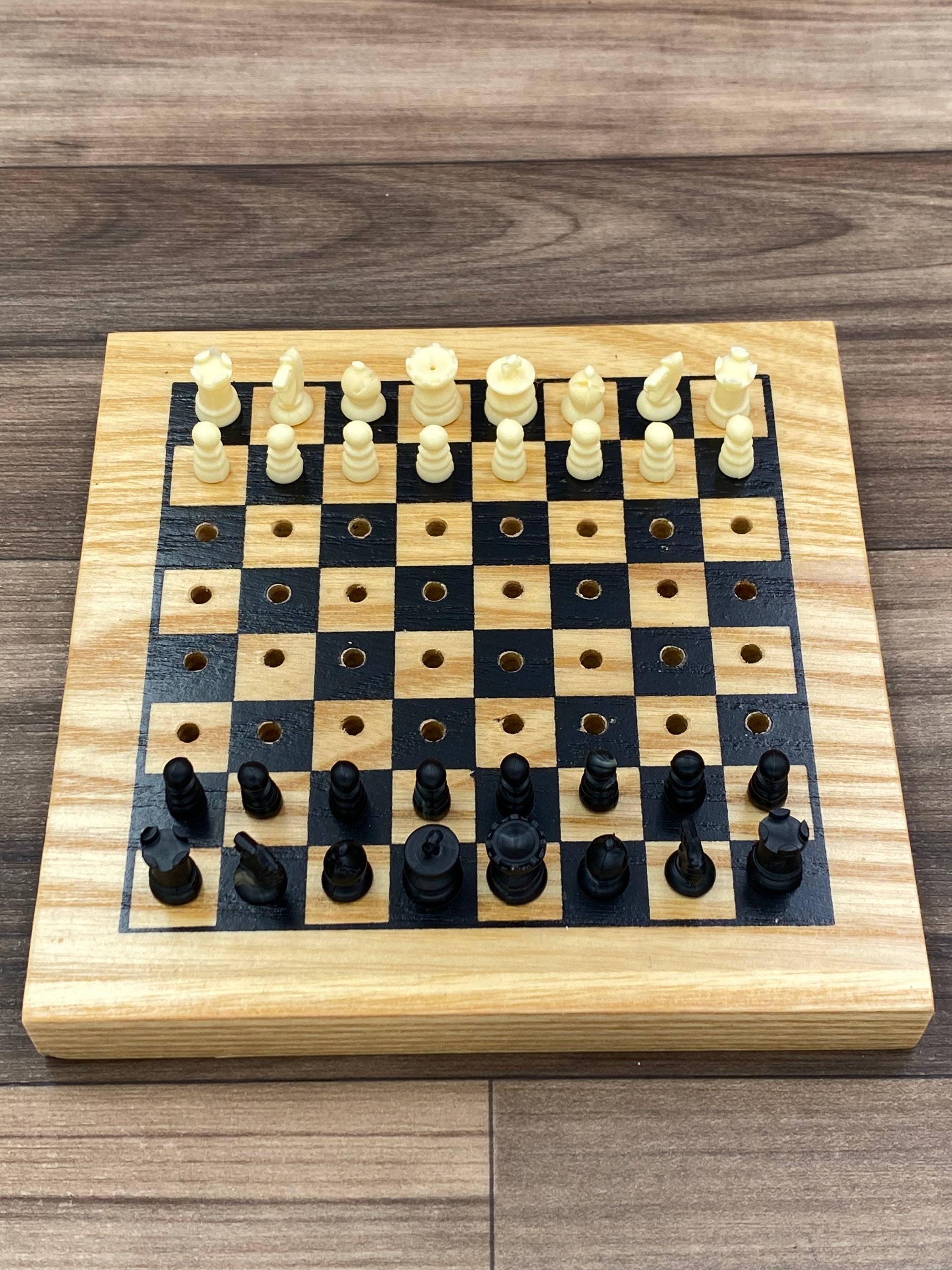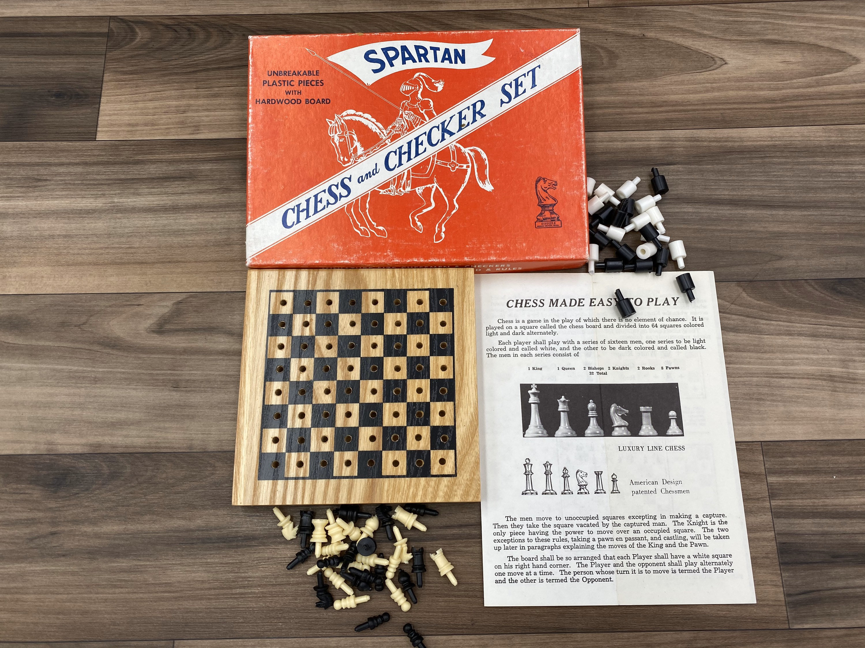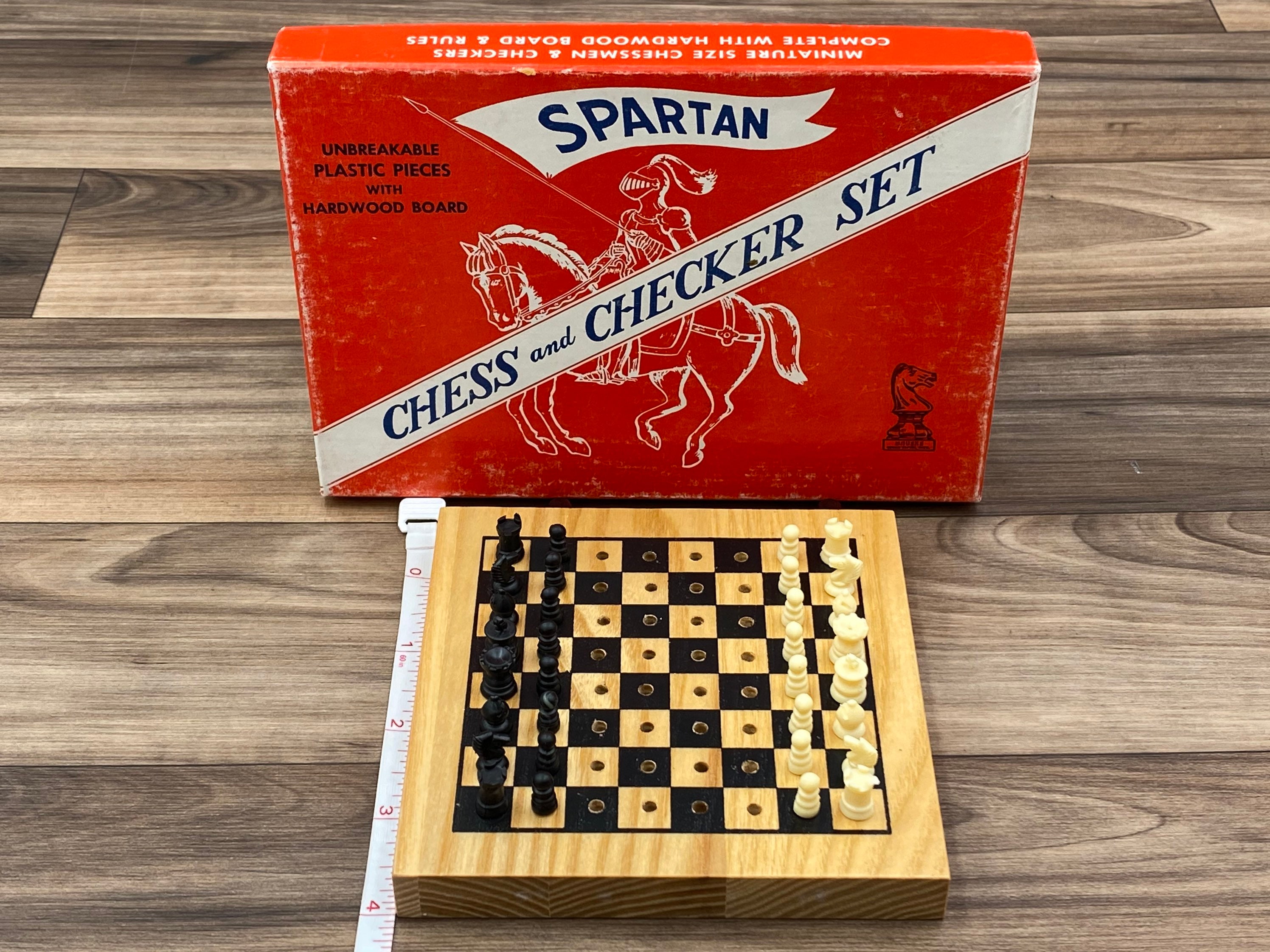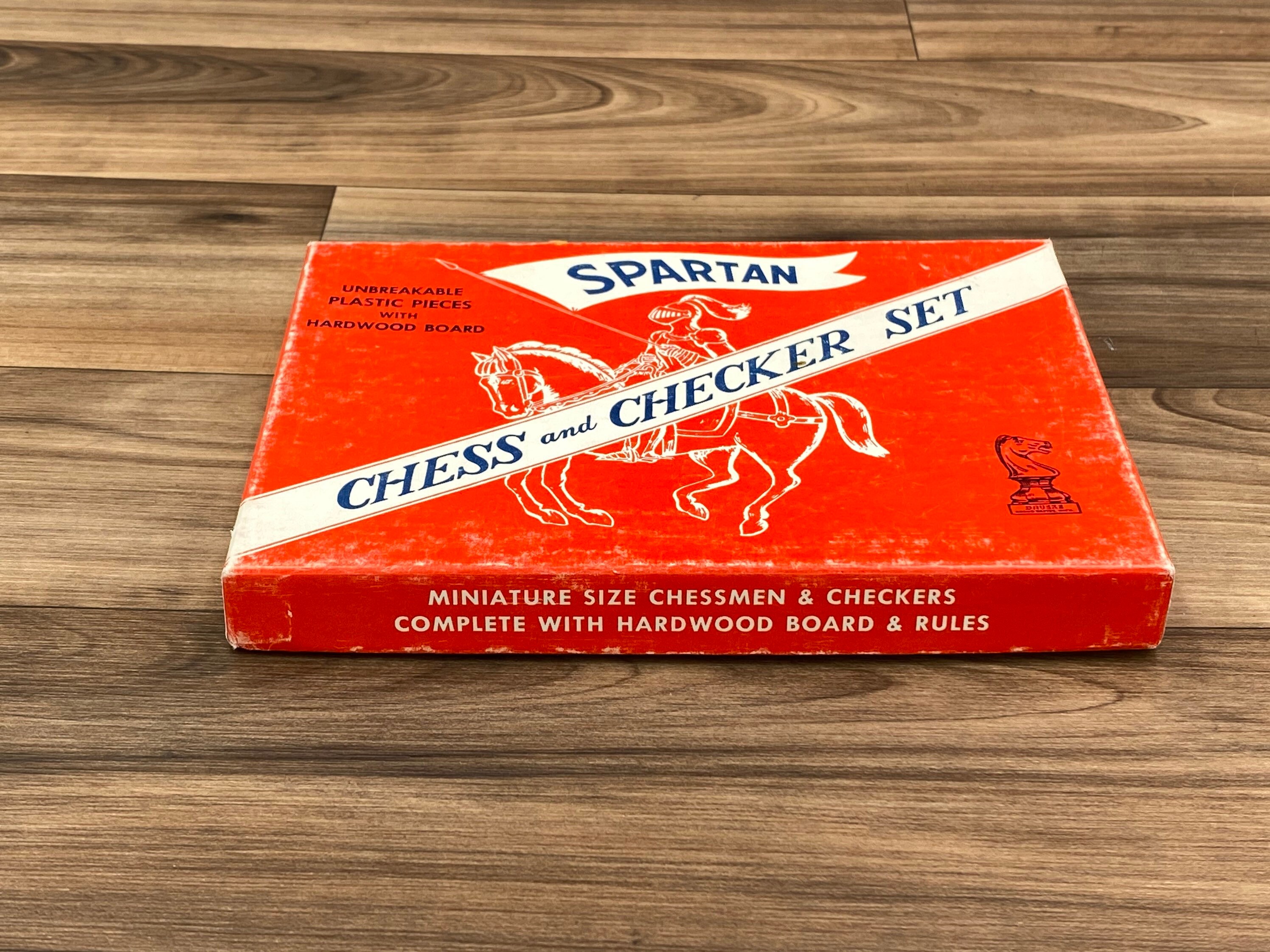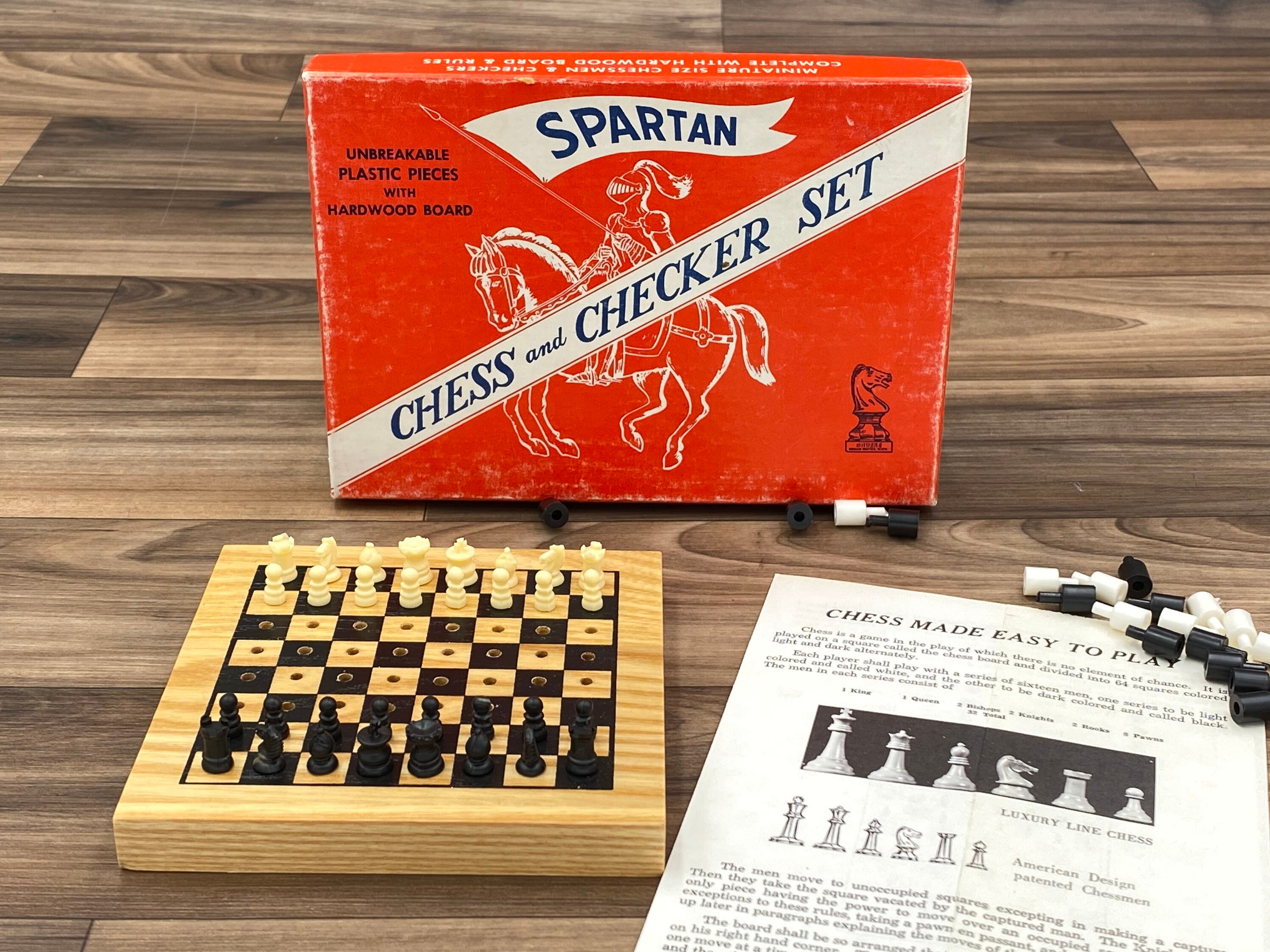 This is a Fabulous Vintage Spartan Drueke model 111 MINI Travel Chess set. It has tiny Chessmen and checkers with peg bases. The box claims they are made of unbreakable plastic. The board is made of hardwood.