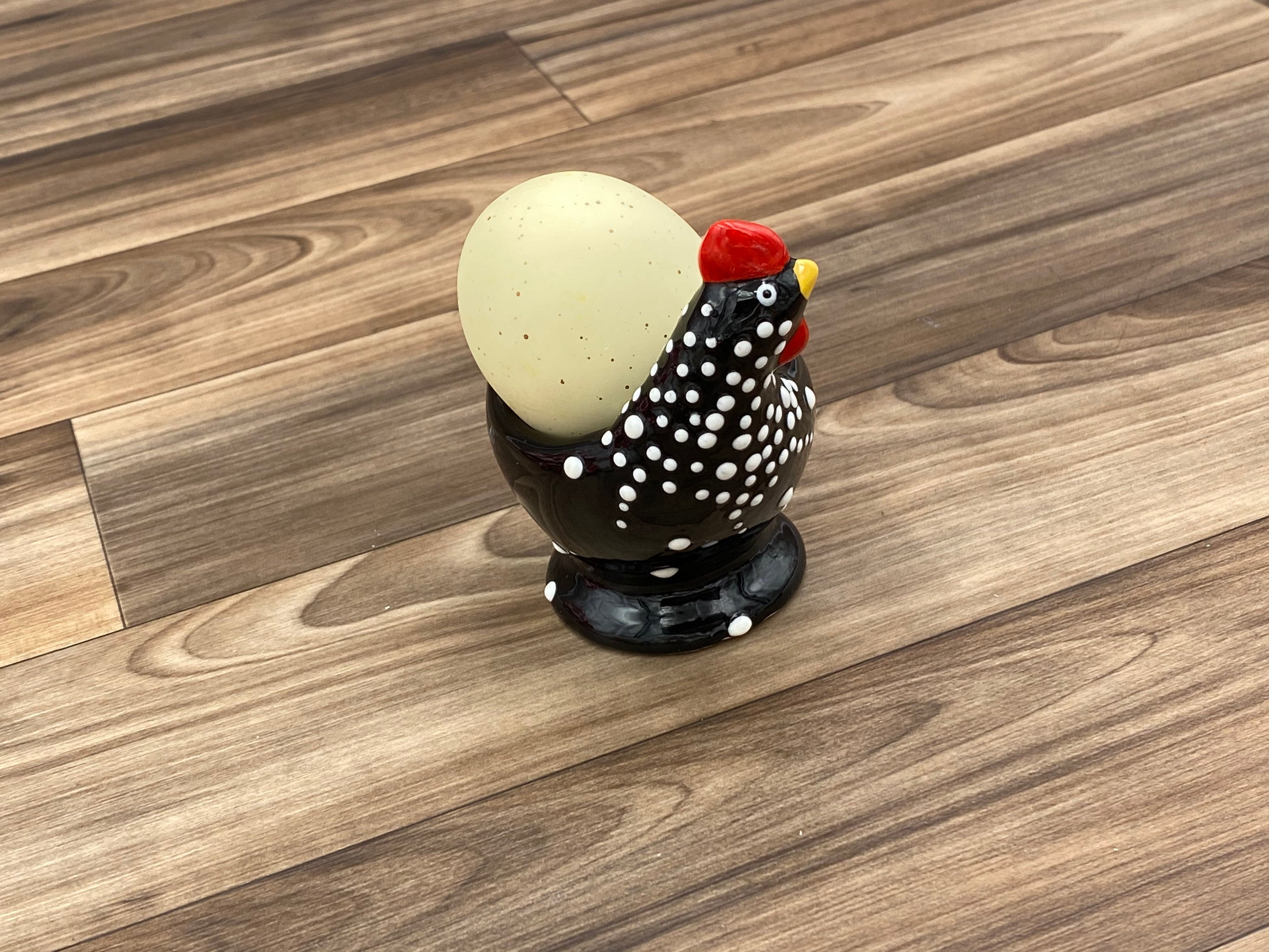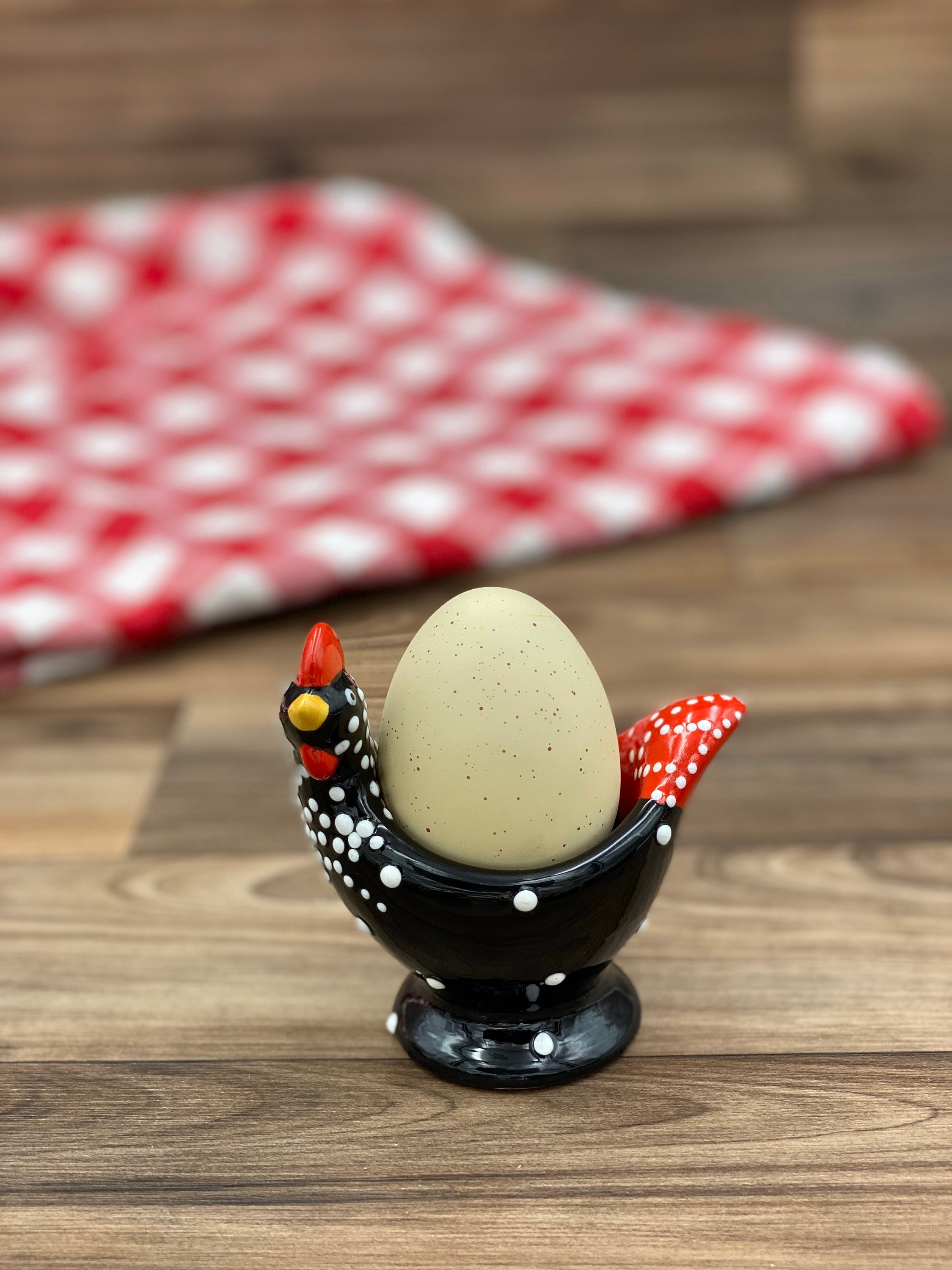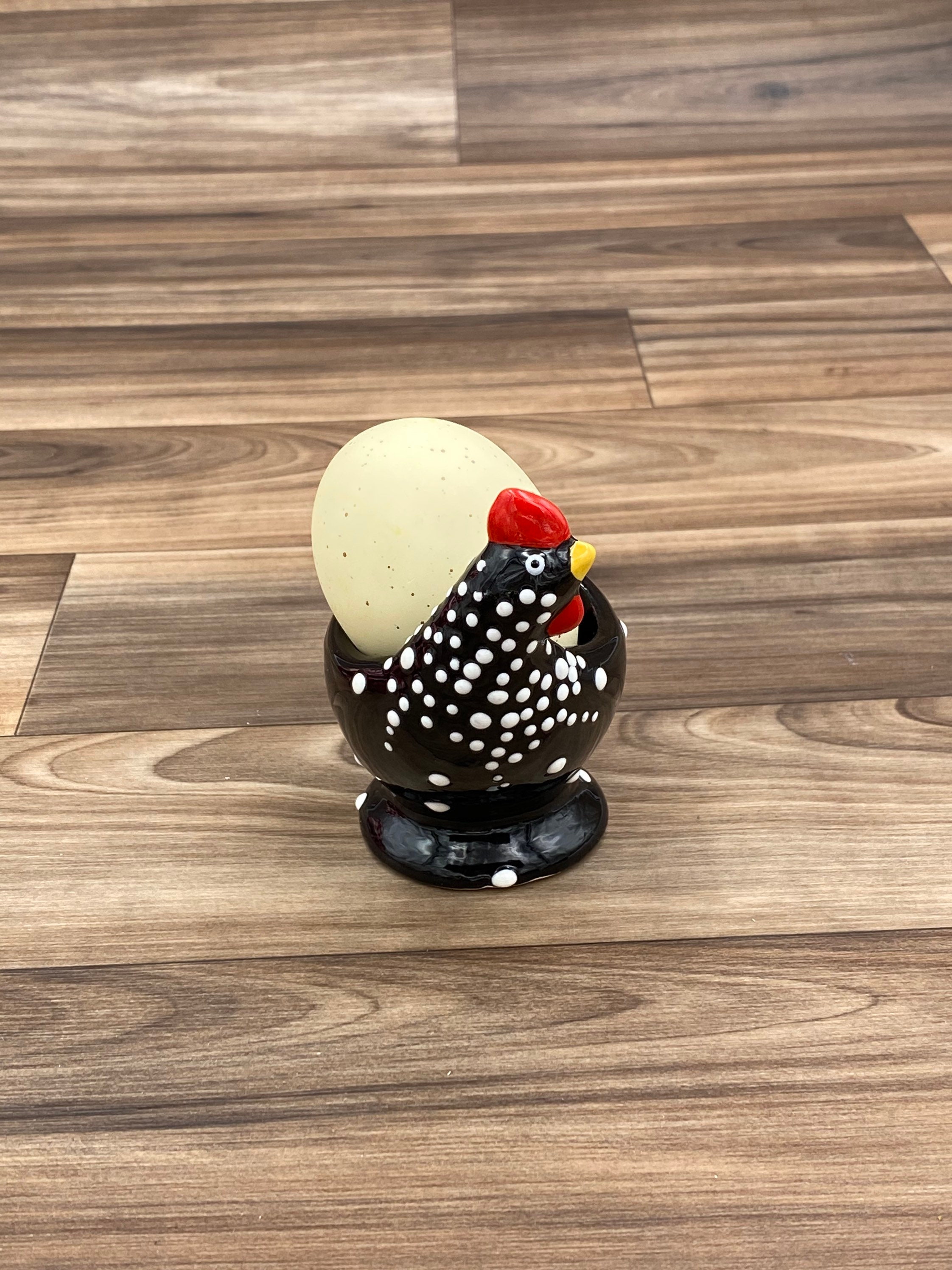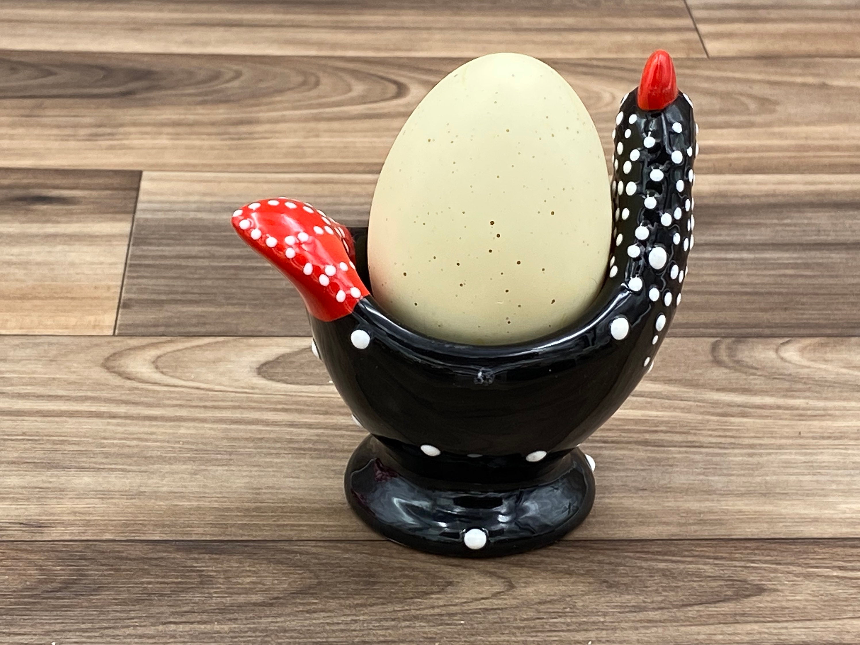 This is an adorable ceramic Chicken egg cup. It is black with white spots, a red crown and tail feathers, and a place to hold an egg! Pretty cute! Perfect to add color to a Rustic Farmhouse decor or country kitchen.