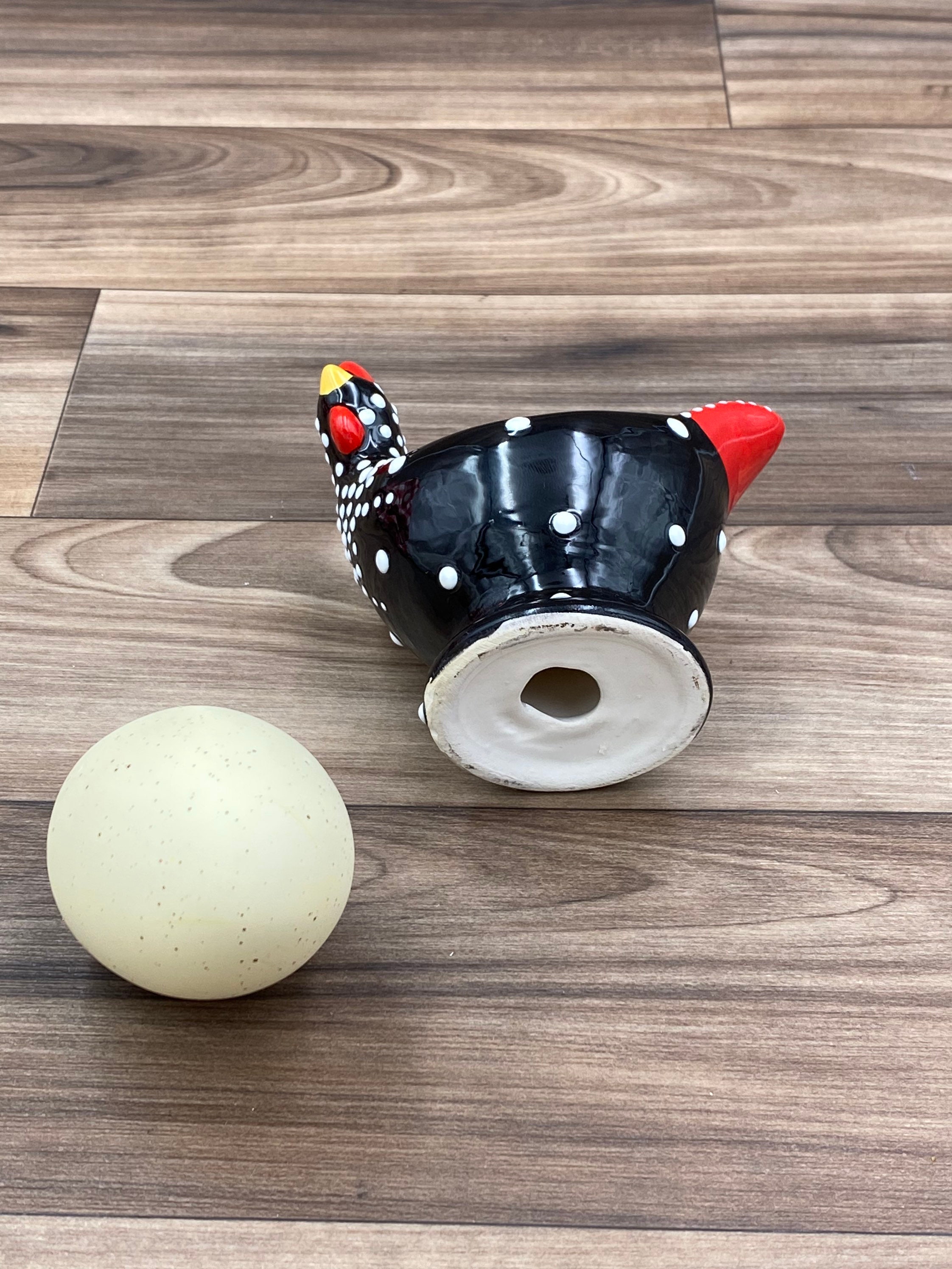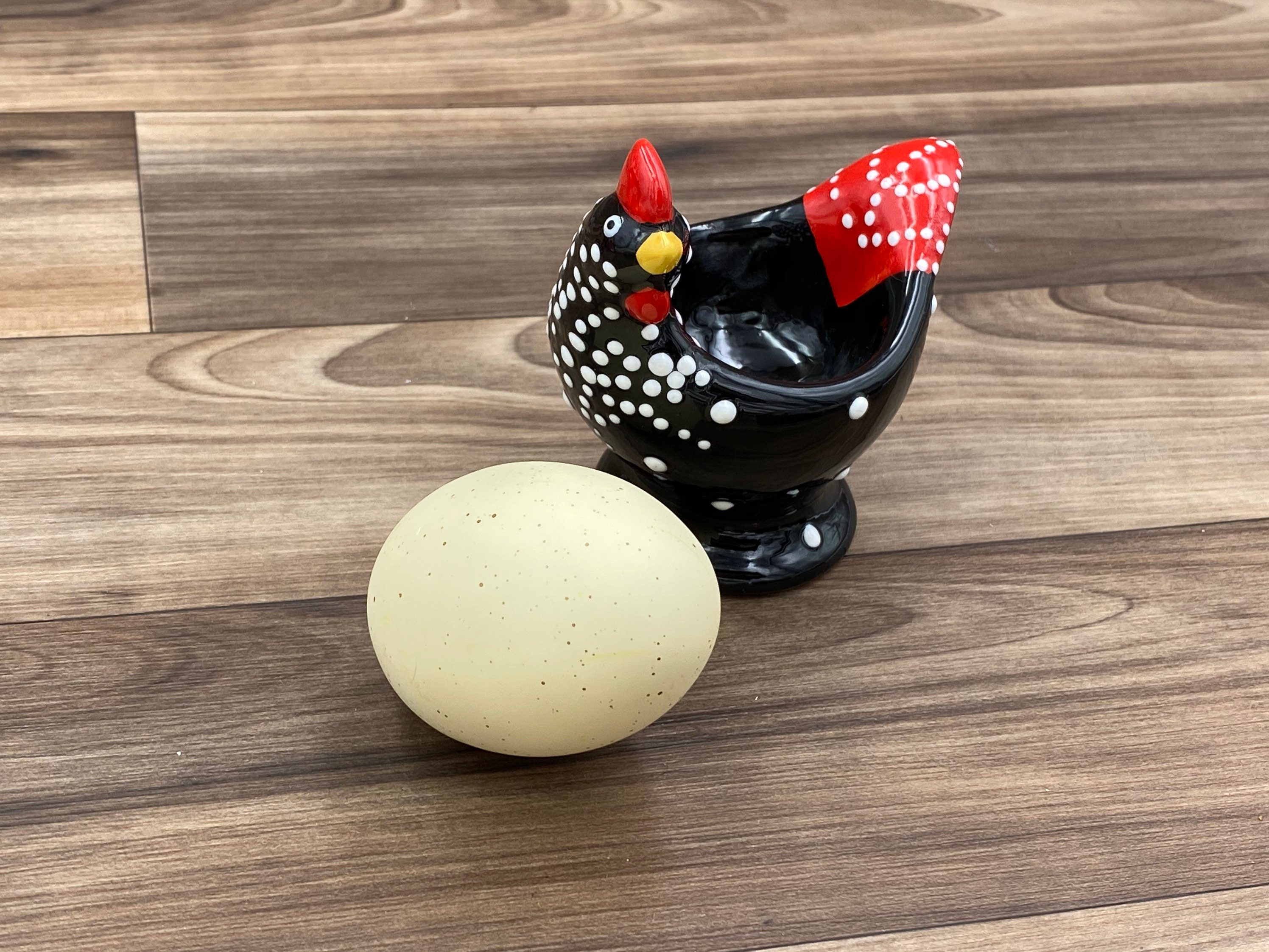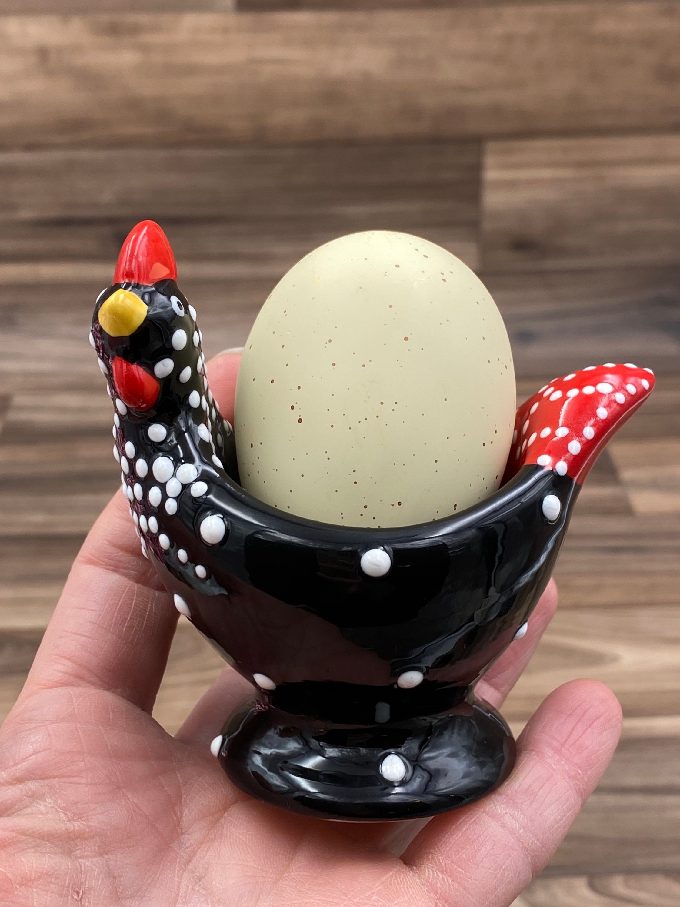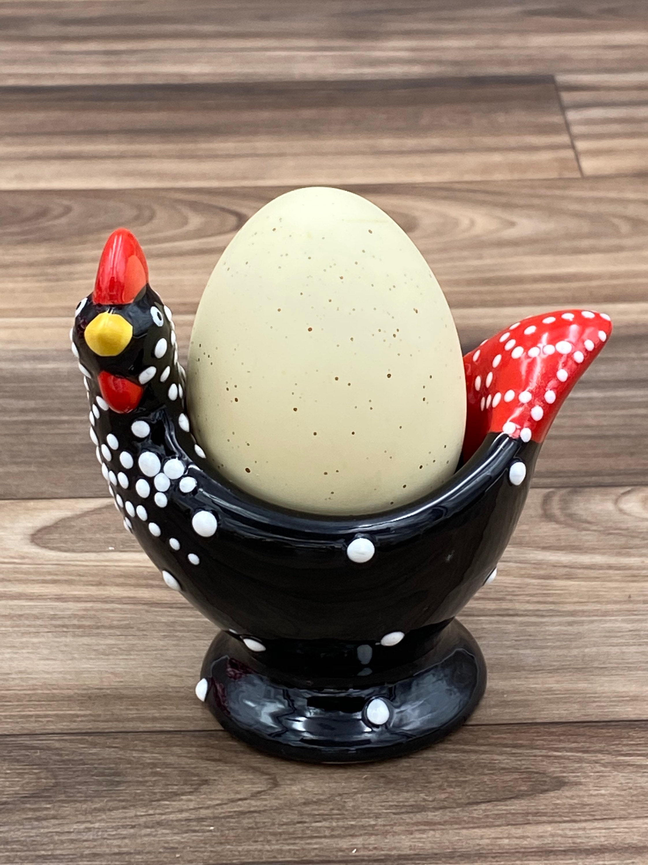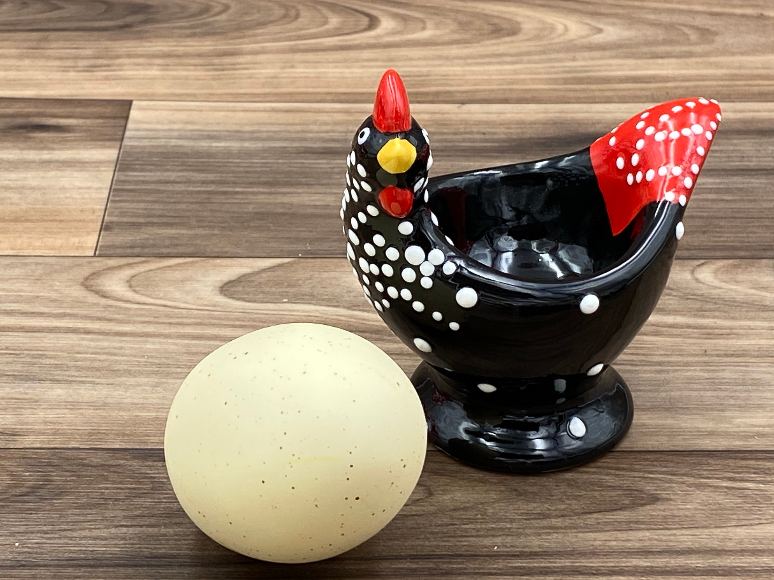 This is an adorable ceramic Chicken egg cup. It is black with white spots, a red crown and tail feathers, and a place to hold an egg! Pretty cute! Perfect to add color to a Rustic Farmhouse decor or country kitchen.