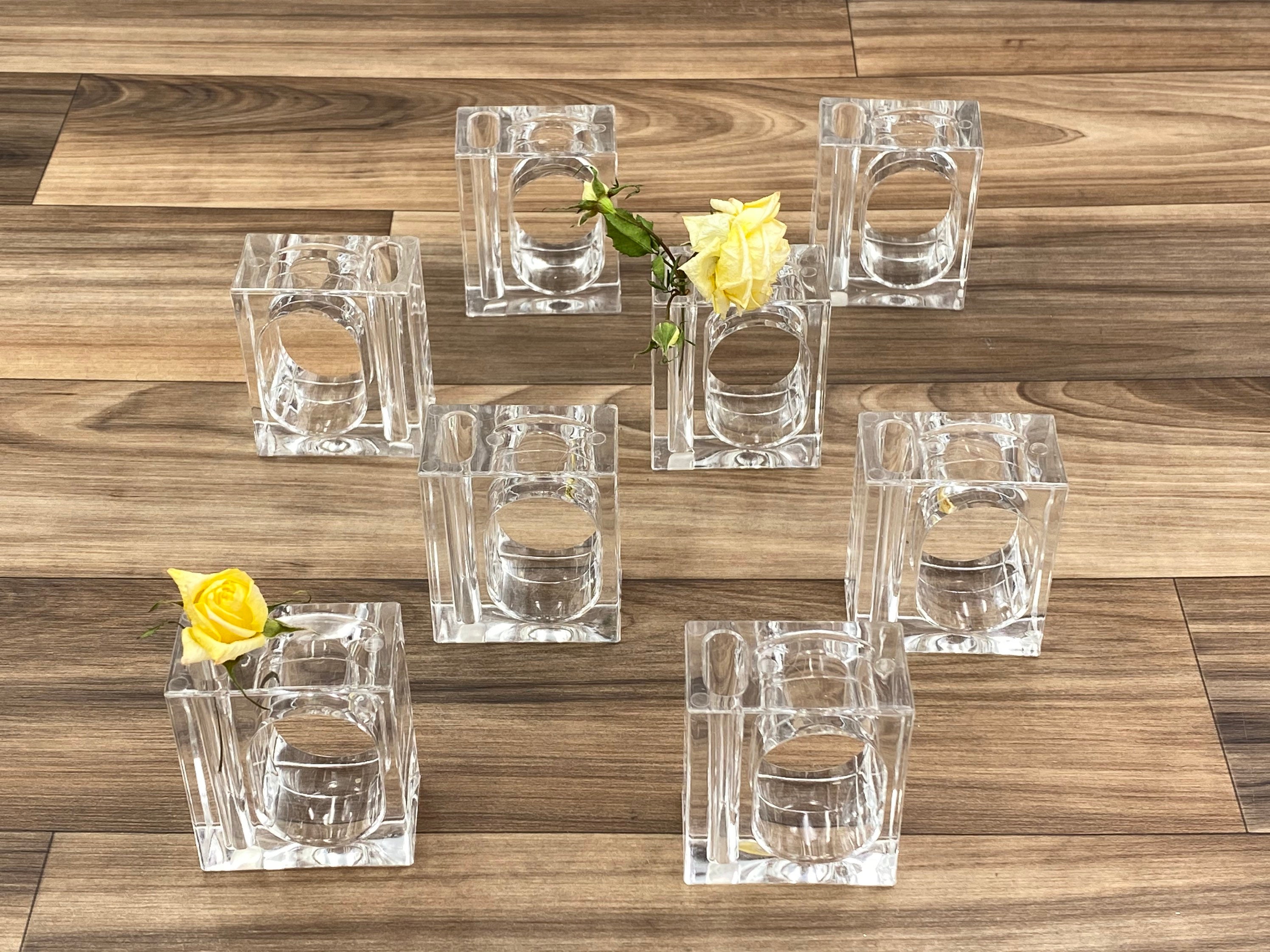 This is a set of Vintage Lillian Vernon Lucite napkin holders with bud vase. This is a complete set of 8 napkin rings. They are Crystal clear and new in the box.