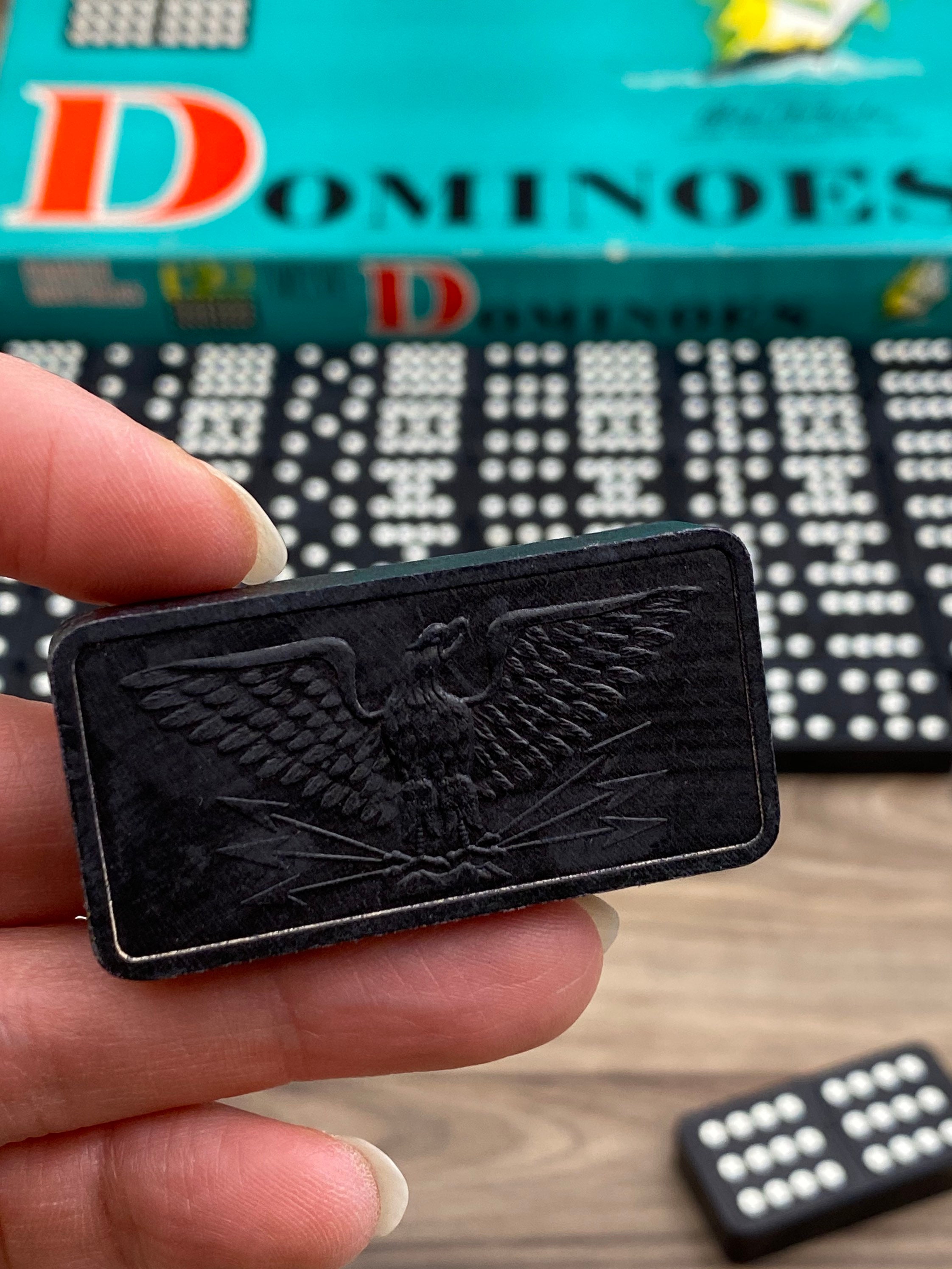 They are made of solid wood and have an embossed Eagle on the back of each domino.