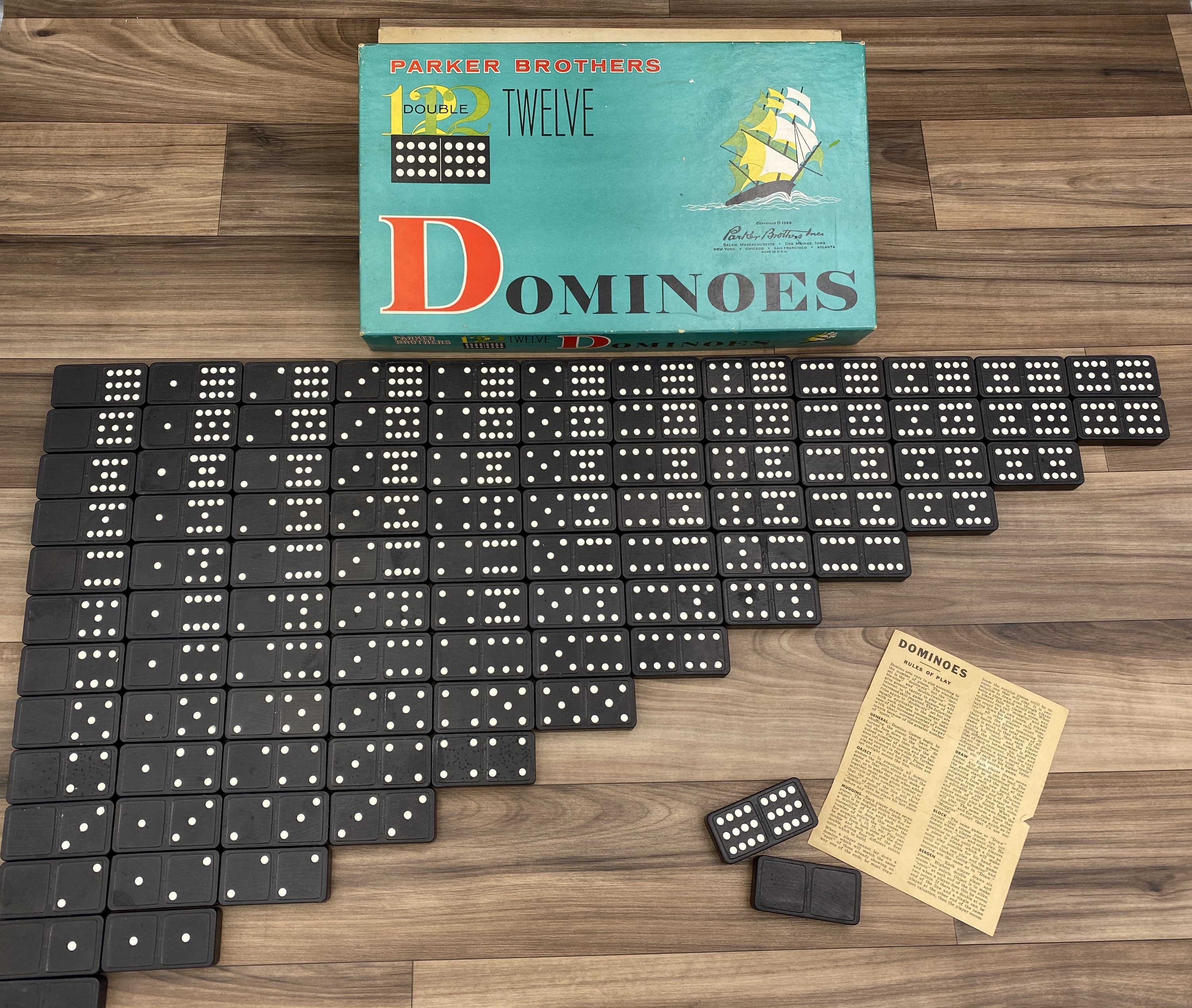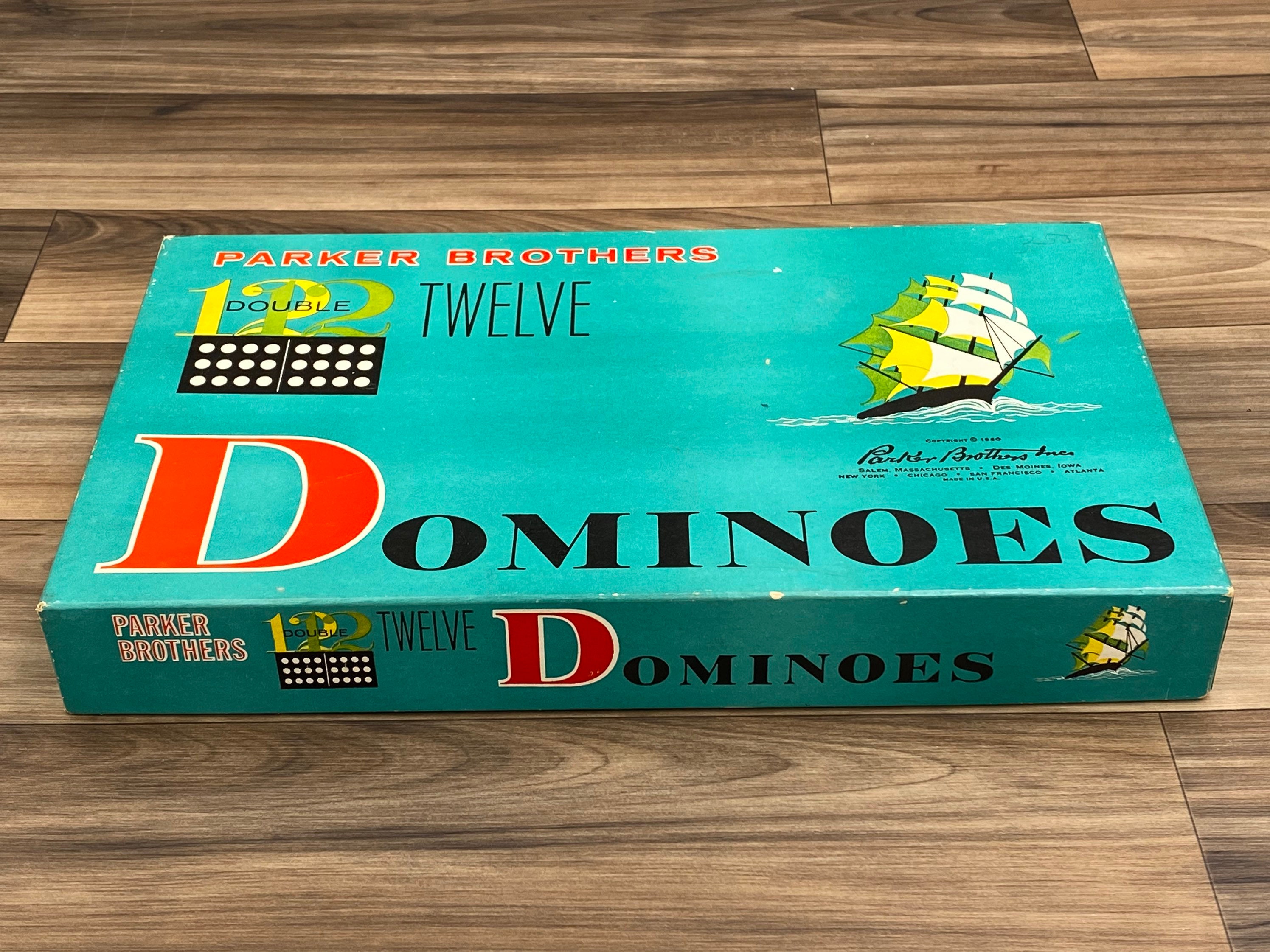 This is a large complete set of Double 12 Wooden Dominoes by Parker Bros. This set of Dominoes is contained on the original box. This Collectible Game is marked made in the USA.