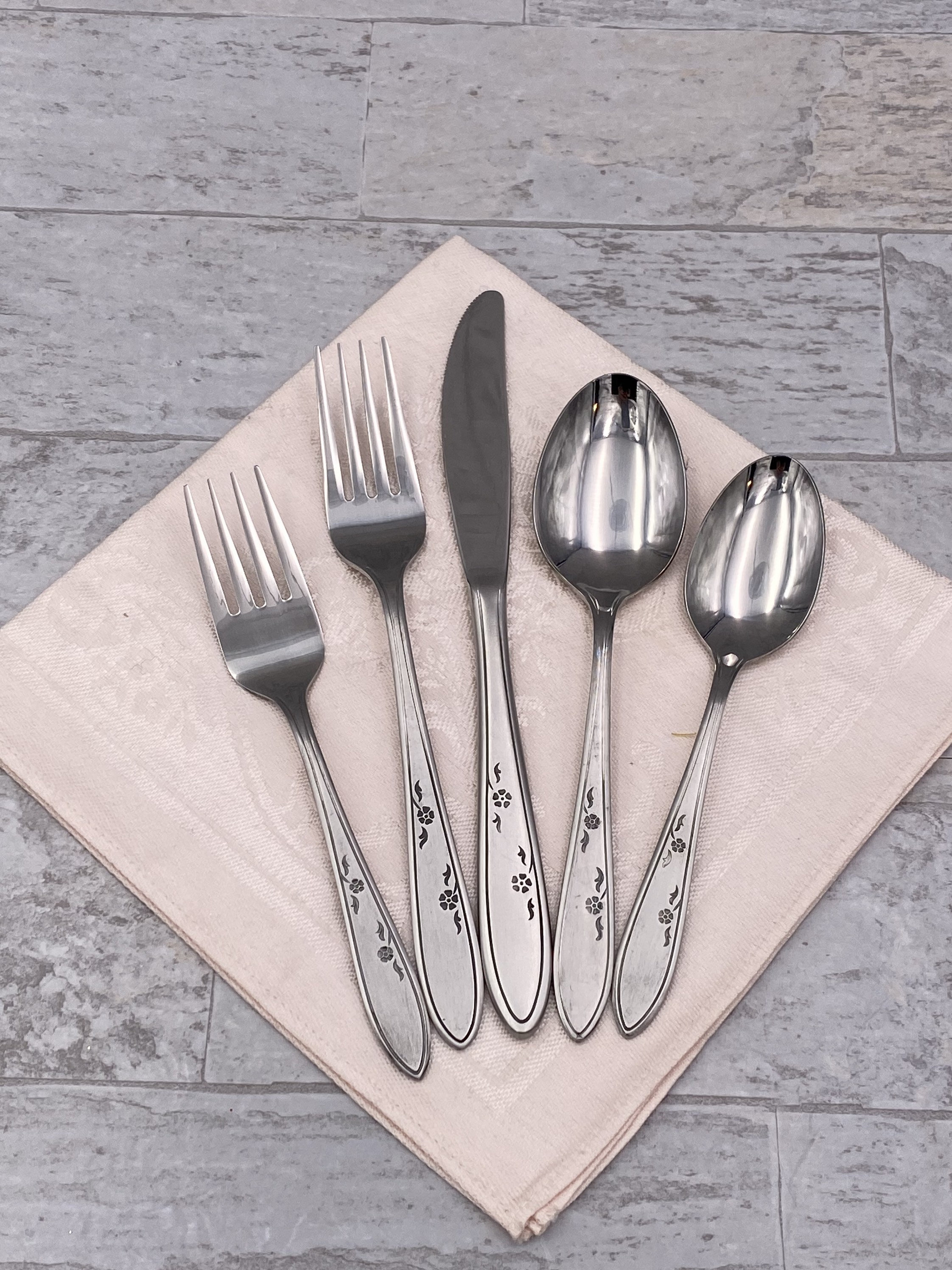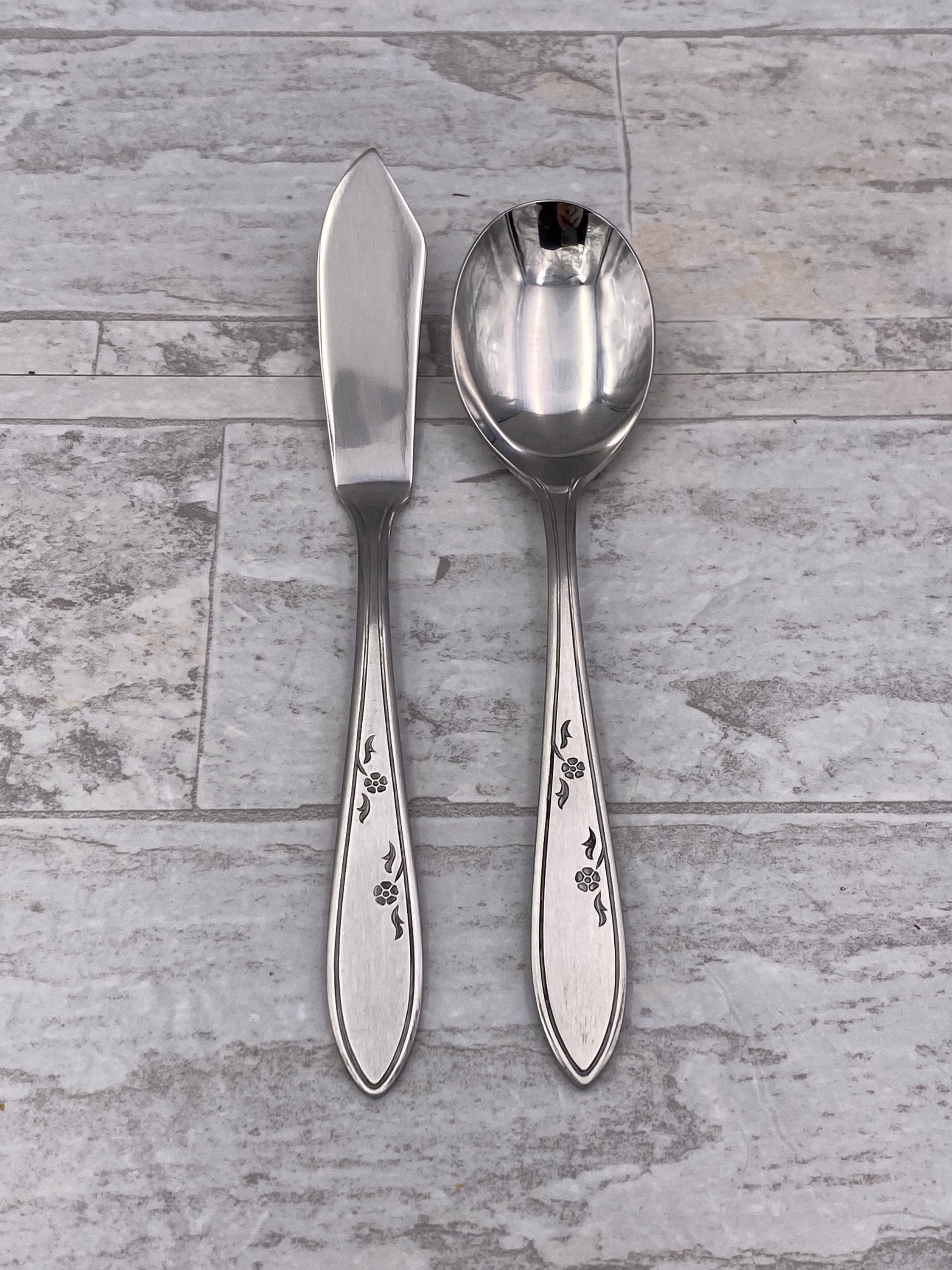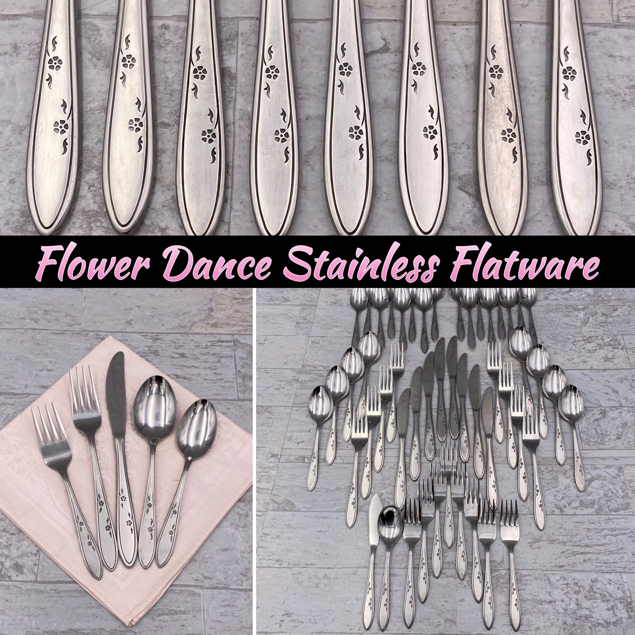 This is a Set of Vintage Stainless Flatware by Imperial Stainless. It is in the pattern called Flower Dance with a classically designed floral handle of black floral accents. The finish has a satin finish. In Excellent Unused Vintage condition. New in the original packaging. I opened it for the pictures.